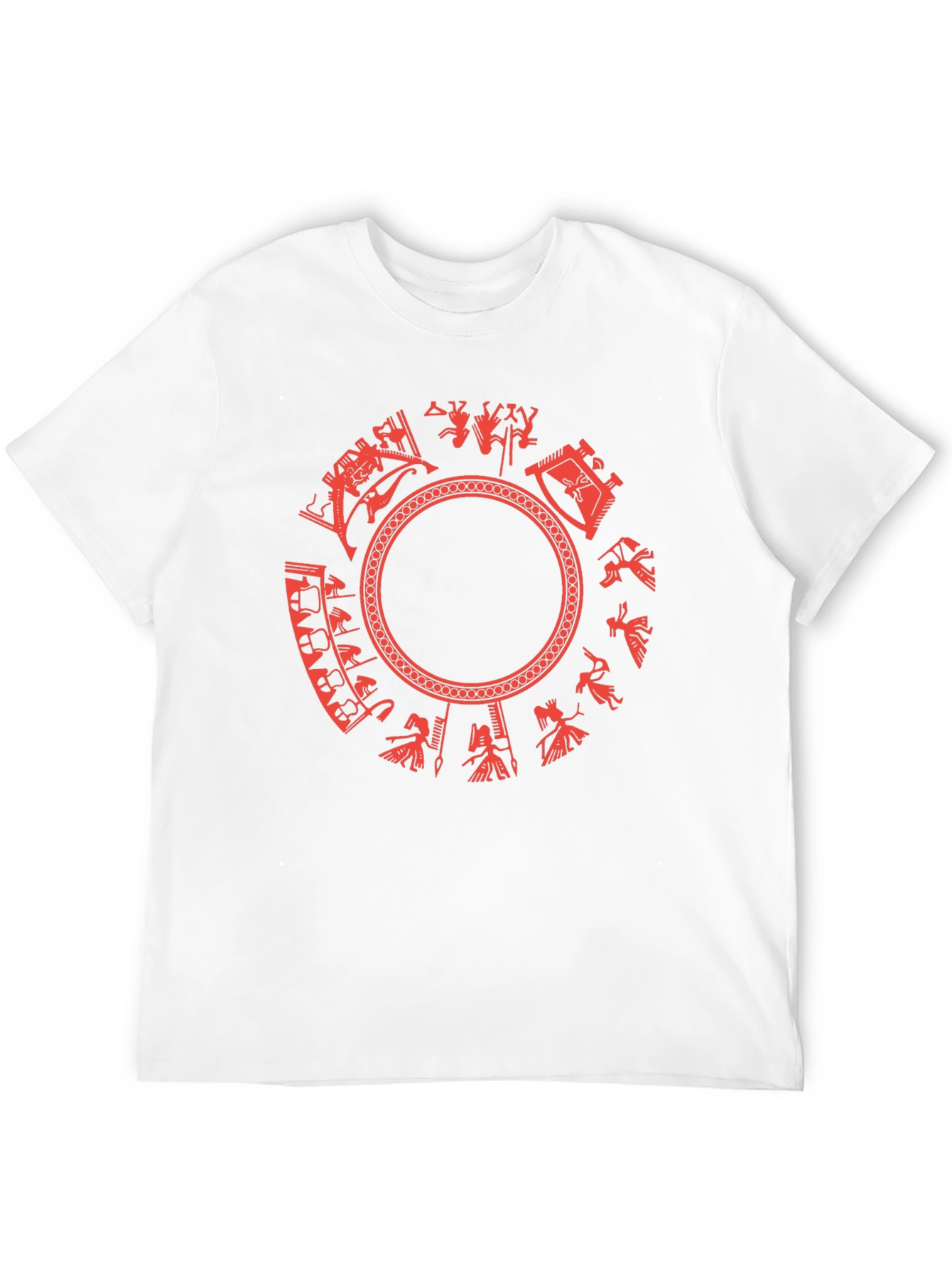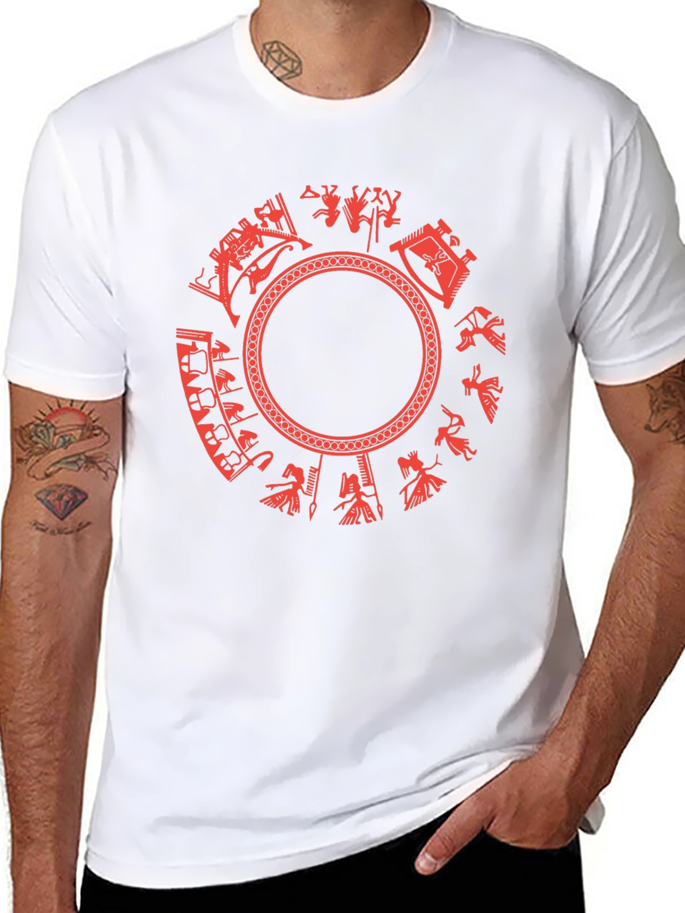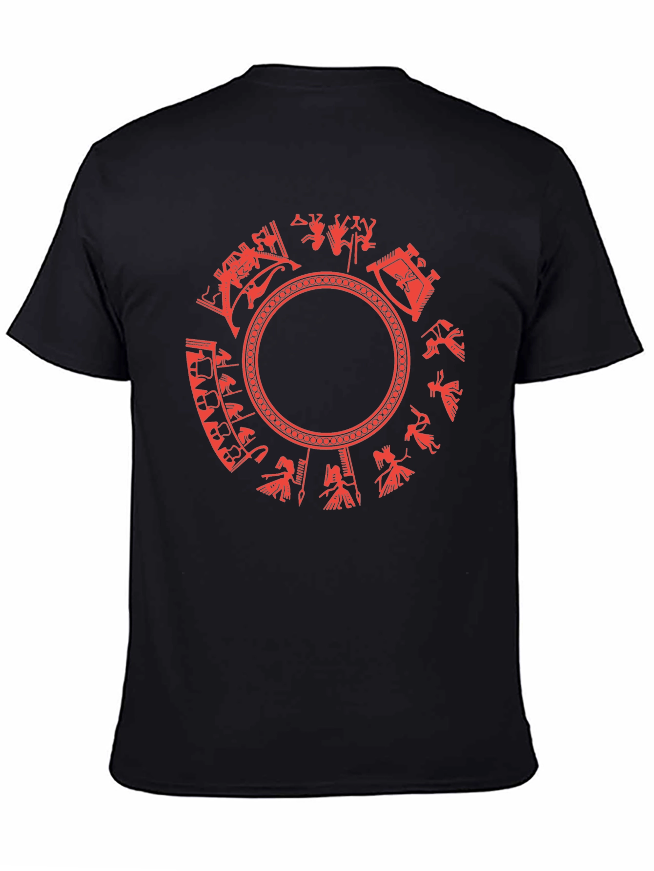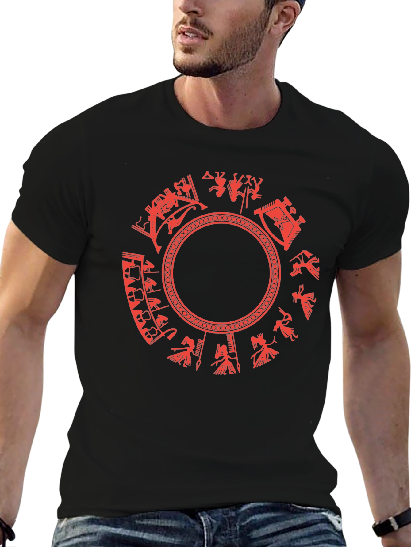 Show off a unique look with this stylish black t-shirt. The tee features a bold, Aztec-inspired circular graphic in a striking red print on the front. The design includes various figures and symbols arranged around an inner circle. Made from what appears to be soft, breathable cotton, this tee offers both comfort and durability. The classic fit and short sleeves make it perfect for everyday wear. This eye-catching t-shirt is sure to turn heads and makes a great addition to any casual wardrobe. Ideal for expressing individuality and love for ancient cultures.