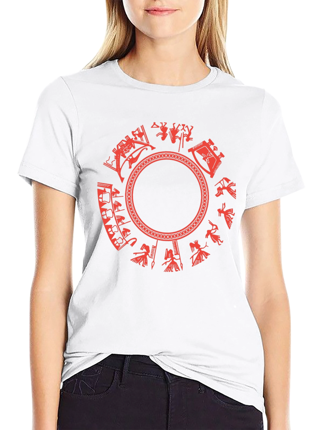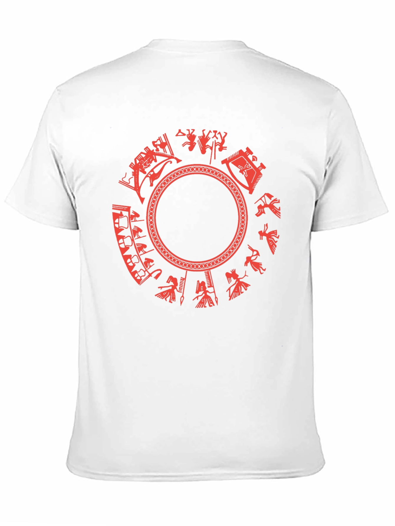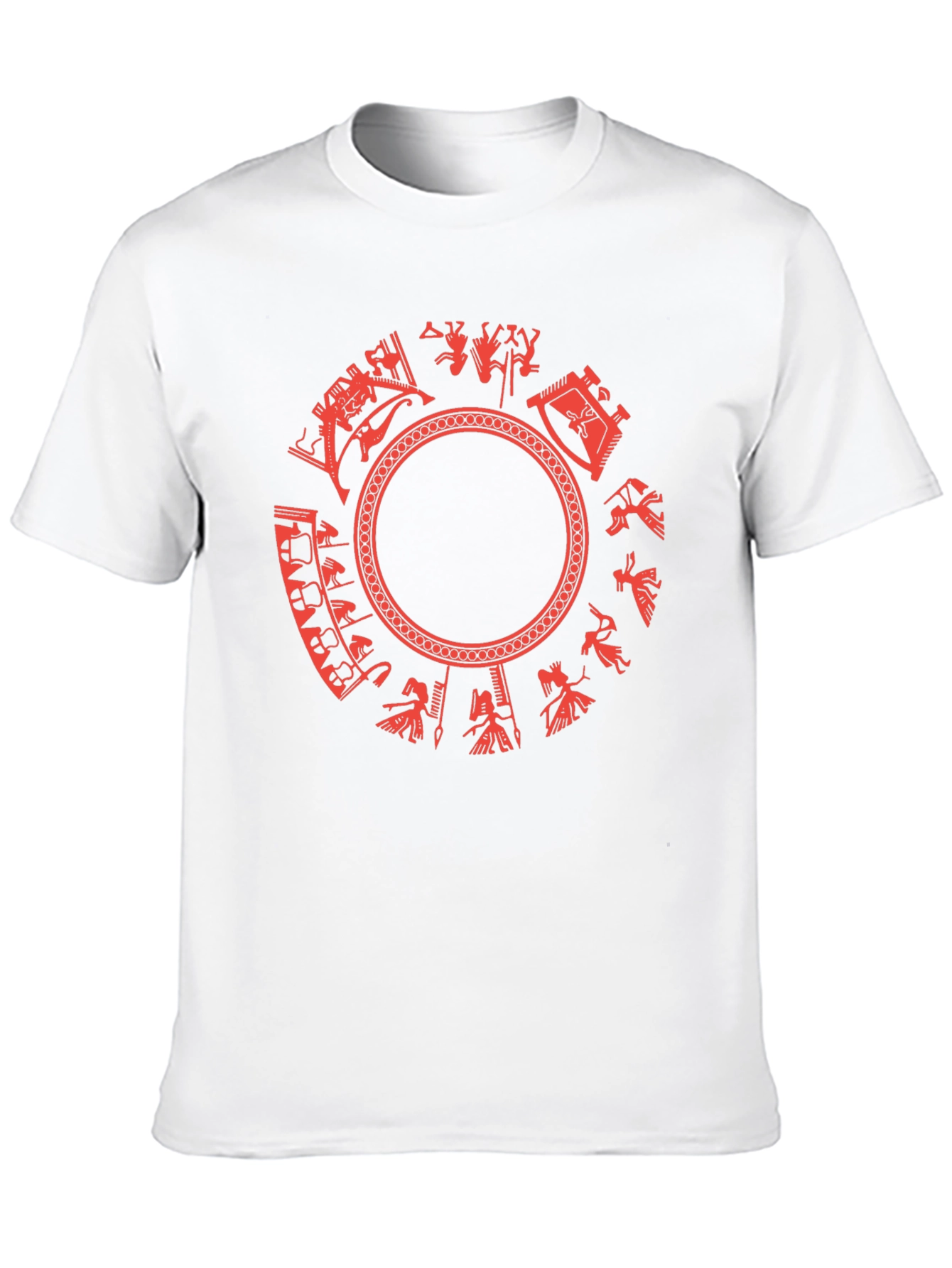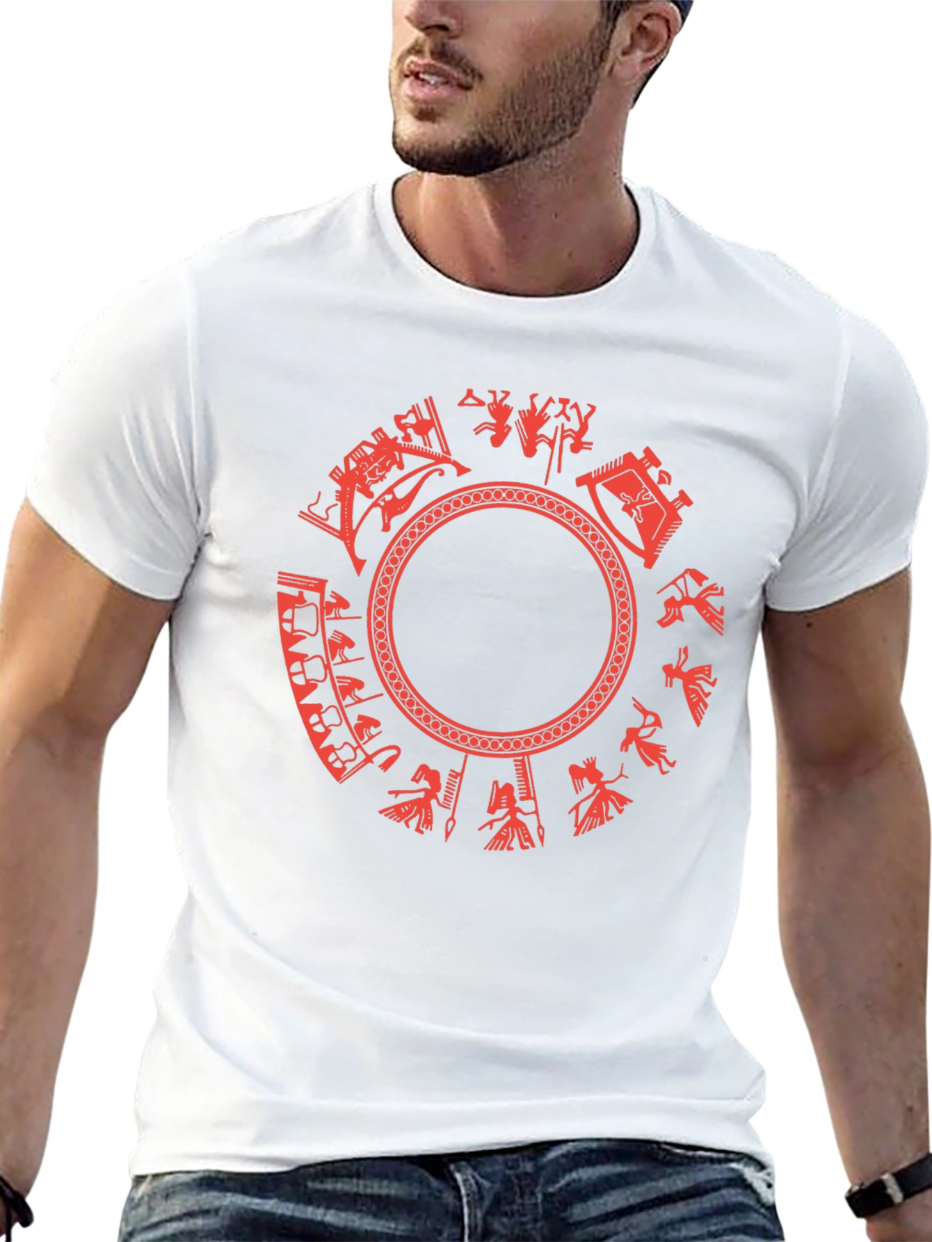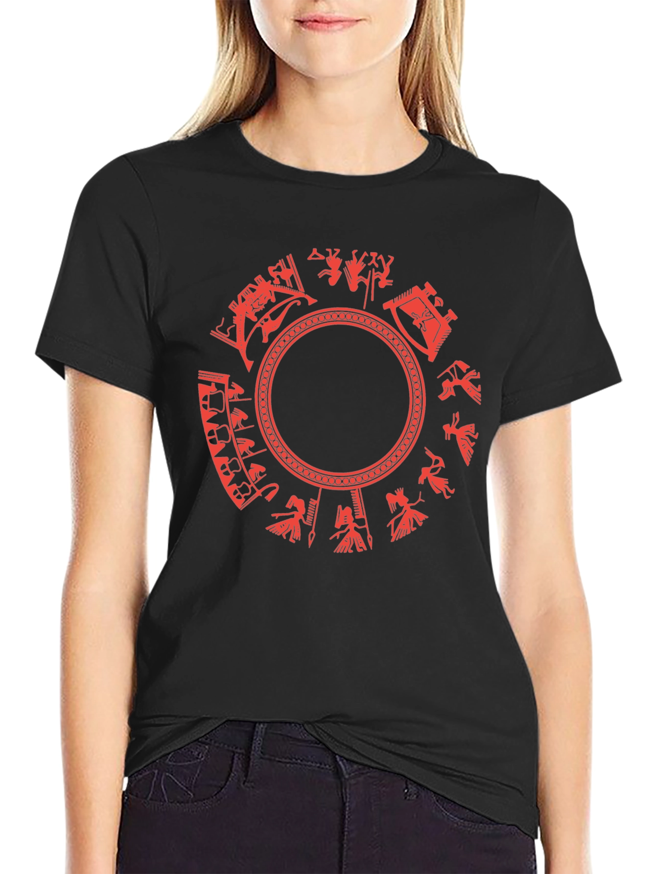 Show off a unique look with this stylish black t-shirt. The tee features a bold, Aztec-inspired circular graphic in a striking red print on the front. The design includes various figures and symbols arranged around an inner circle. Made from what appears to be soft, breathable cotton, this tee offers both comfort and durability. The classic fit and short sleeves make it perfect for everyday wear. This eye-catching t-shirt is sure to turn heads and makes a great addition to any casual wardrobe. Ideal for expressing individuality and love for ancient cultures.