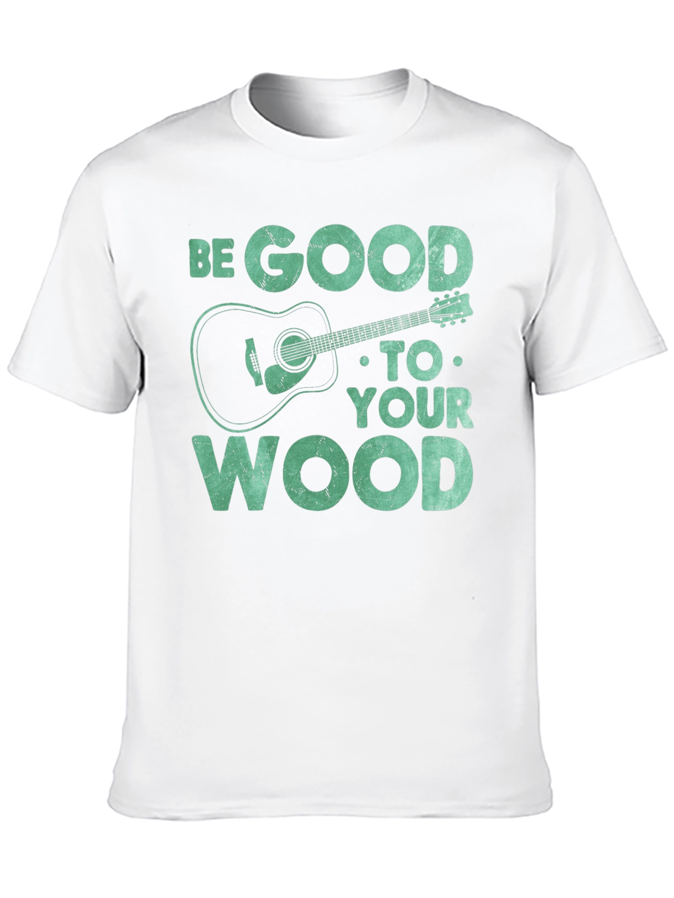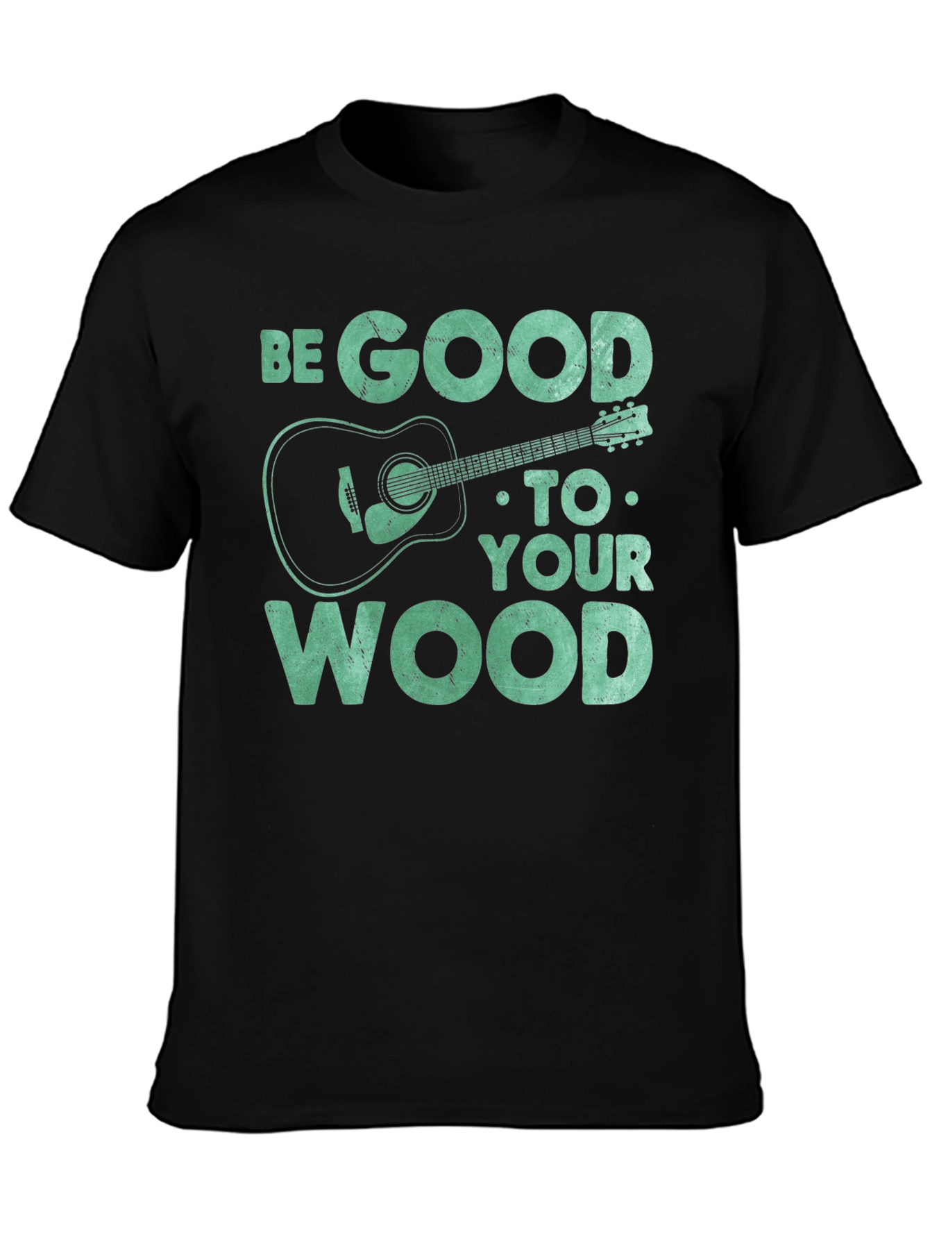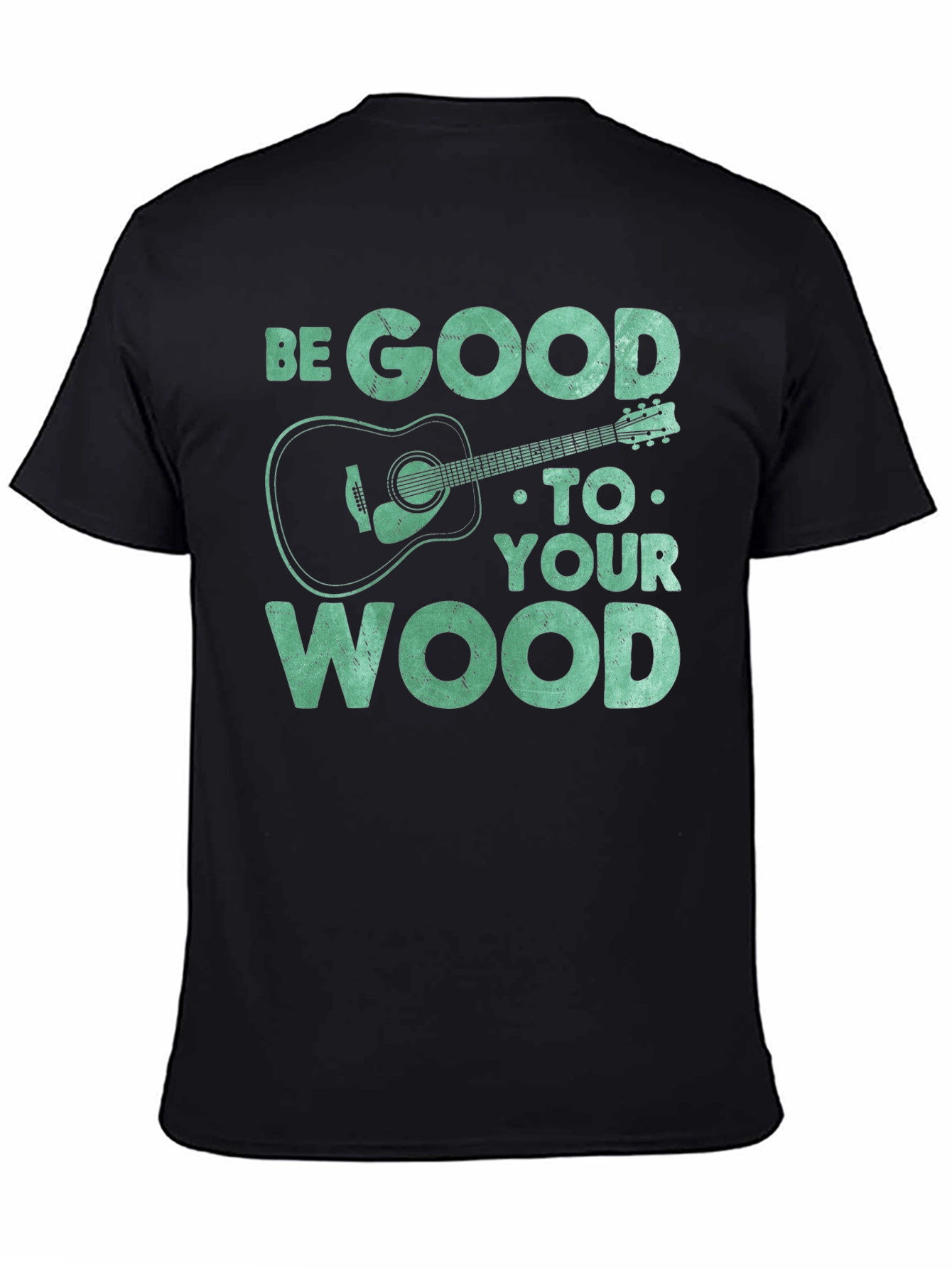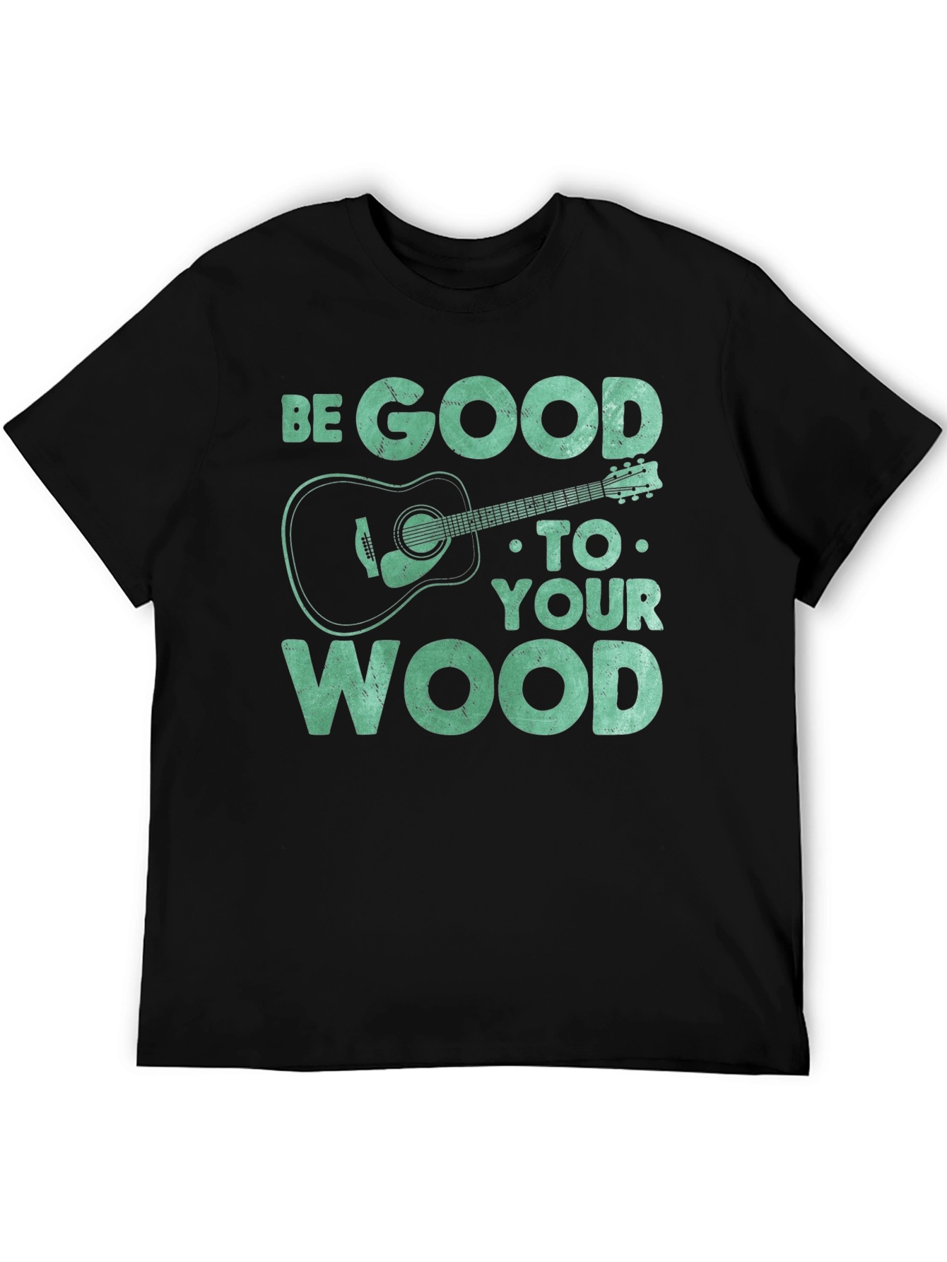 Show off your love for music with this unique graphic tee. The t-shirt features the text "BE GOOD TO YOUR WOOD" in a distressed font, along with a stylized acoustic guitar illustration. The design gives off a playful vibe for guitar enthusiasts. Constructed from a soft, breathable fabric, this short-sleeved shirt ensures all-day comfort. The black color provides a classic look that pairs well with any outfit. Perfect for casual wear, music events, or as a gift for the guitar lover in your life. Add a touch of musical style to your wardrobe with this one-of-a-kind t-shirt!