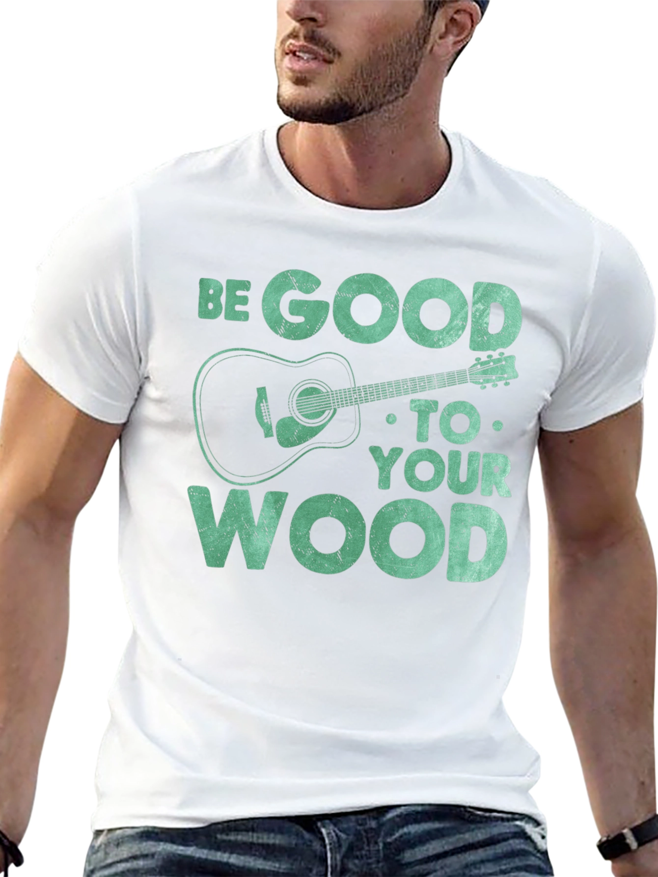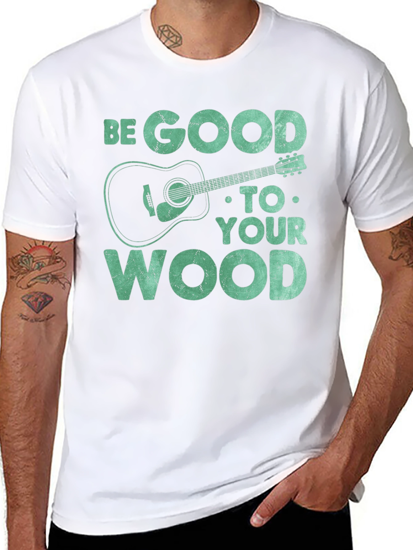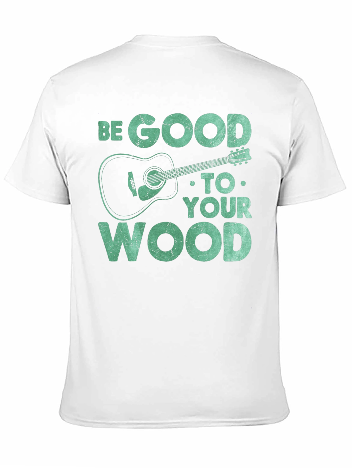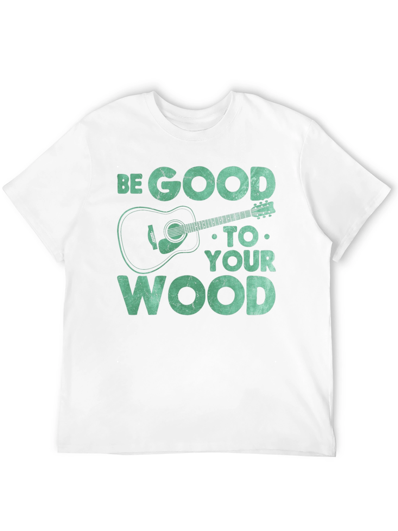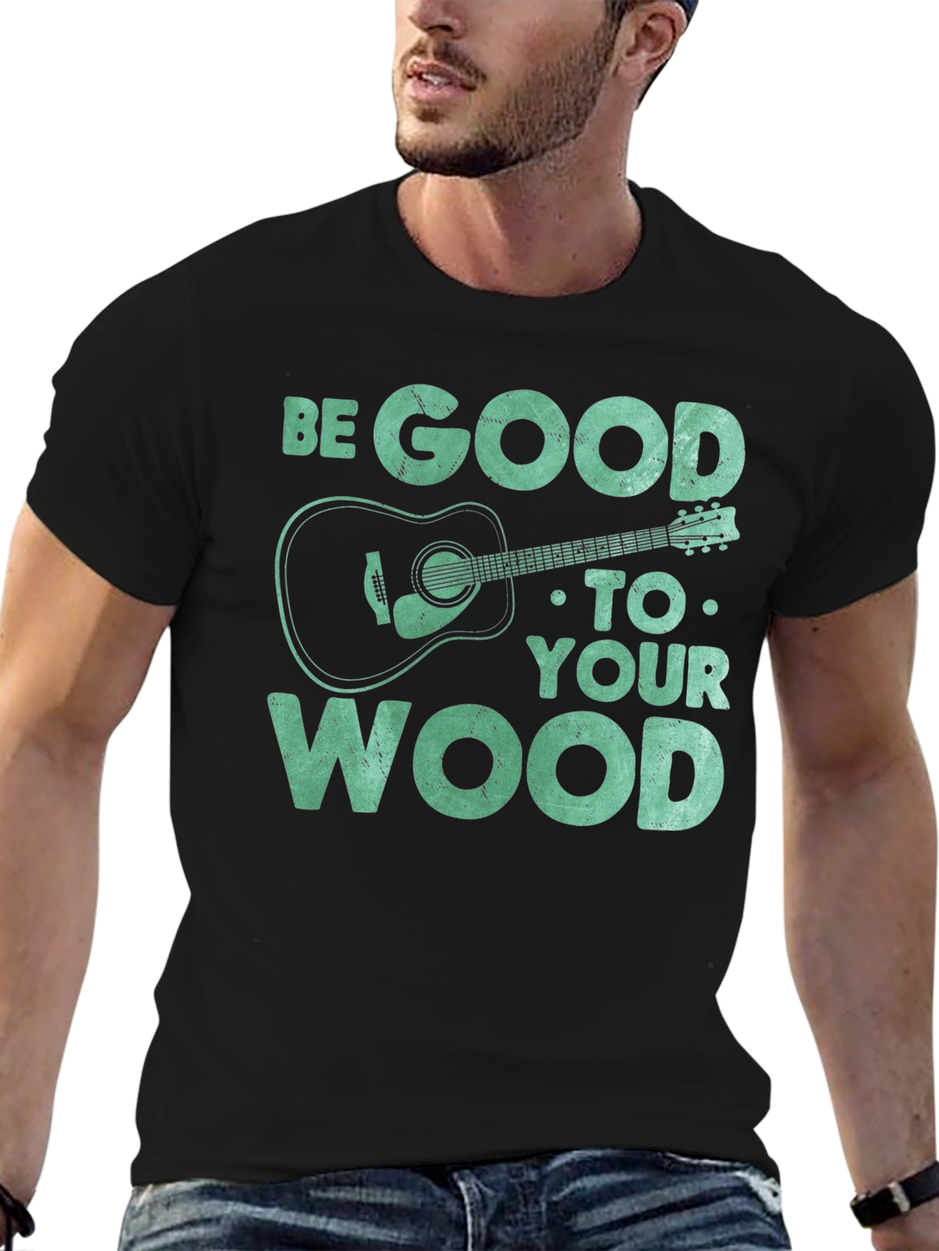 Show off your love for music with this unique graphic tee. The t-shirt features the text "BE GOOD TO YOUR WOOD" in a distressed font, along with a stylized acoustic guitar illustration. The design gives off a playful vibe for guitar enthusiasts. Constructed from a soft, breathable fabric, this short-sleeved shirt ensures all-day comfort. The black color provides a classic look that pairs well with any outfit. Perfect for casual wear, music events, or as a gift for the guitar lover in your life. Add a touch of musical style to your wardrobe with this one-of-a-kind t-shirt!
