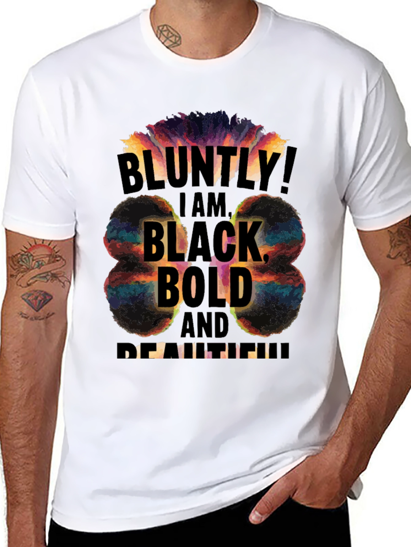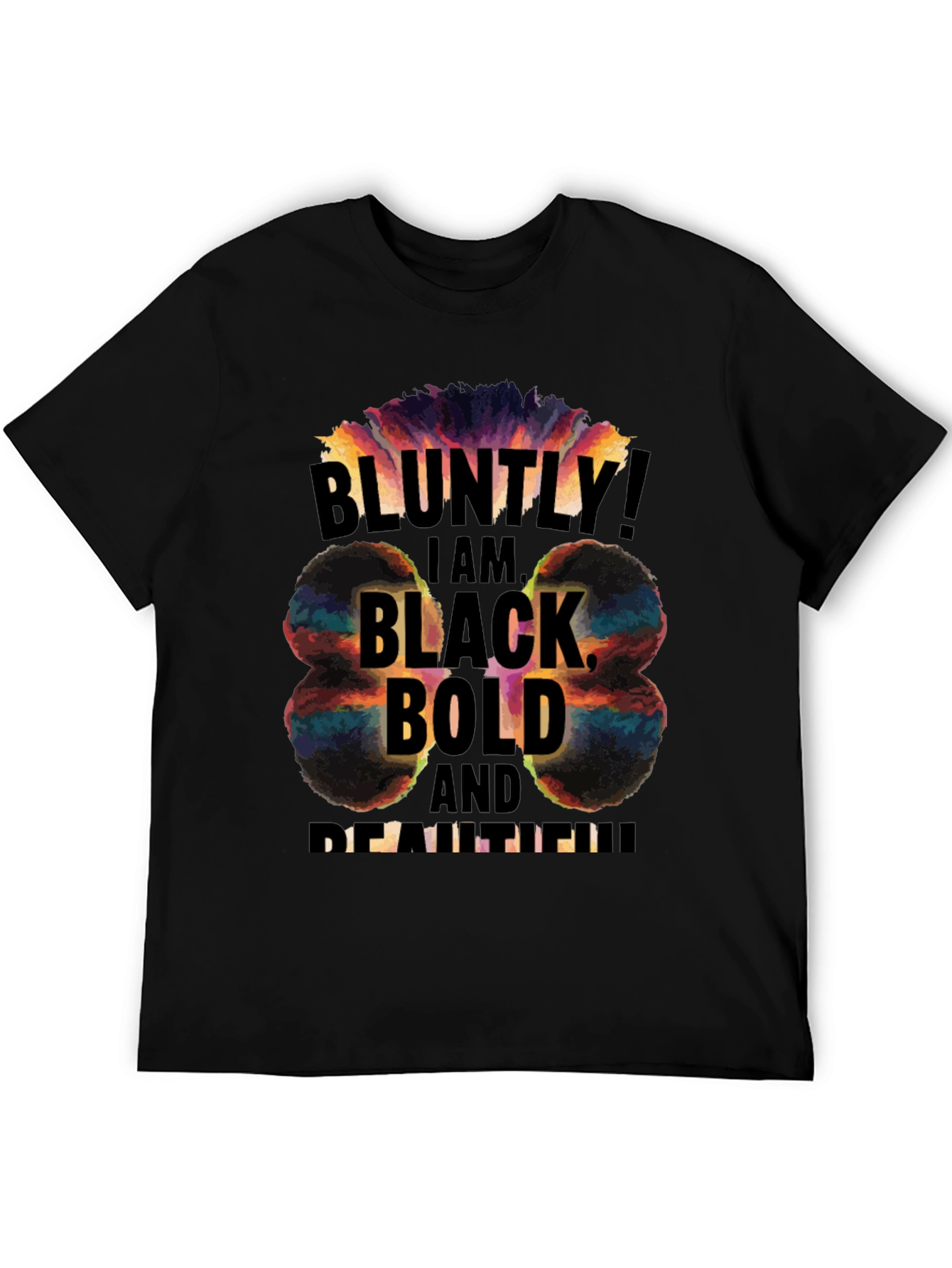 Express yourself with this bold graphic t-shirt. The design features the phrase "Bluntly! I am Black, Bold and Beautiful" in a stylized text. The t-shirt is black, providing a striking backdrop for the colorful graphic. Made from comfortable fabric, this tee is perfect for everyday wear. Show off your pride and confidence with this statement piece. Ideal for casual outings, social events, or simply making a statement wherever you go.