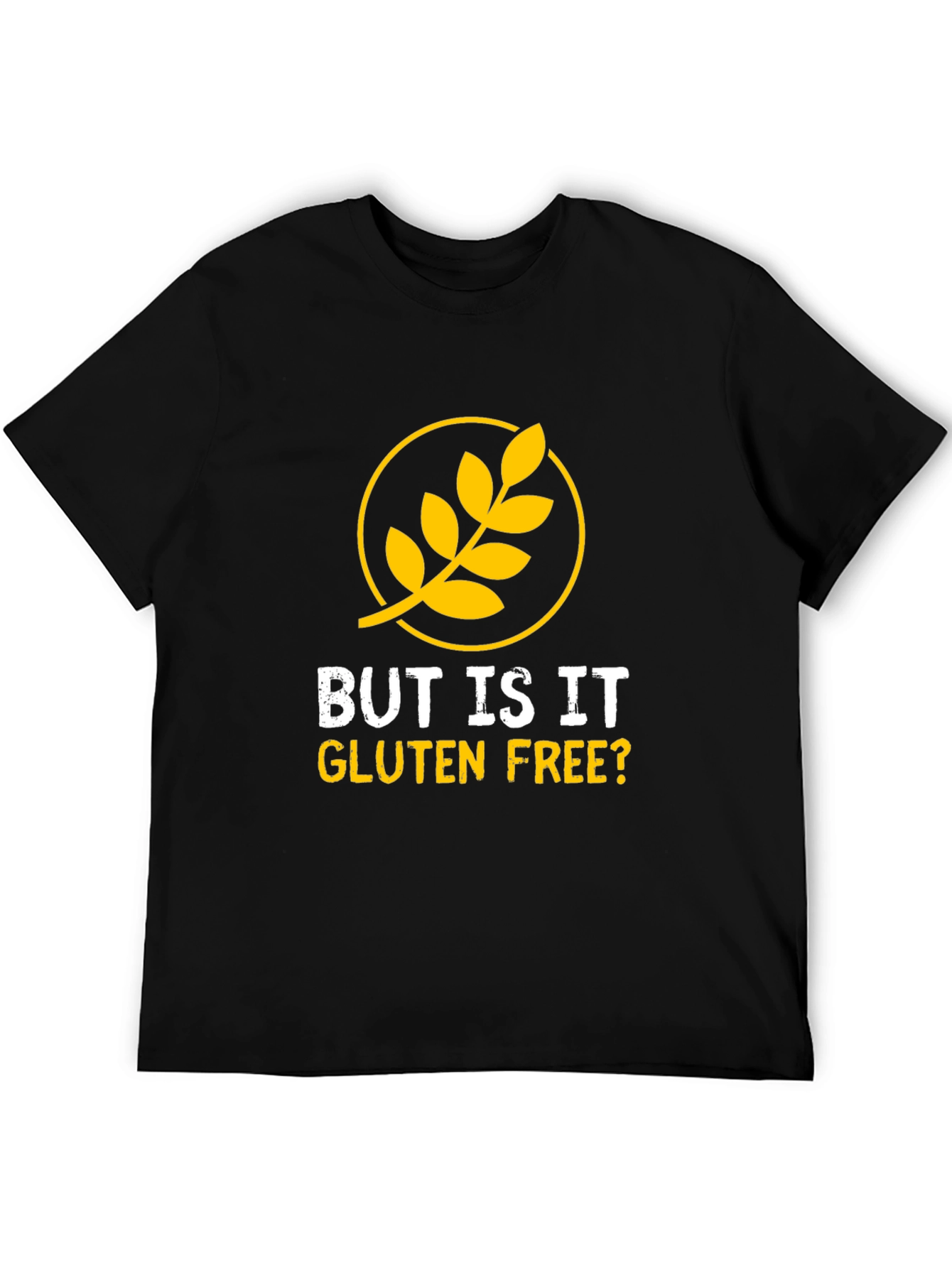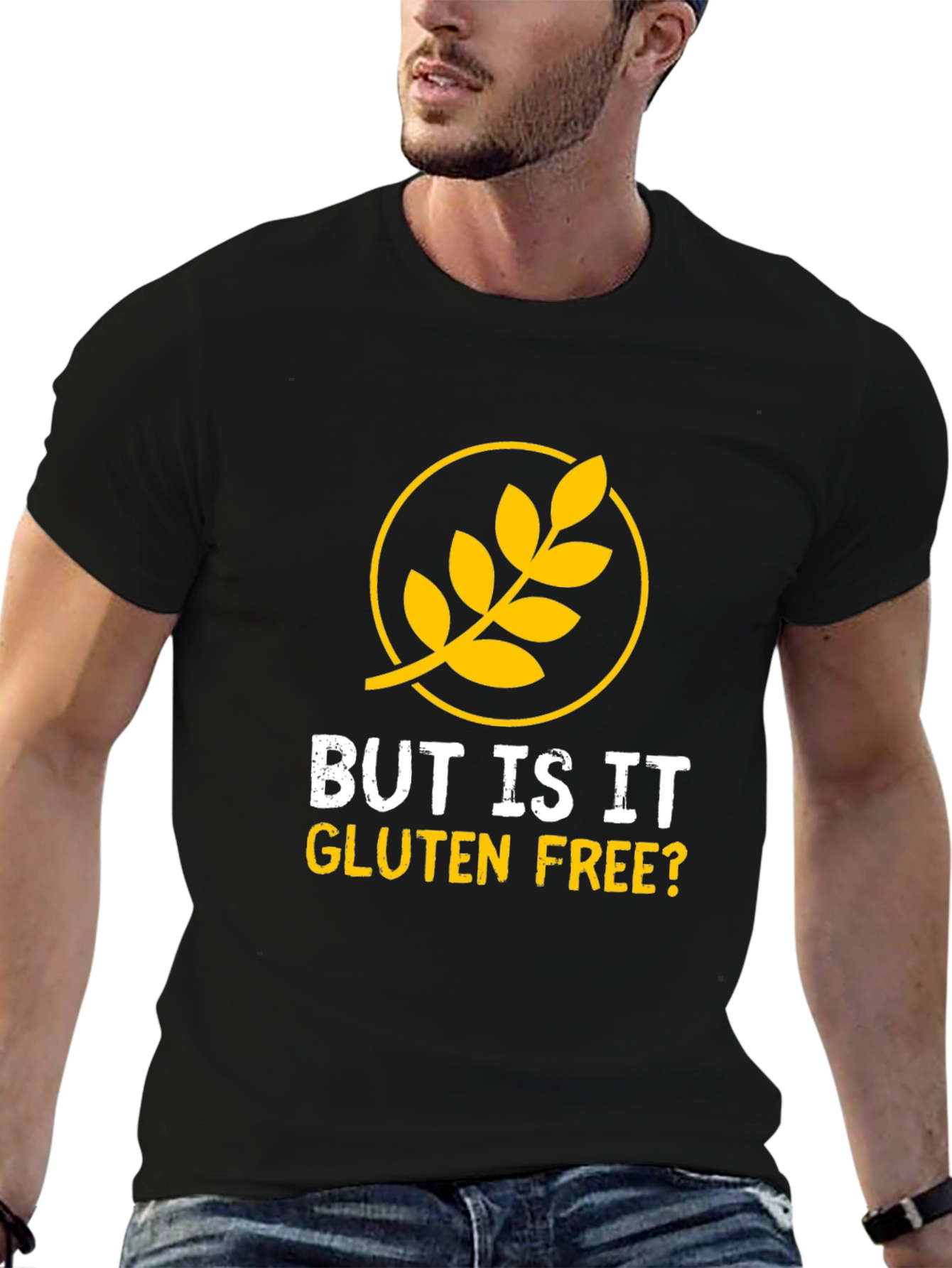 This classic black t-shirt features a humorous and relatable design for those with gluten sensitivities or dietary restrictions. The shirt displays the phrase "BUT IS IT GLUTEN FREE?" in a combination of white and yellow block lettering, complemented by a wheat stalk design enclosed in a yellow circle. Made from what appears to be a soft and comfortable cotton blend, this tee is perfect for everyday wear. Show off your dietary awareness with this stylish and conversation-starting t-shirt. Ideal for casual outings, grocery shopping, or hanging out with friends, this t-shirt combines comfort with a touch of lightheartedness.