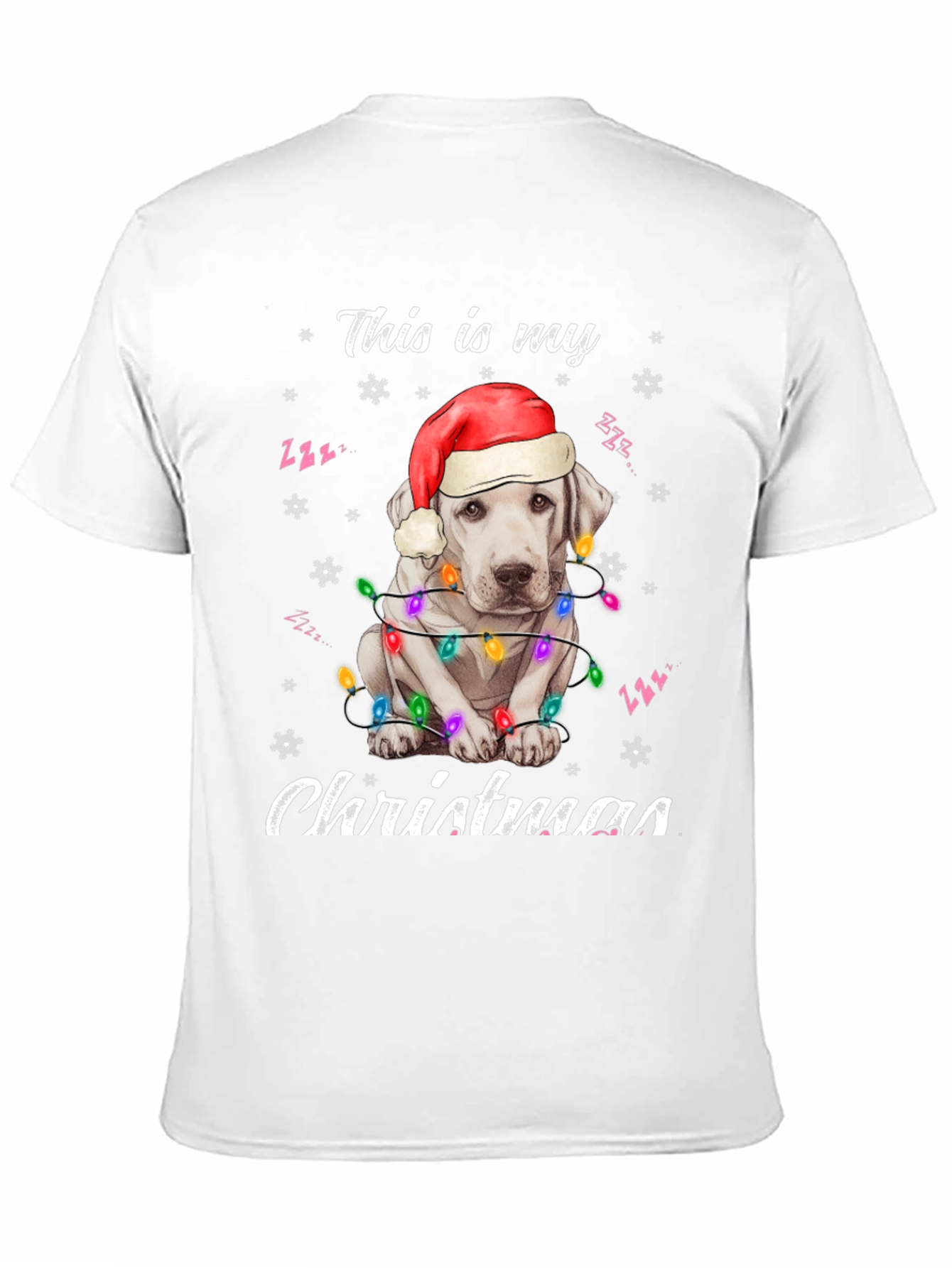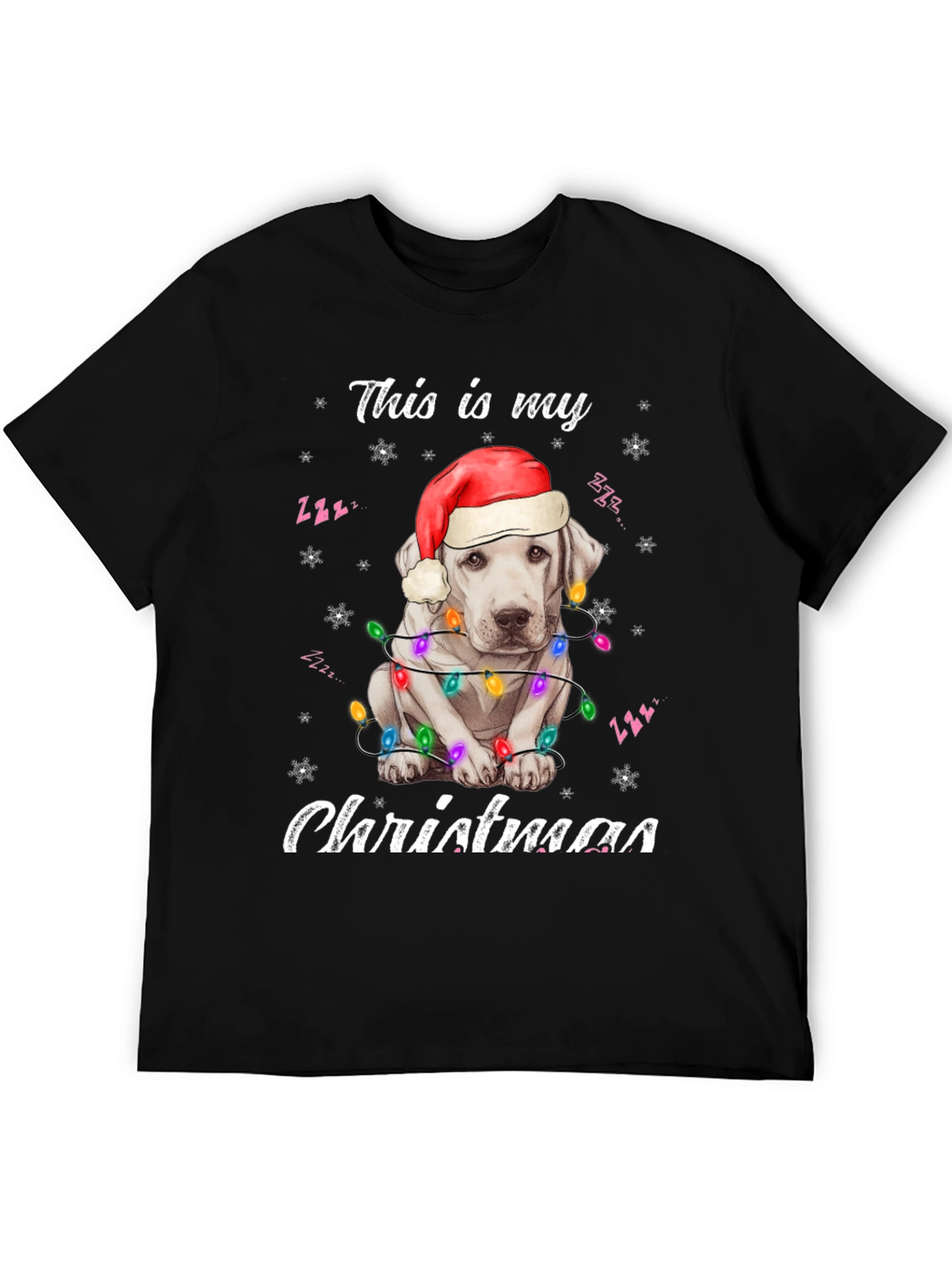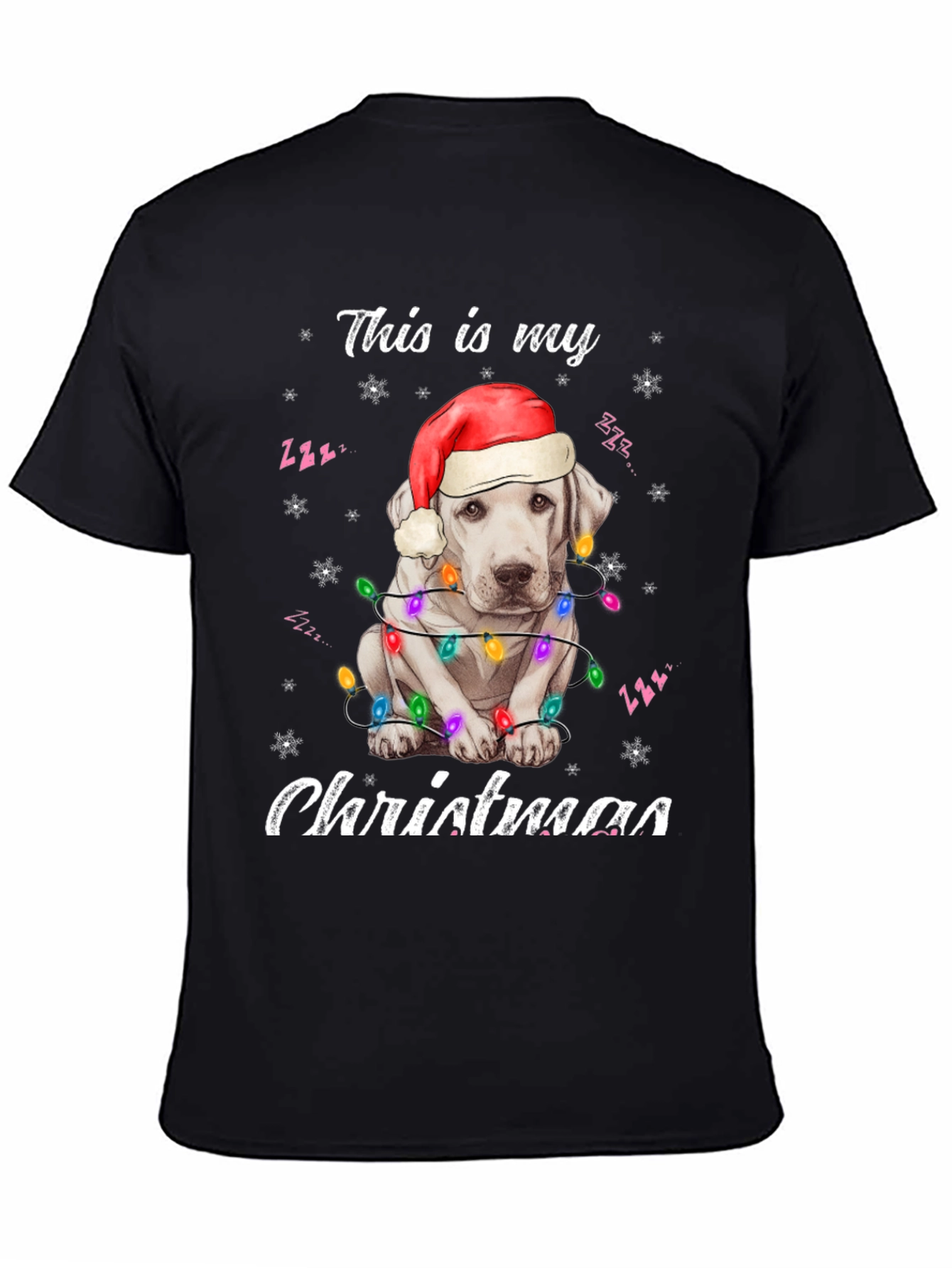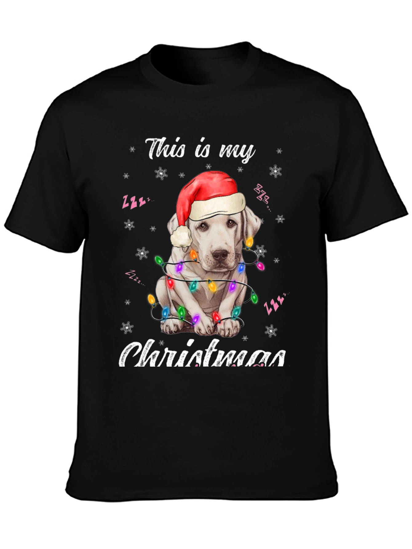 Spread holiday cheer with this adorable black t-shirt! The design features a cute white dog wearing a Santa hat and wrapped in colorful Christmas lights. "This is my Christmas" is playfully printed above and below the festive pup. Made from a soft, comfortable fabric, this tee is perfect for Christmas parties, family gatherings, or just lounging around the house during the holiday season. Show off your love for dogs and the holiday spirit with this eye-catching shirt. A must-have for dog lovers who want to add some festive flair to their wardrobe. Get yours today and make this Christmas extra special!