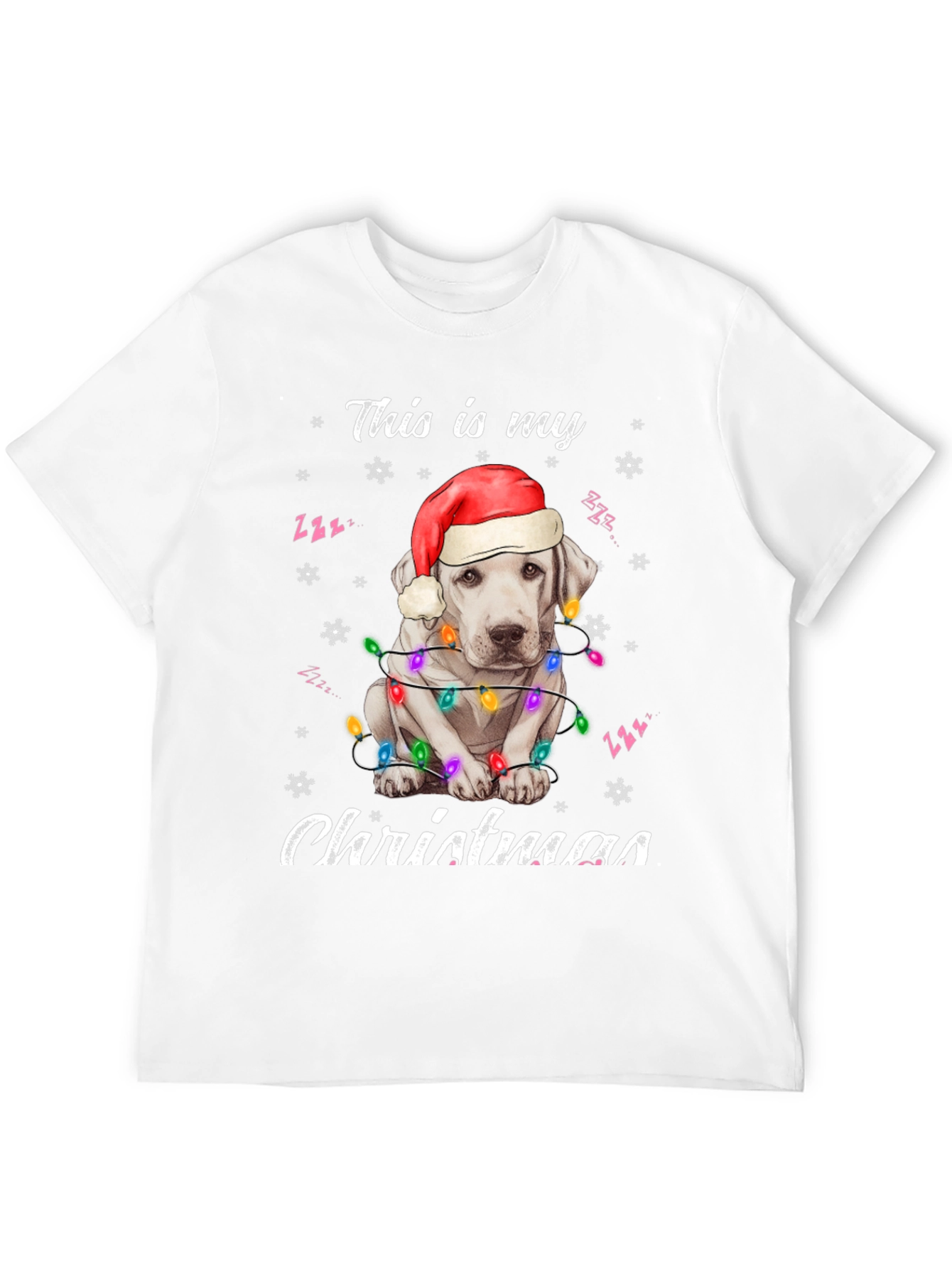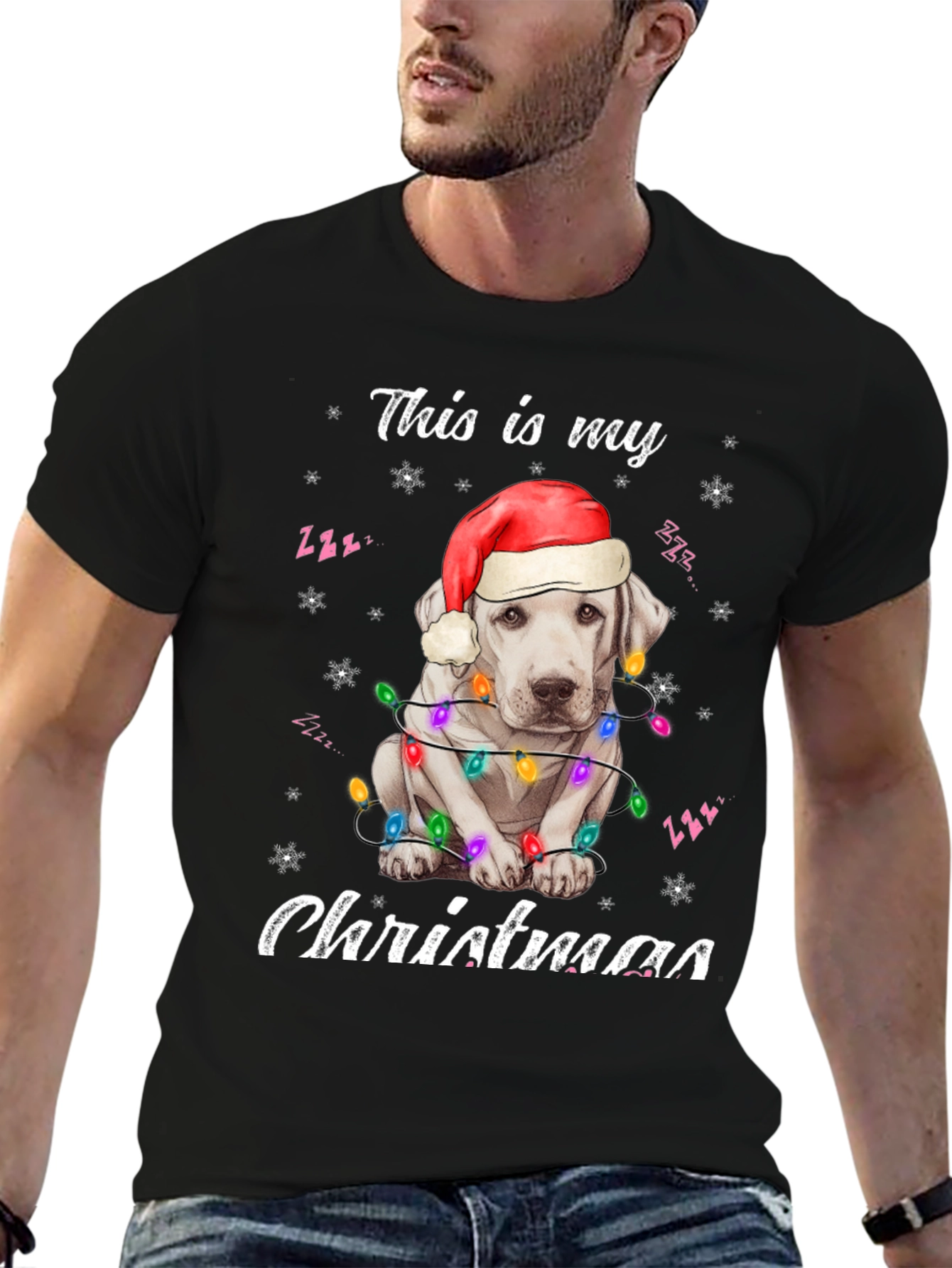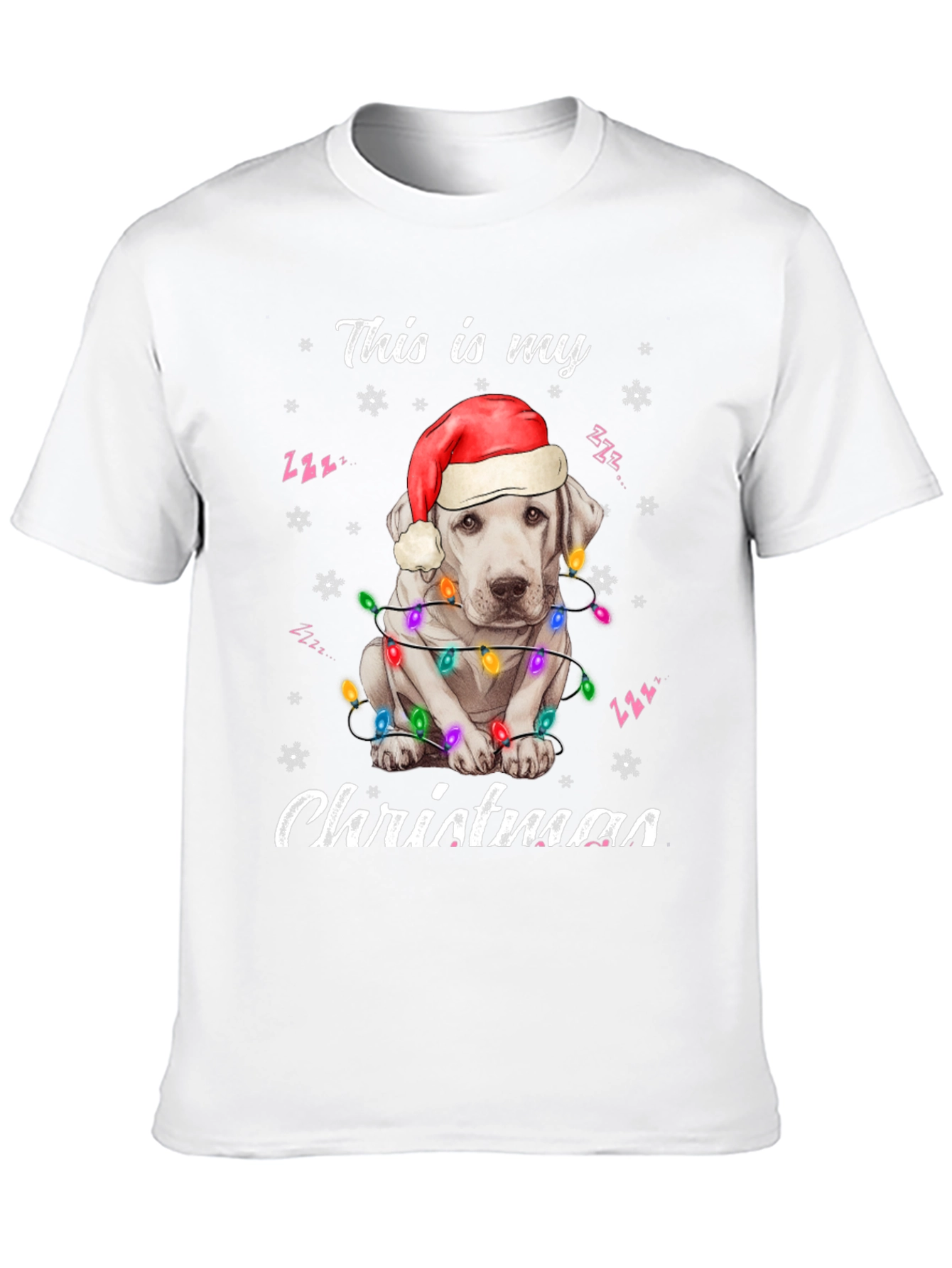 Spread holiday cheer with this adorable black t-shirt! The design features a cute white dog wearing a Santa hat and wrapped in colorful Christmas lights. "This is my Christmas" is playfully printed above and below the festive pup. Made from a soft, comfortable fabric, this tee is perfect for Christmas parties, family gatherings, or just lounging around the house during the holiday season. Show off your love for dogs and the holiday spirit with this eye-catching shirt. A must-have for dog lovers who want to add some festive flair to their wardrobe. Get yours today and make this Christmas extra special!