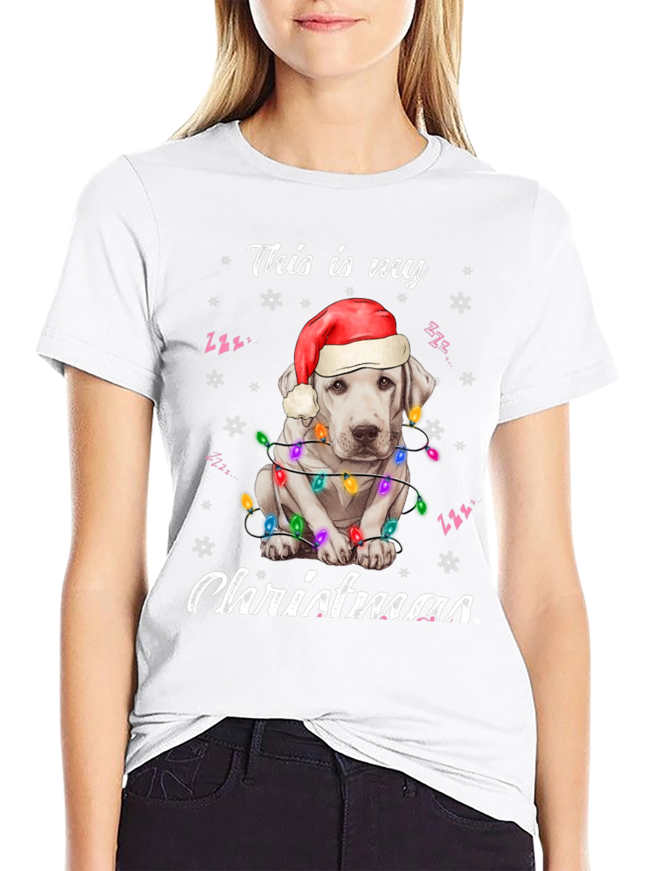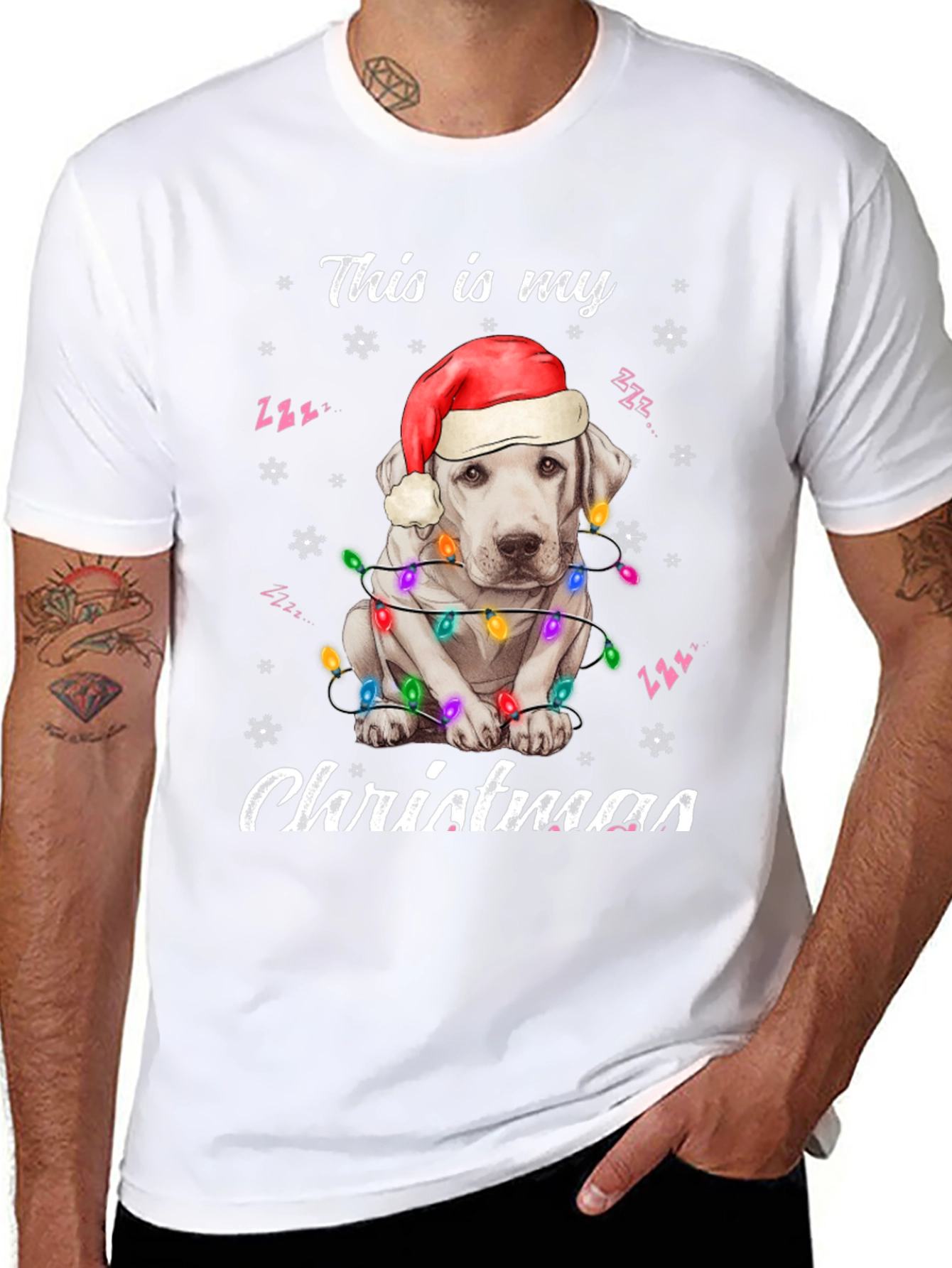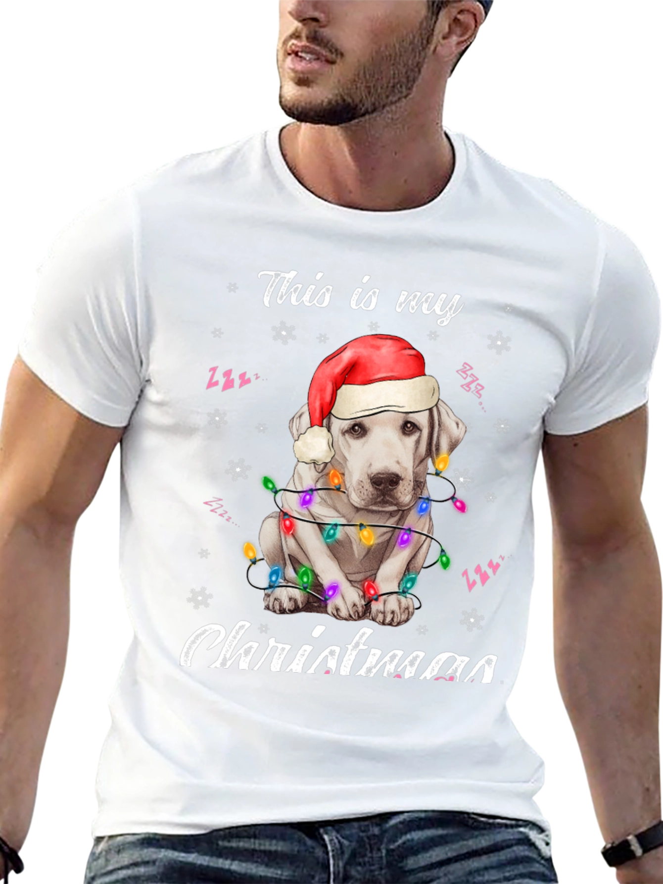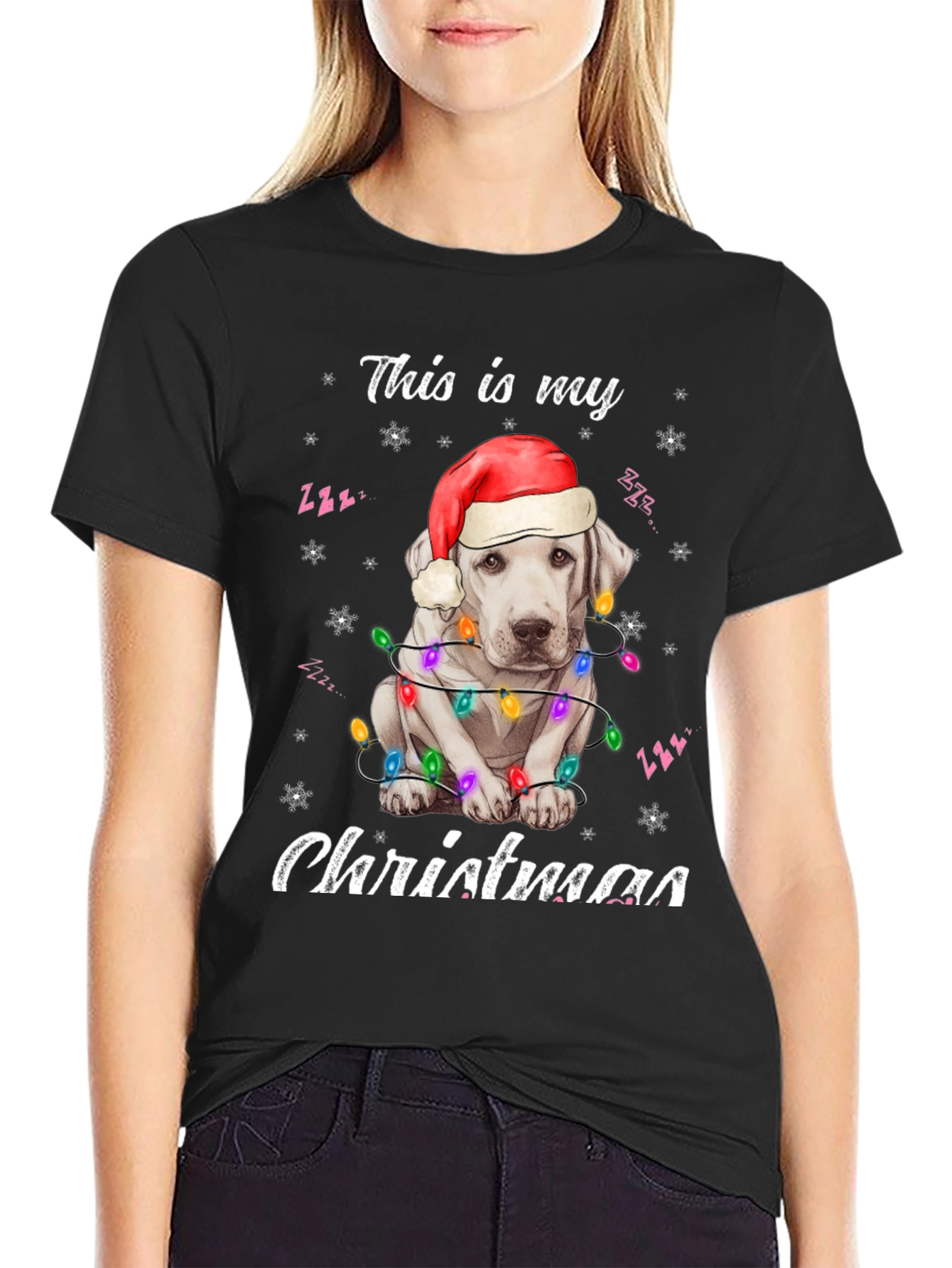 Spread holiday cheer with this adorable black t-shirt! The design features a cute white dog wearing a Santa hat and wrapped in colorful Christmas lights. "This is my Christmas" is playfully printed above and below the festive pup. Made from a soft, comfortable fabric, this tee is perfect for Christmas parties, family gatherings, or just lounging around the house during the holiday season. Show off your love for dogs and the holiday spirit with this eye-catching shirt. A must-have for dog lovers who want to add some festive flair to their wardrobe. Get yours today and make this Christmas extra special!