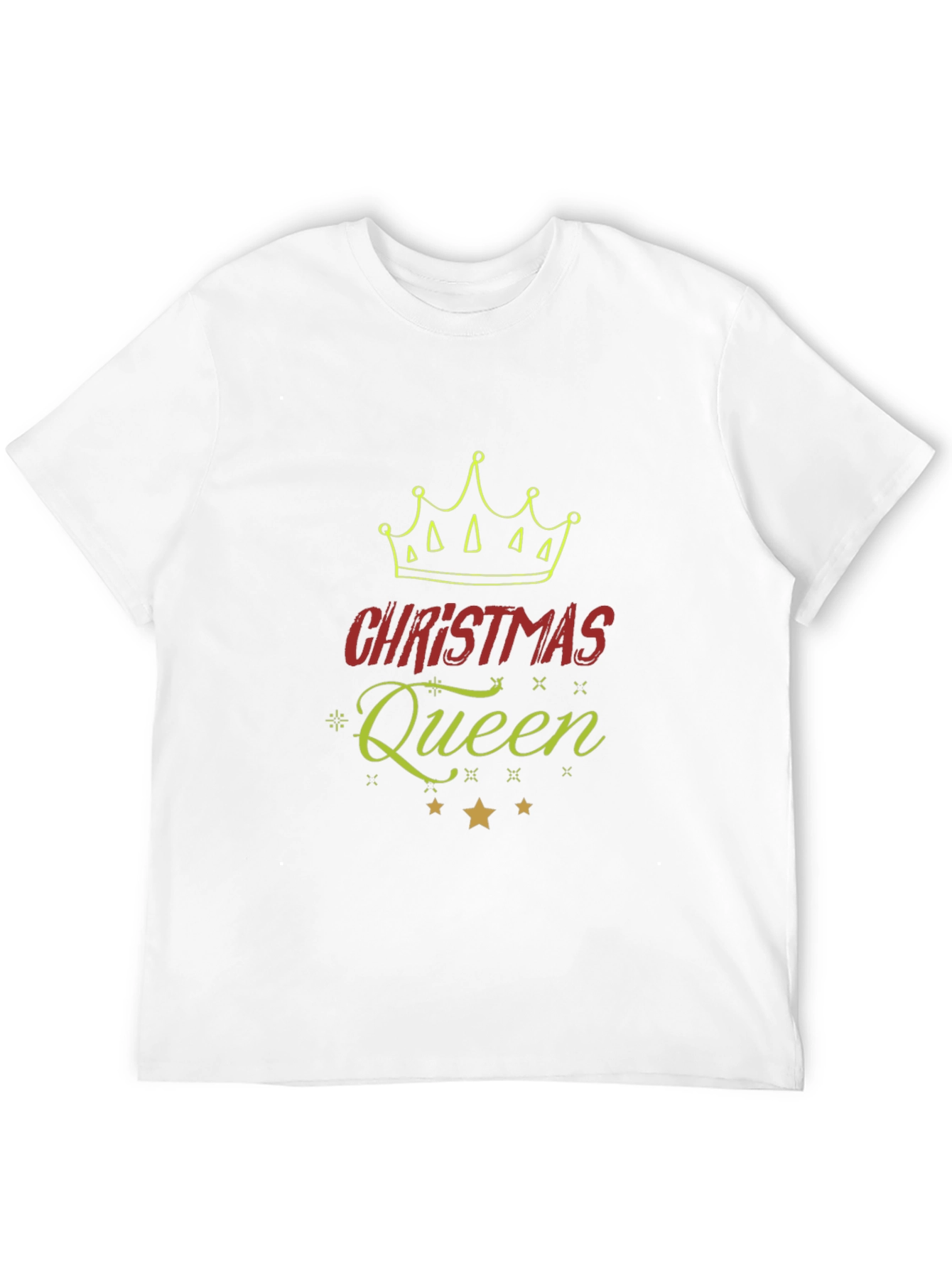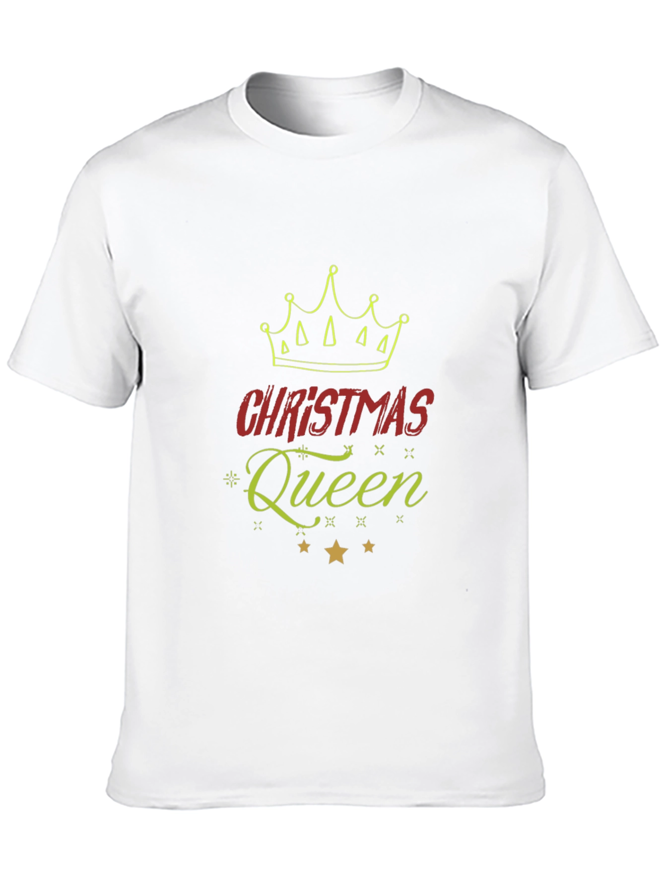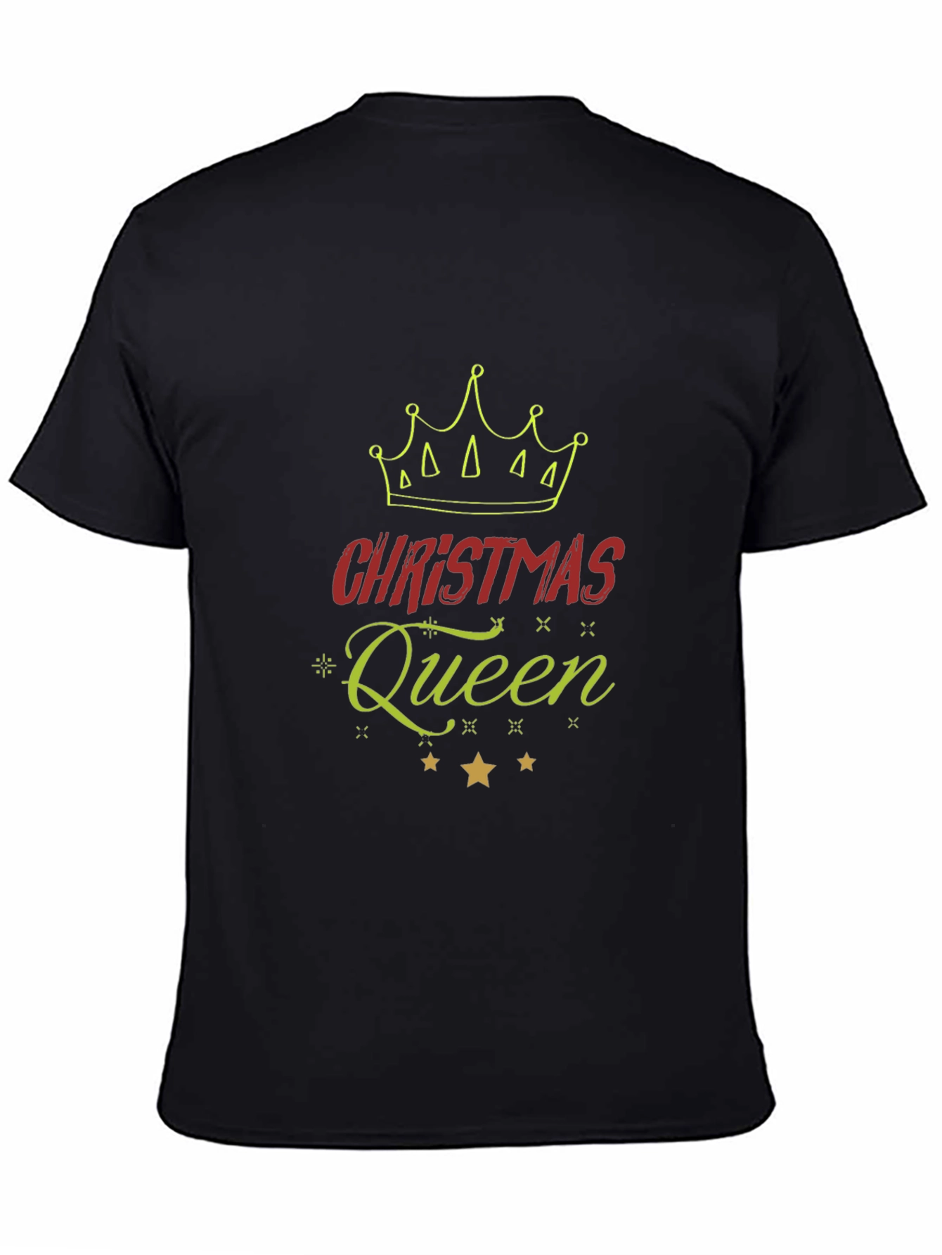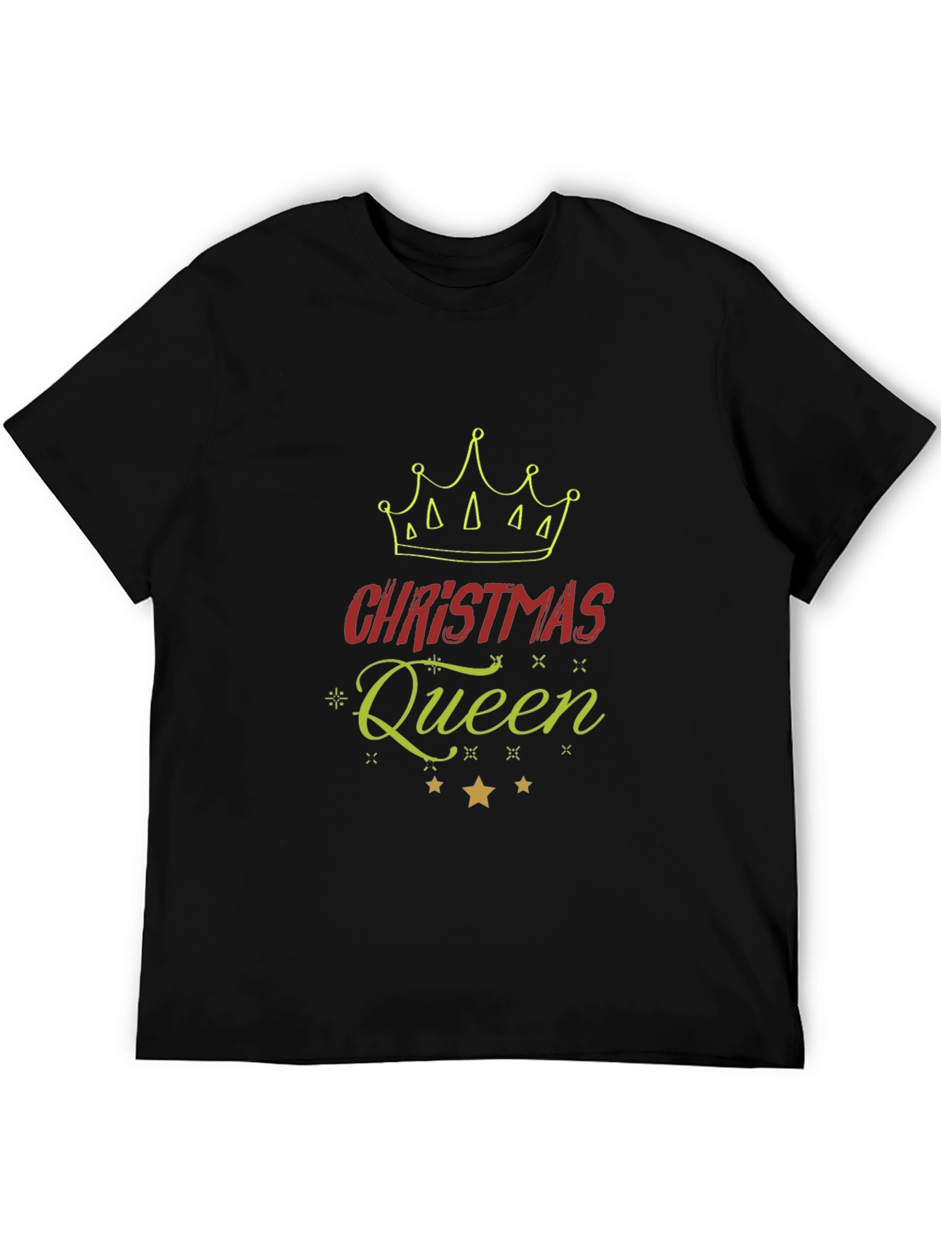 Show your holiday spirit with this festive Christmas Queen graphic tee. The black t-shirt features a vibrant design including a crown, the word "Christmas" in bold red letters, and "Queen" in an elegant, sparkling green script. Below the text are three shining gold stars. Made from comfortable, breathable fabric, this tee is perfect for Christmas parties, family gatherings, or casual holiday outings. Get ready to celebrate the season in style and declare yourself the Christmas Queen! This tee is a fun, fashionable way to embrace the holiday cheer.