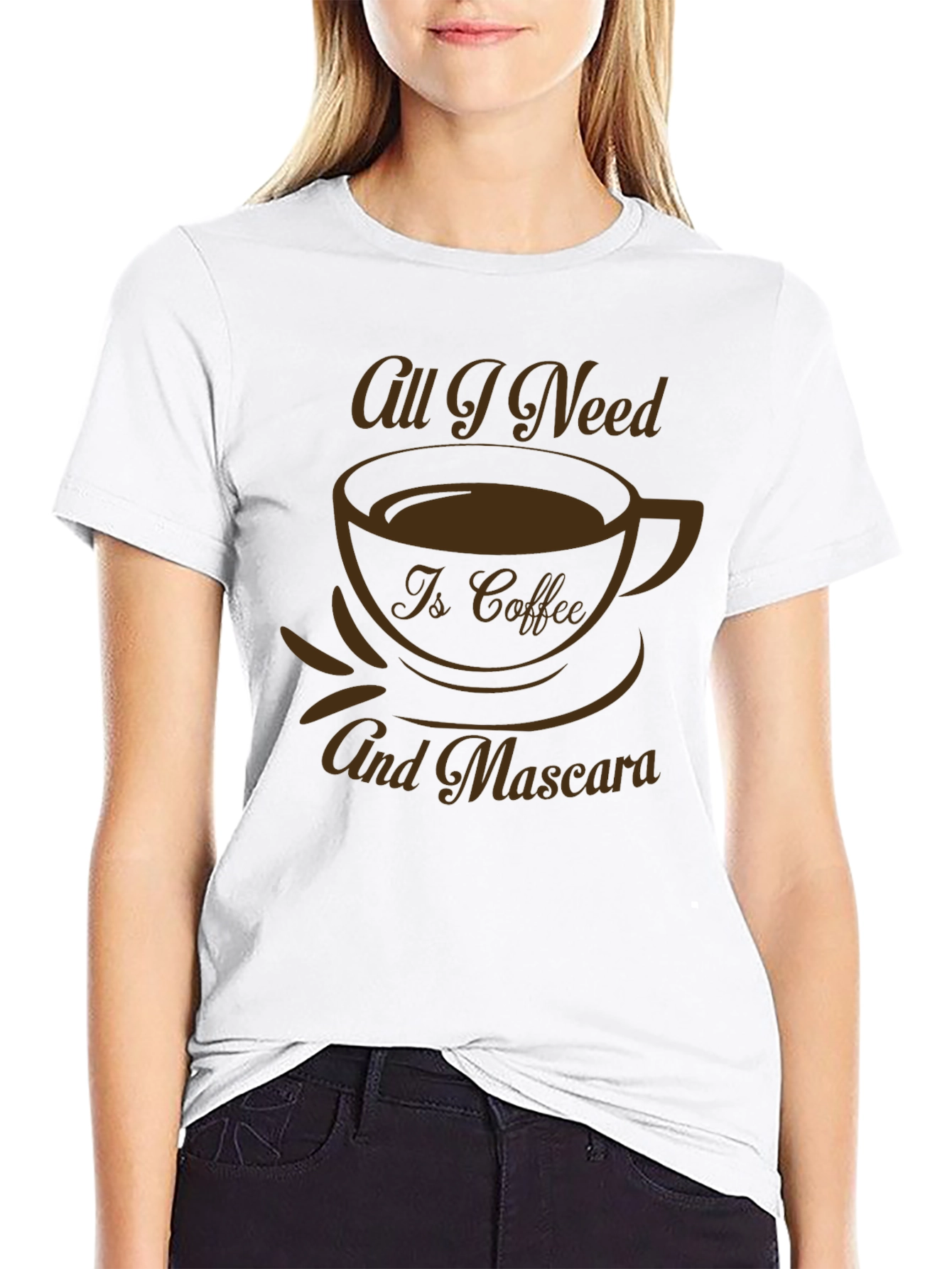 Start your day right with this stylish black graphic tee. Featuring a bold coffee cup design with the phrase "All I Need Is Coffee And Mascara", this shirt is perfect for coffee lovers and makeup enthusiasts. The brown design pops against the soft, breathable fabric for a comfortable fit all day long. Wear it casually with jeans, shorts, or dress it up with a skirt. Ideal for everyday wear, coffee dates, or a fun gift. Show off your love for coffee and beauty!
