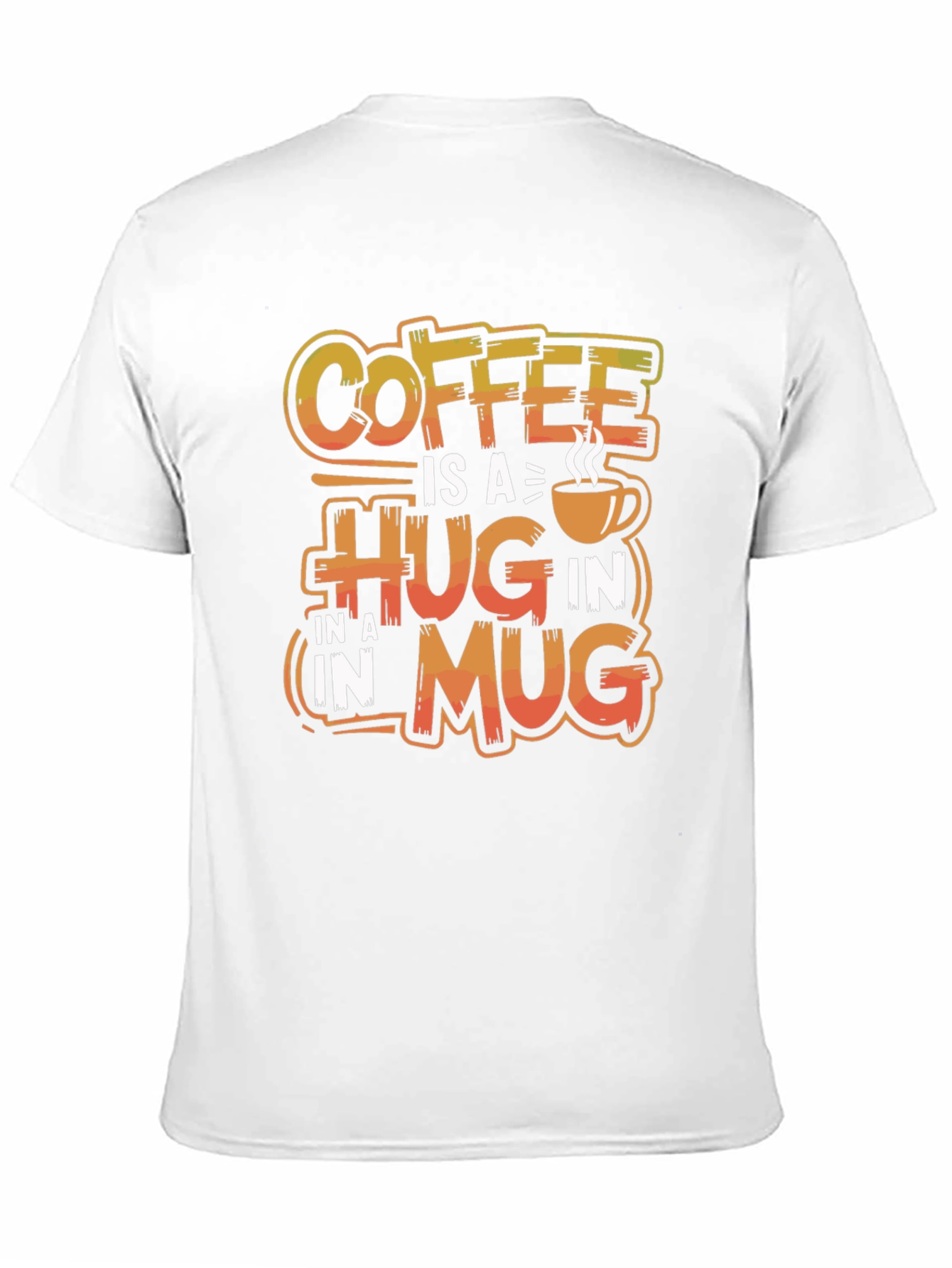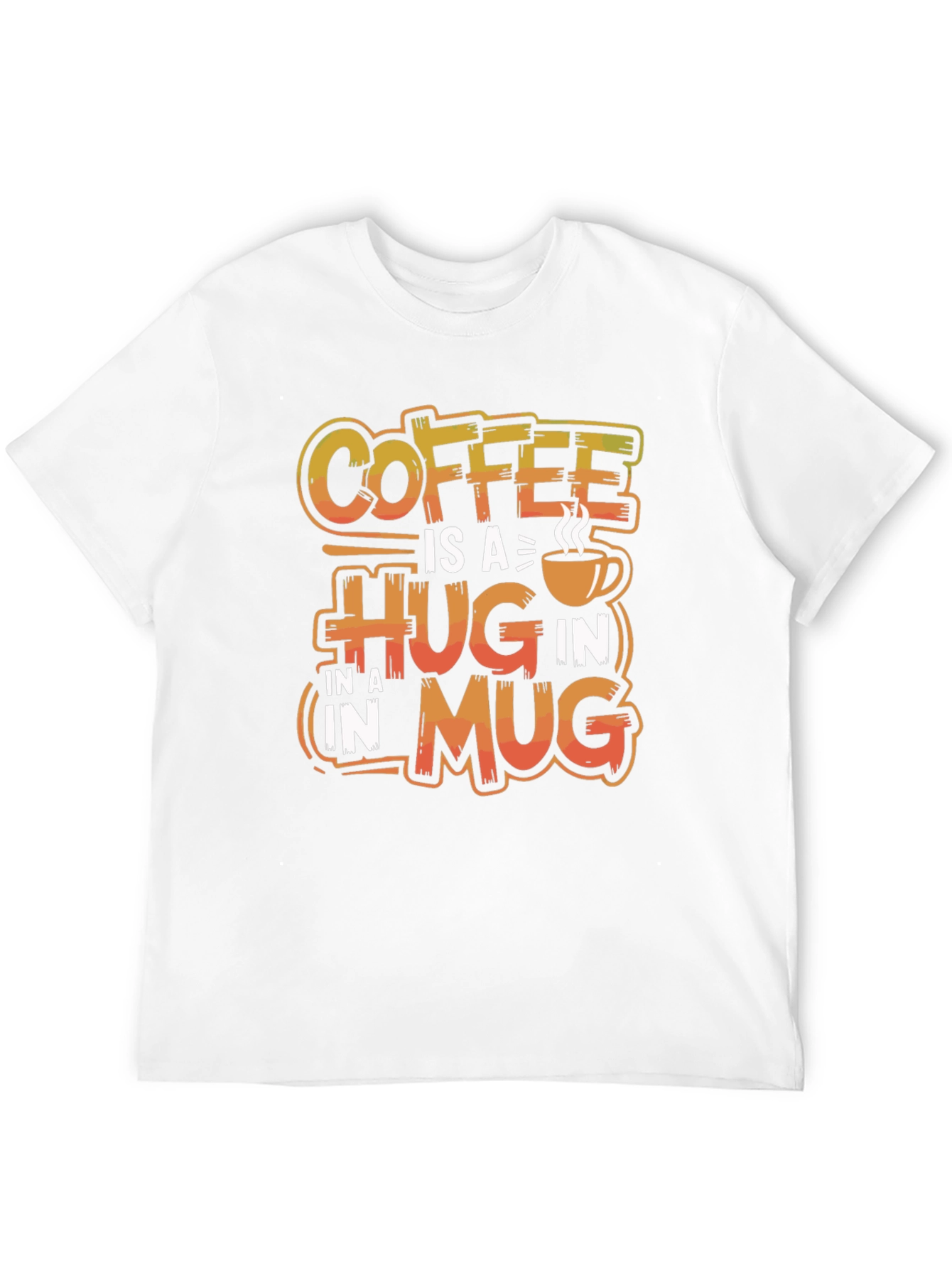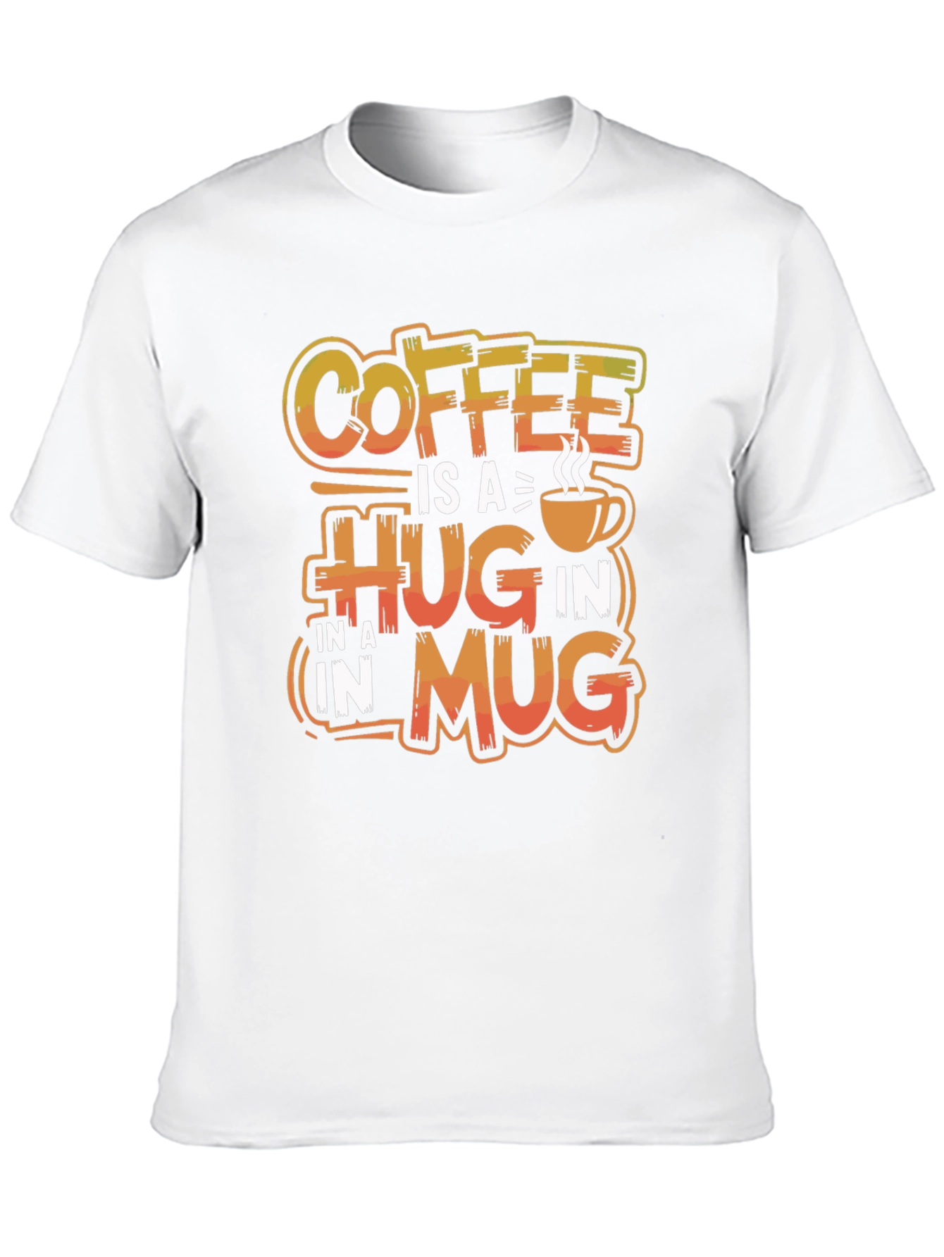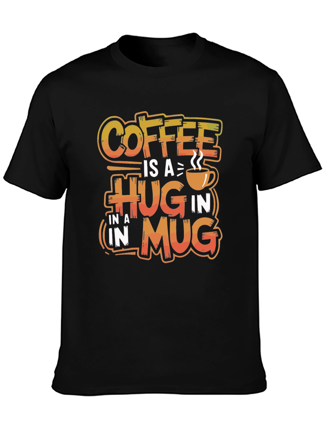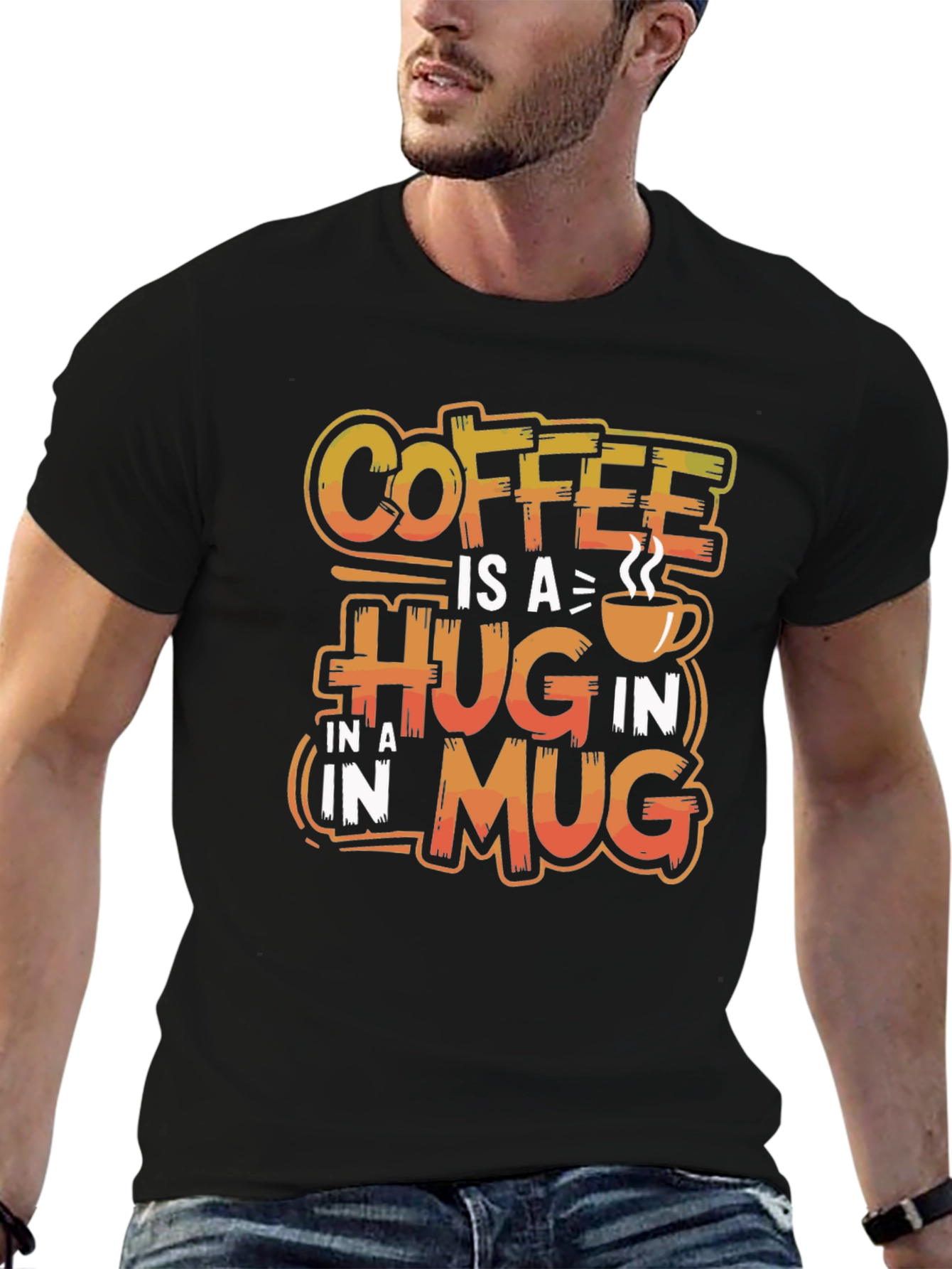 This stylish black t-shirt features a fun and relatable graphic design that reads, "Coffee is a hug in a mug." The text is rendered in a gradient from yellow to orange, giving it a vibrant and eye-catching look. The design includes a small illustration of a steaming coffee cup, reinforcing the message. Made from what appears to be soft, breathable cotton, this tee is perfect for everyday wear. Its classic fit makes it a comfortable and versatile addition to any wardrobe. Wear it to coffee shops, casual outings, or while lounging at home. It's a great conversation starter for coffee lovers!