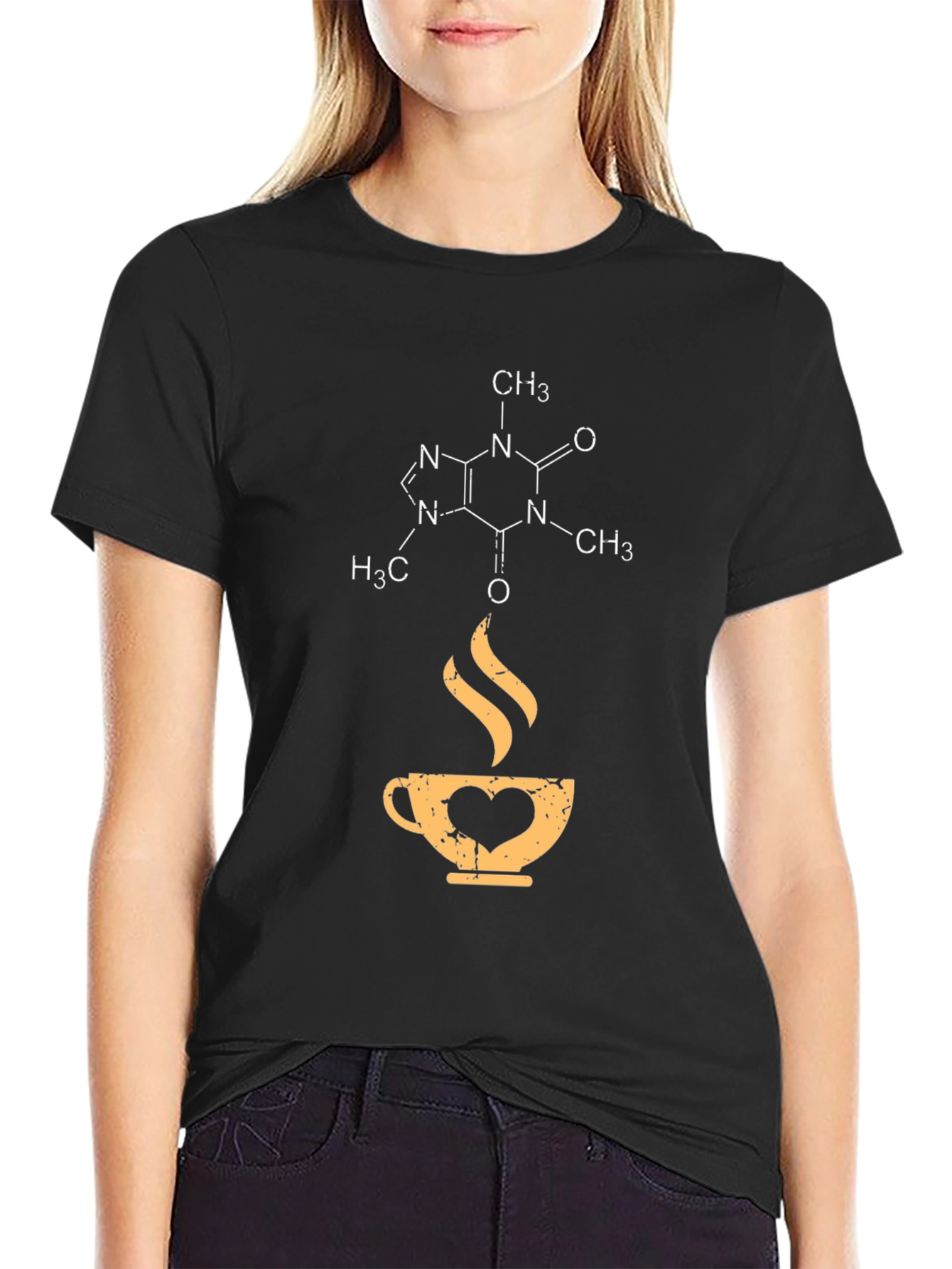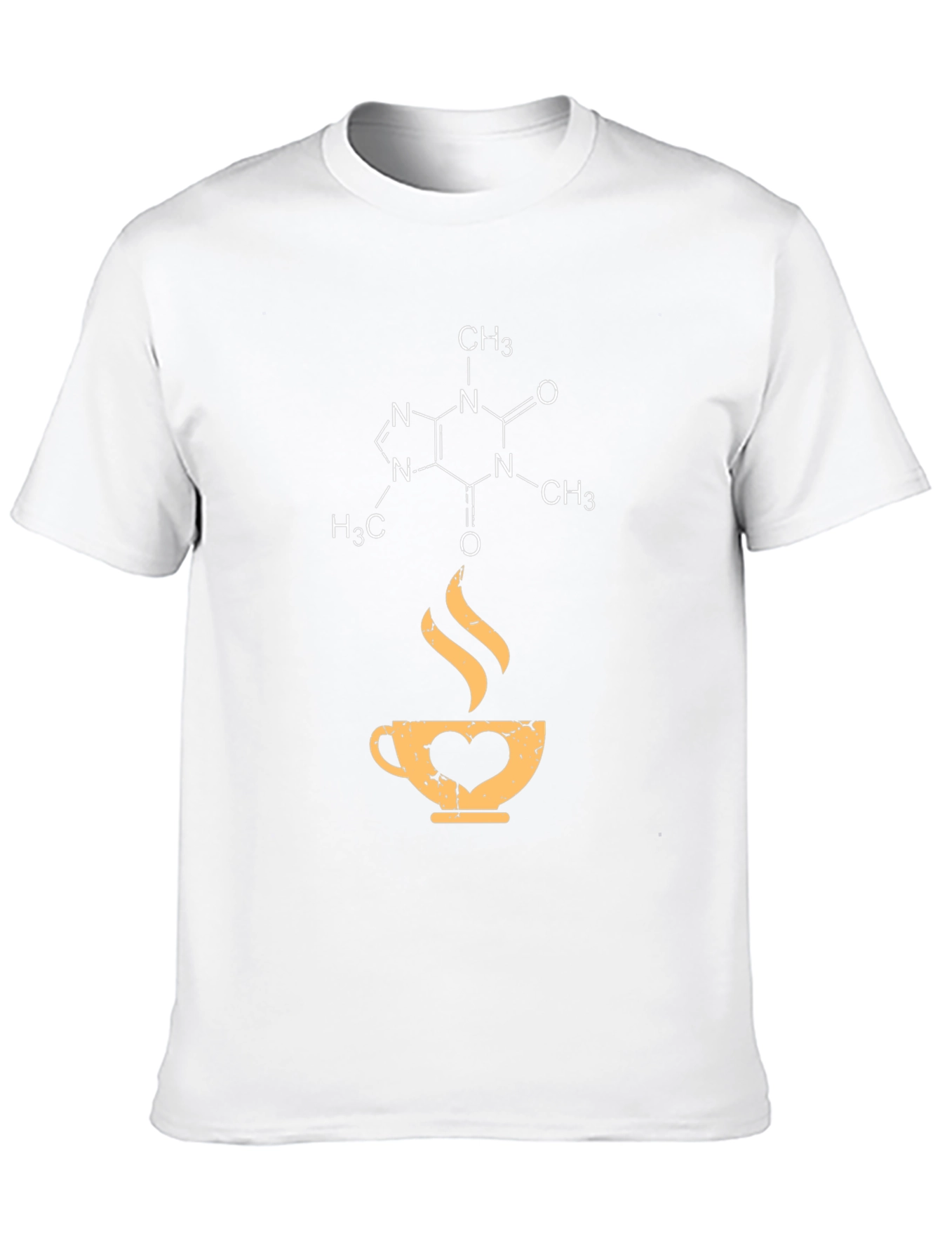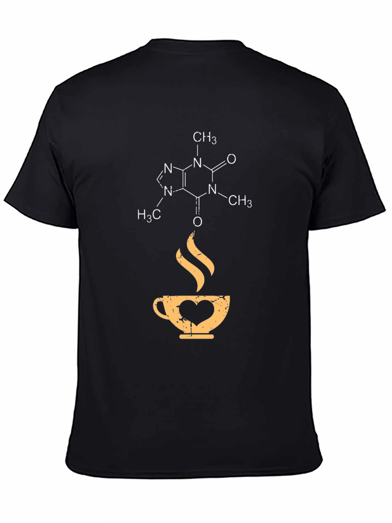 Show your love for coffee with this unique black t-shirt! The shirt features a detailed caffeine molecule design at the top, followed by a stylized coffee cup with a heart incorporated into its design. Rising steam adds to the coffee-themed aesthetic. Made from a comfortable fabric, this tee is perfect for everyday wear, coffee shop visits, or as a thoughtful gift for the caffeine aficionado in your life. Express your passion for science and coffee in style!
