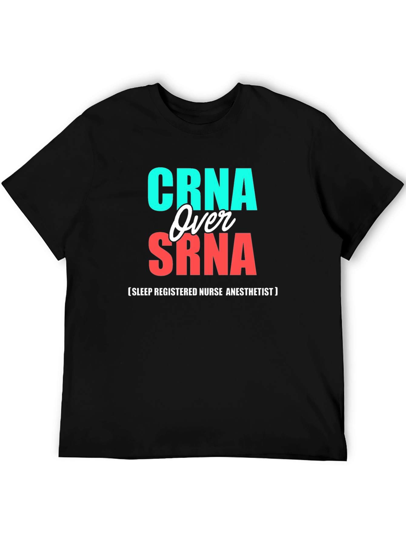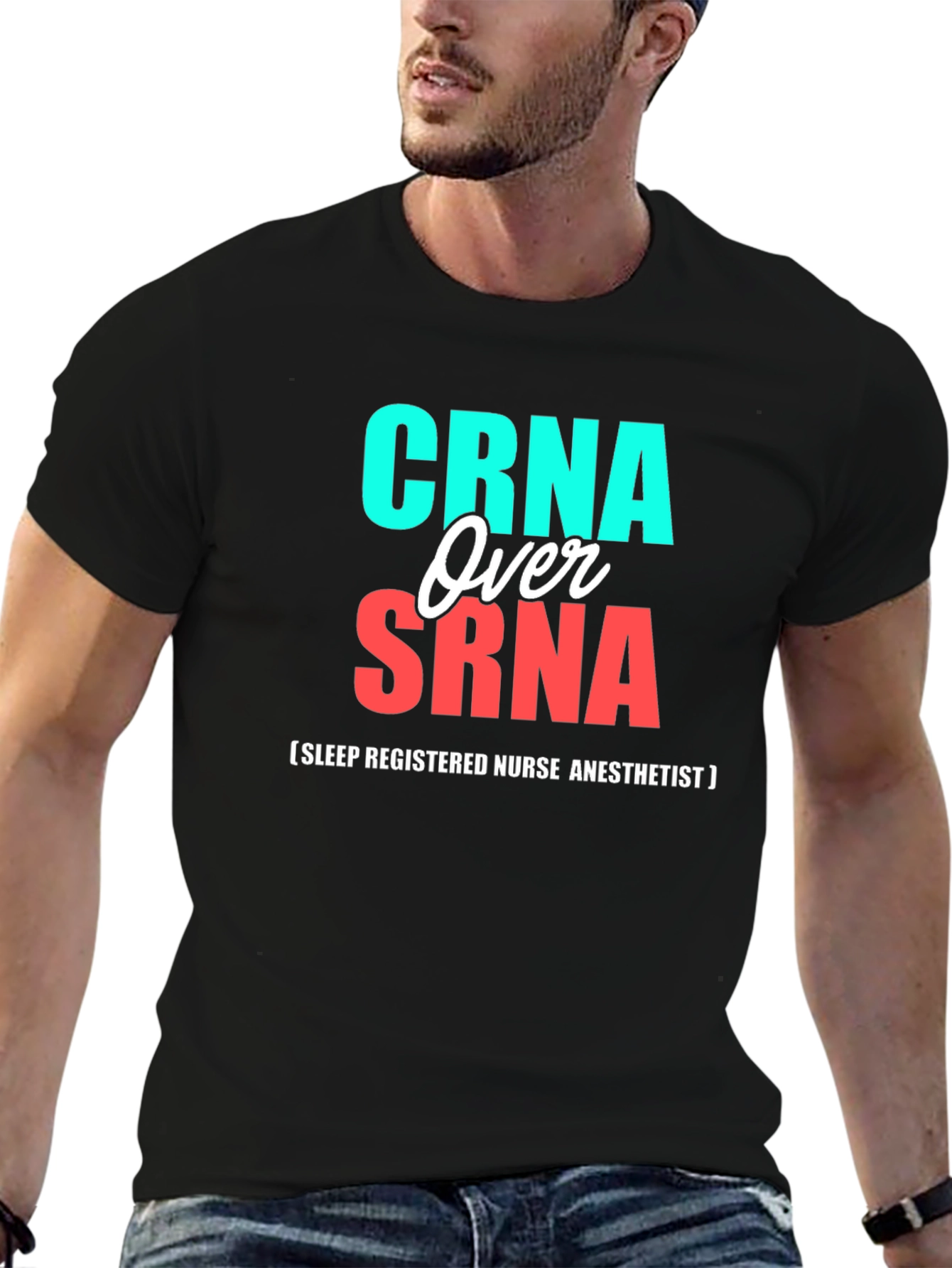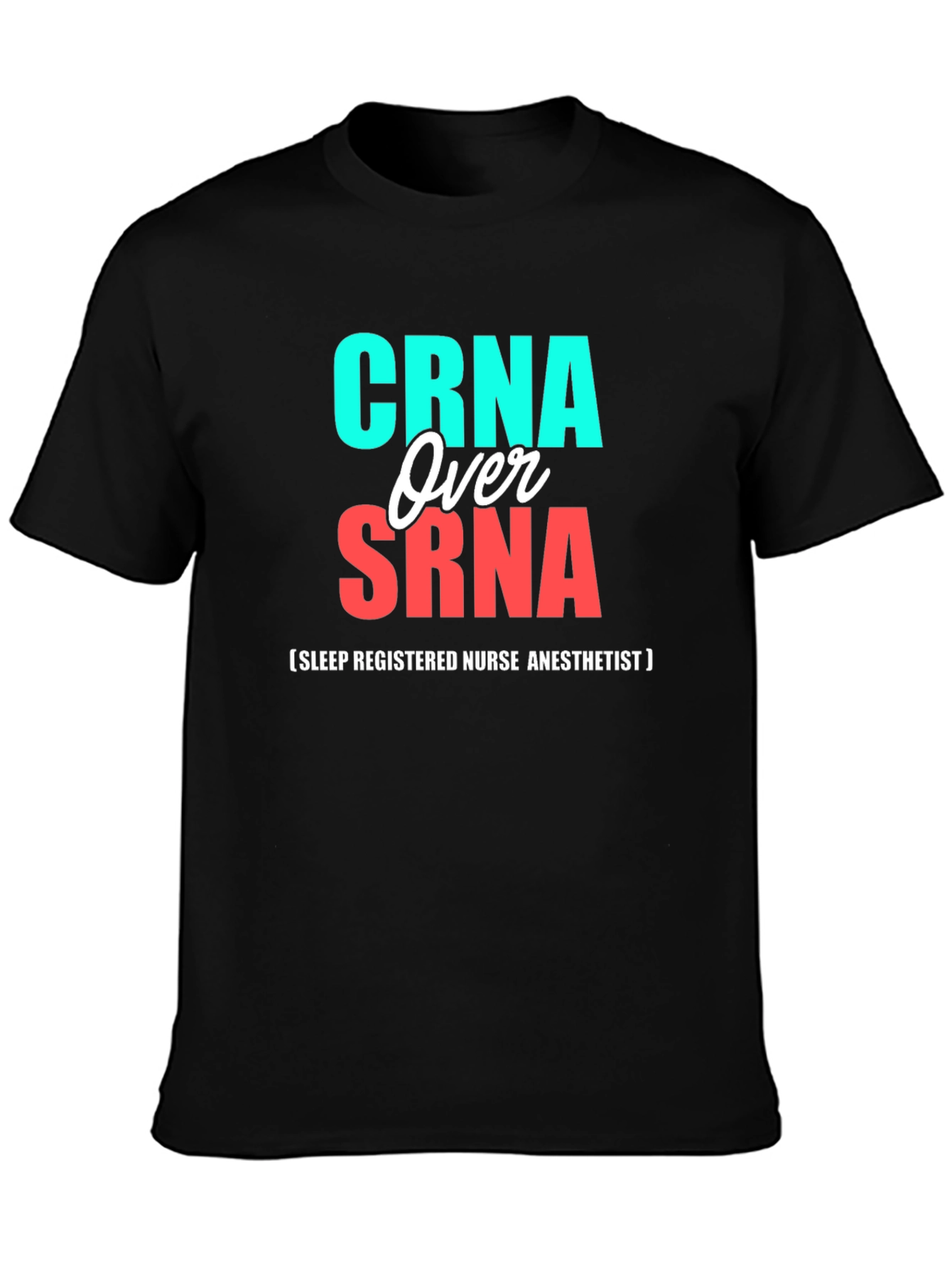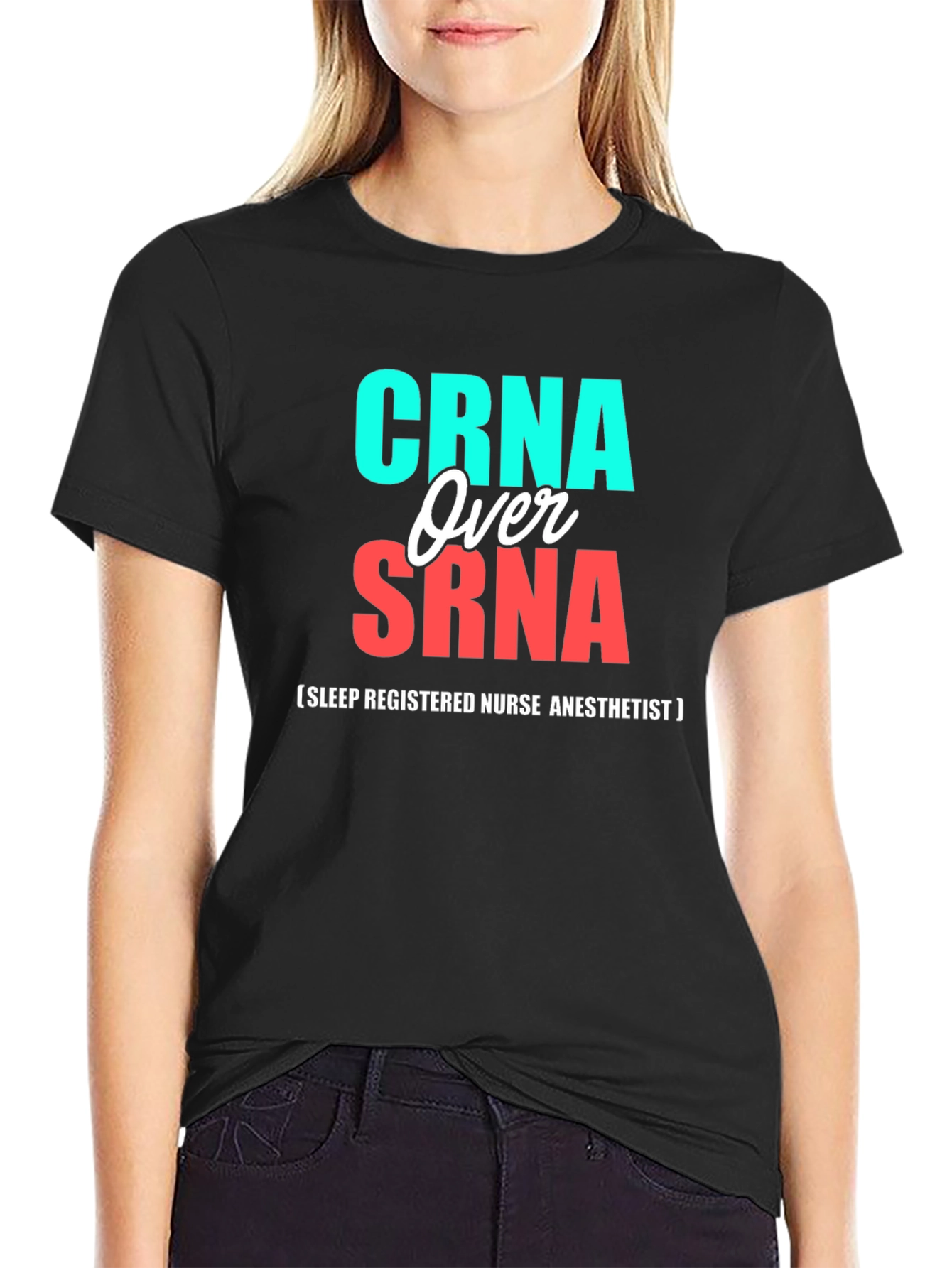 Show your pride as a Certified Registered Nurse Anesthetist with this bold black tee. The design features "CRNA Over SRNA" in eye-catching teal and red lettering, followed by "[SLEEP REGISTERED NURSE ANESTHETIST]" in a crisp white font. Made from a comfortable and breathable fabric, this t-shirt is perfect for everyday wear, whether you're at work or relaxing on your day off. A great conversation starter and a fun way to express your professional identity. A must-have for any proud CRNA!