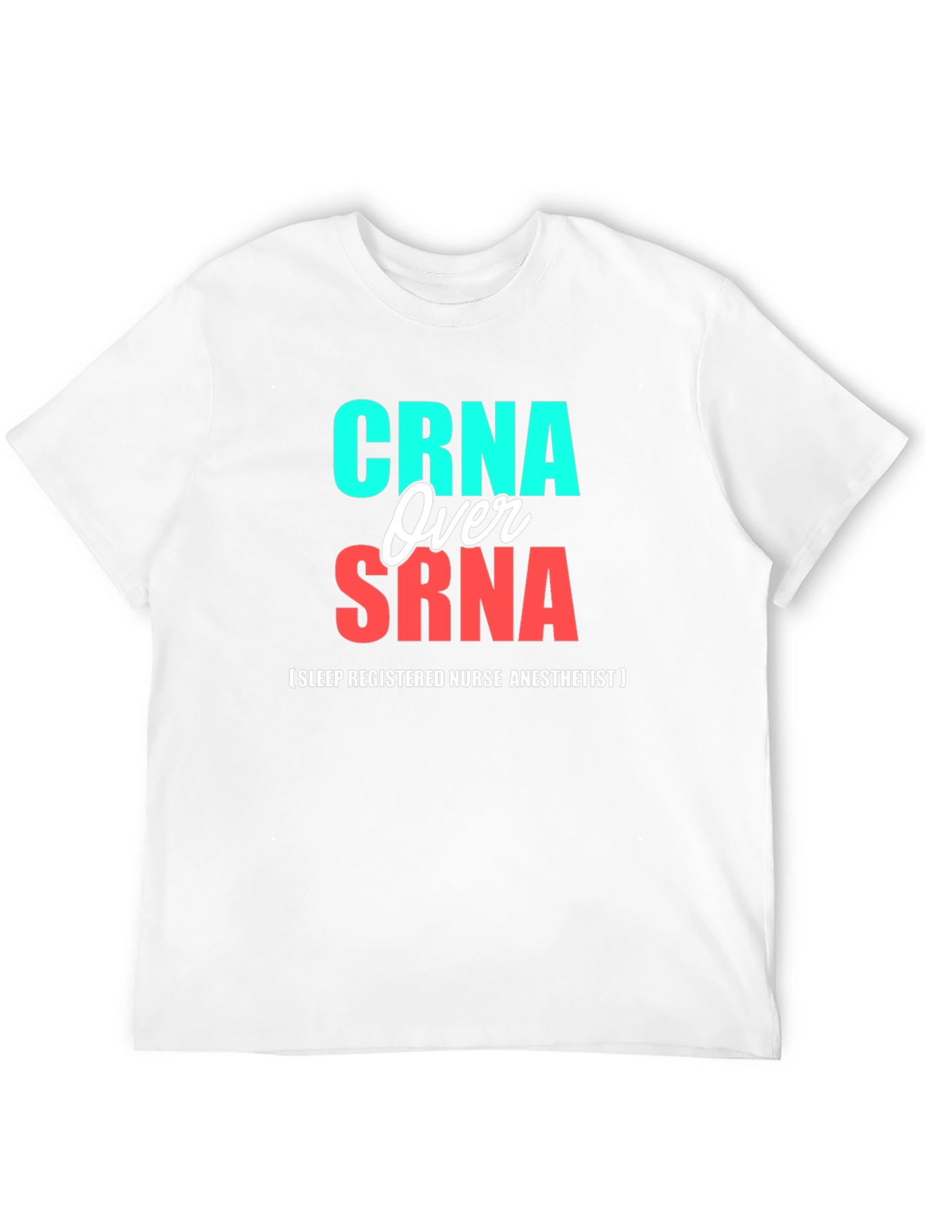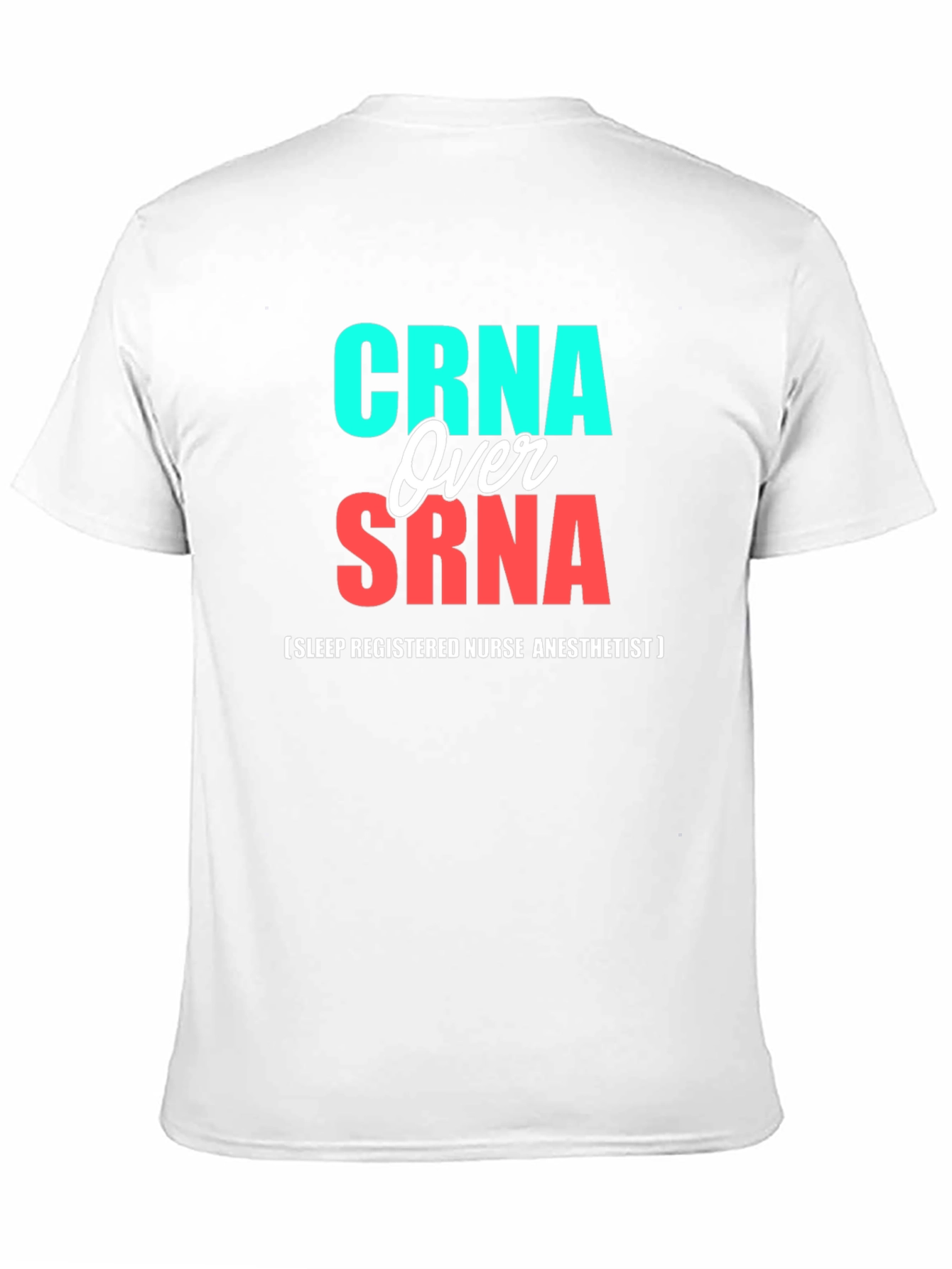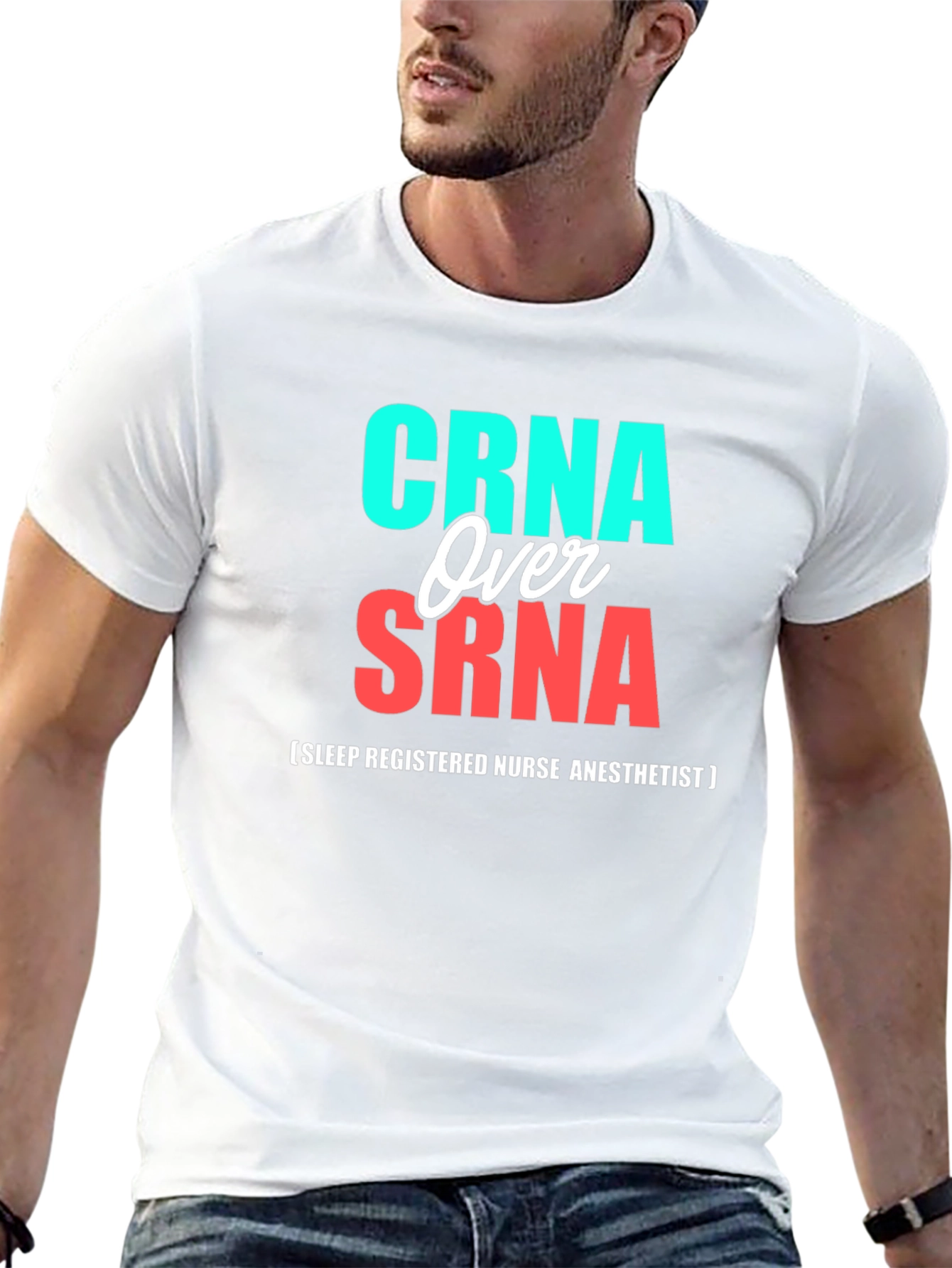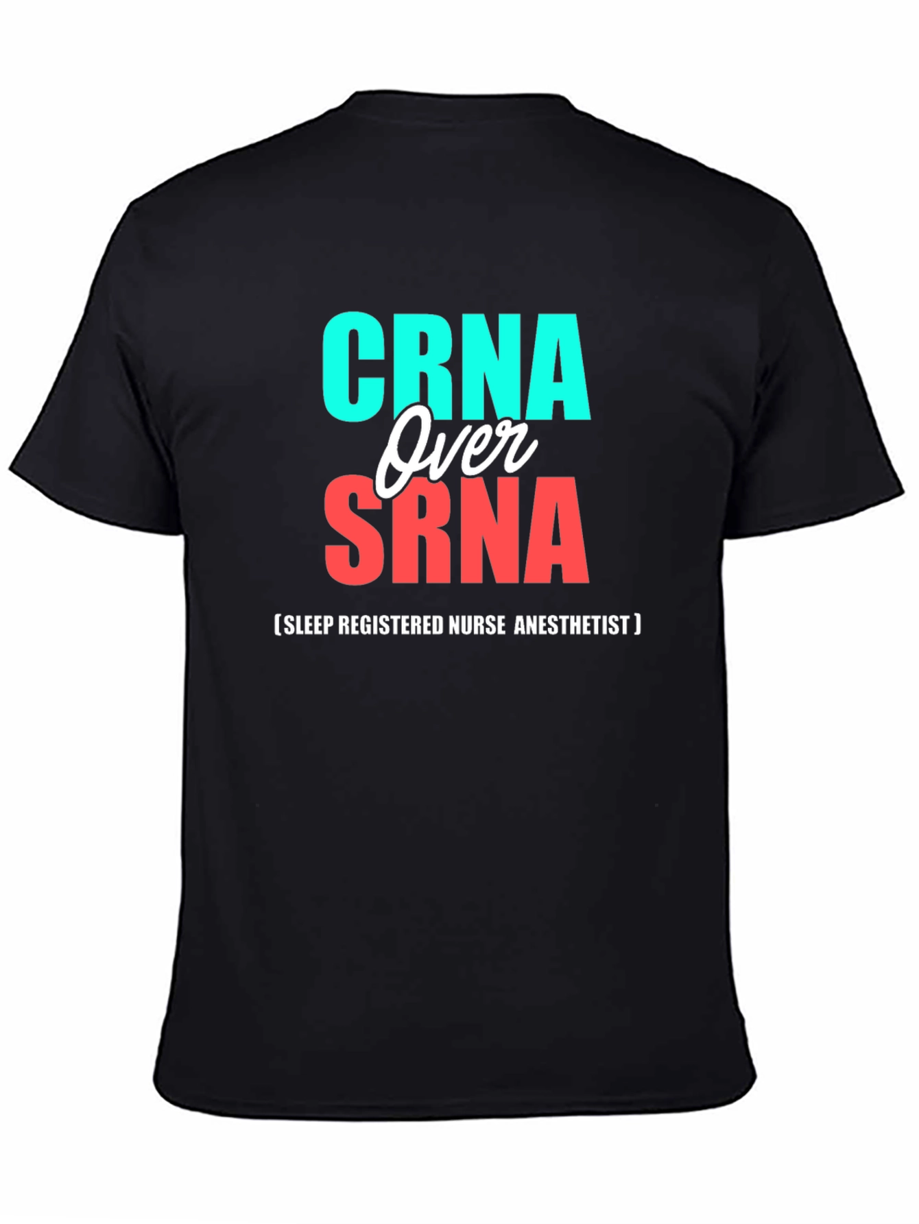 Show your pride as a Certified Registered Nurse Anesthetist with this bold black tee. The design features "CRNA Over SRNA" in eye-catching teal and red lettering, followed by "[SLEEP REGISTERED NURSE ANESTHETIST]" in a crisp white font. Made from a comfortable and breathable fabric, this t-shirt is perfect for everyday wear, whether you're at work or relaxing on your day off. A great conversation starter and a fun way to express your professional identity. A must-have for any proud CRNA!