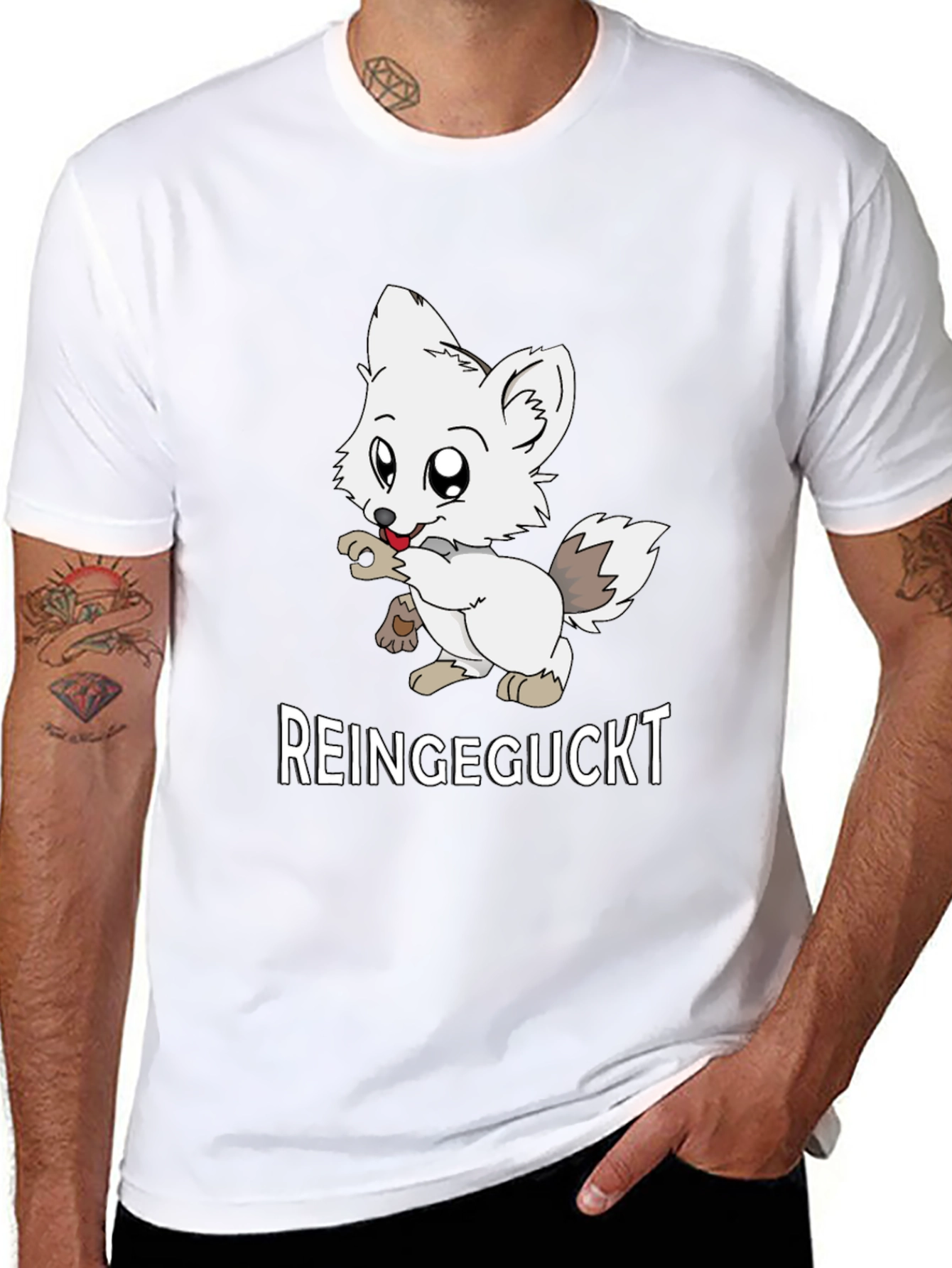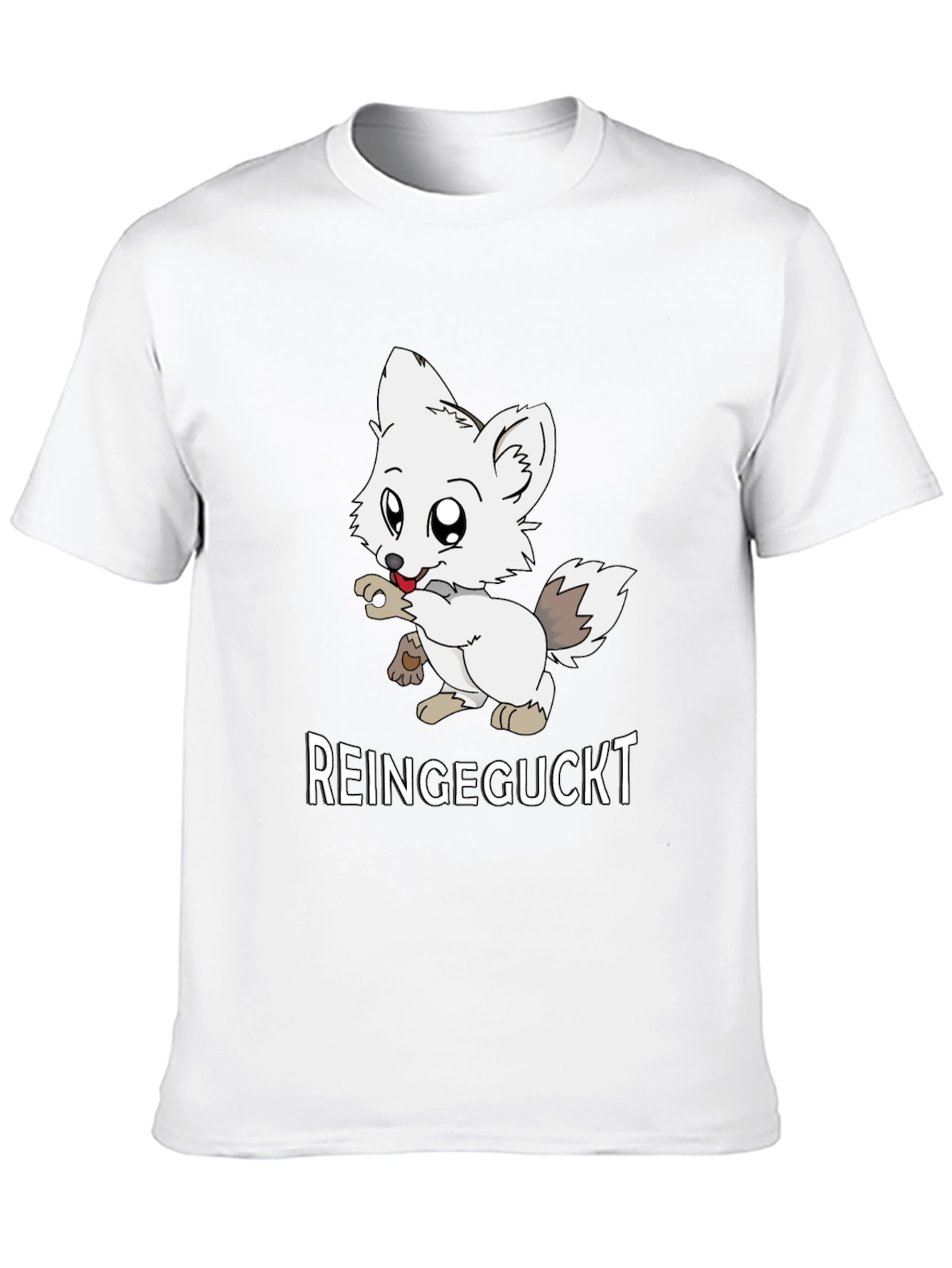 Show off your love for adorable animals with this eye-catching black t-shirt! Featuring a cartoonish white fox with a playful expression, this shirt is sure to turn heads. The German word "Reingeguckt" adds a touch of international flair to the design. Made from a soft, breathable fabric, this tee offers both comfort and style. Perfect for casual outings, lounging at home, or as a fun gift for fox enthusiasts. The unique graphic print ensures you'll stand out from the crowd. Get yours today and let your personality shine!