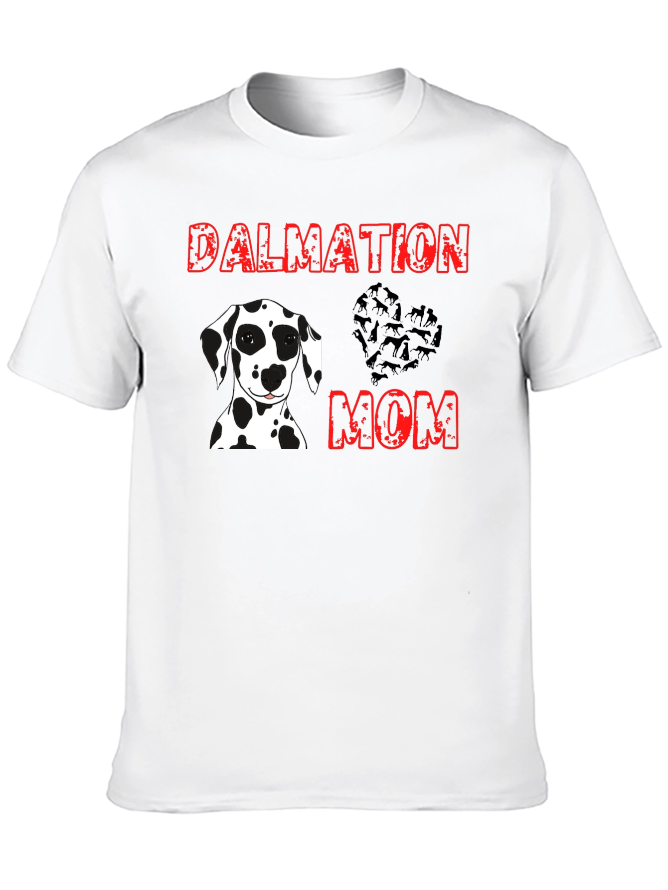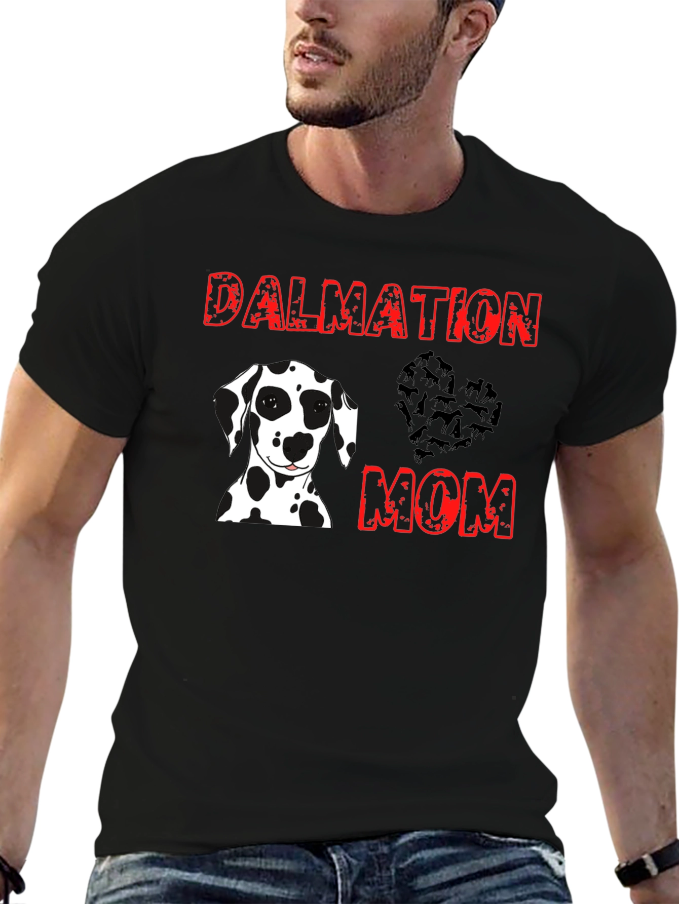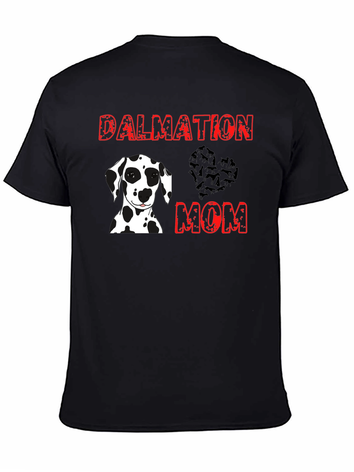 Show off your love for your furry friend with this stylish Dalmatian Mom t-shirt. This black tee features a vibrant red graphic design, showcasing a Dalmatian head and the words 'Dalmatian Mom.' The design also includes a unique heart shape filled with Dalmatian silhouettes. The comfortable material makes it ideal for everyday wear. This t-shirt is perfect for dog lovers, casual outings, or as a thoughtful gift for the Dalmatian obsessed mother in your life. Grab yours today and wear your heart on your sleeve (or rather, your chest)!