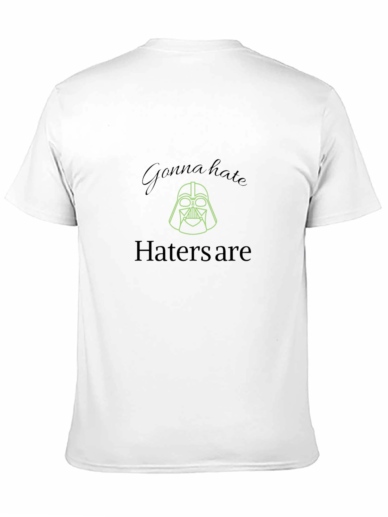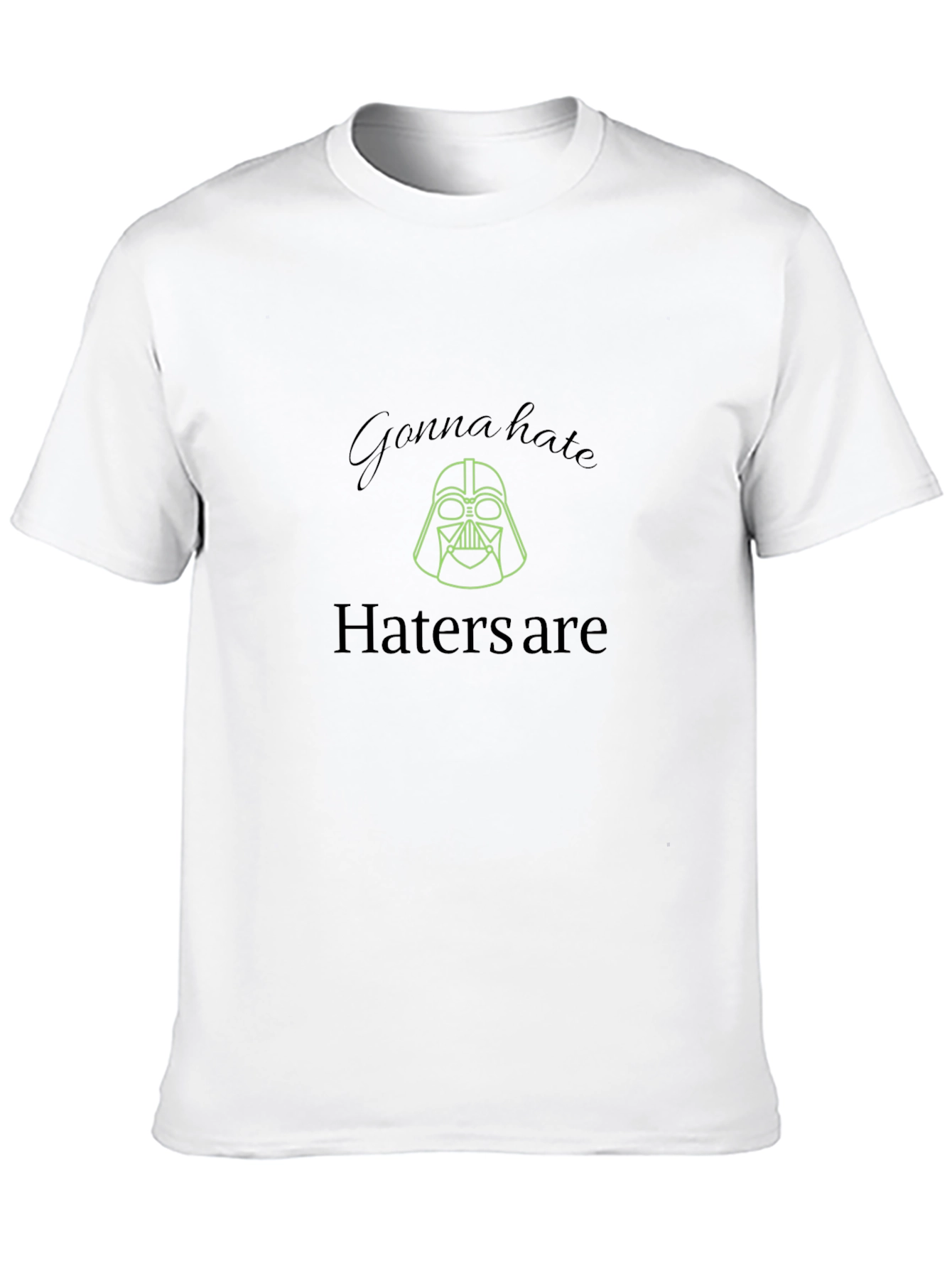 Show off your love for Star Wars with this stylish black t-shirt featuring a unique Darth Vader design. The minimalist graphic features Darth Vader's helmet and the phrase "Gonna hate, haters are." This comfortable tee is made from a soft, breathable fabric, perfect for casual wear or displaying your fandom at conventions. It's an eye-catching piece that subtly expresses your interests, making it a great conversation starter. Stand out from the crowd with this one-of-a-kind t-shirt that seamlessly blends iconic pop culture with modern style. A must-have for any Star Wars enthusiast looking to express themselves with a fashionable edge.