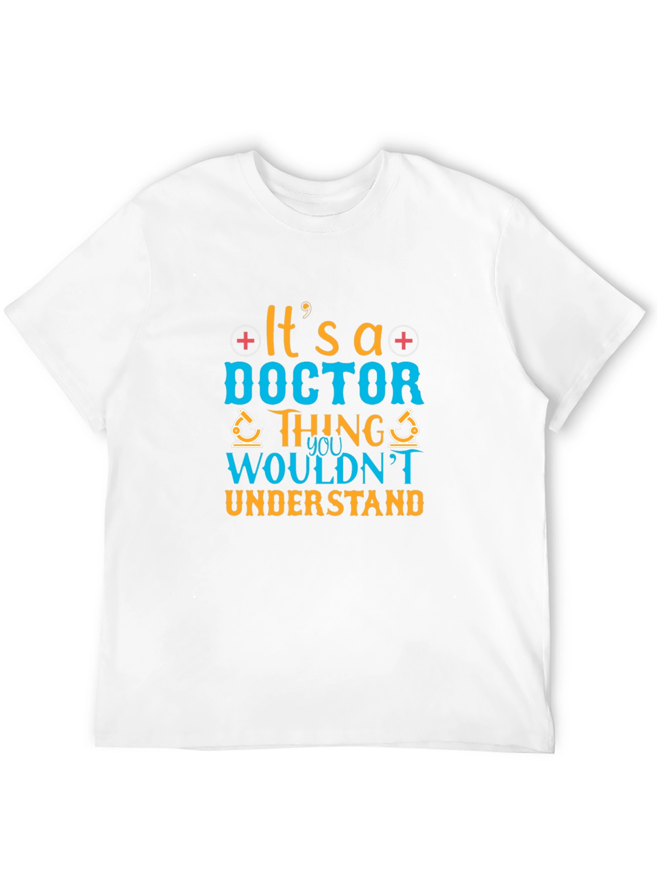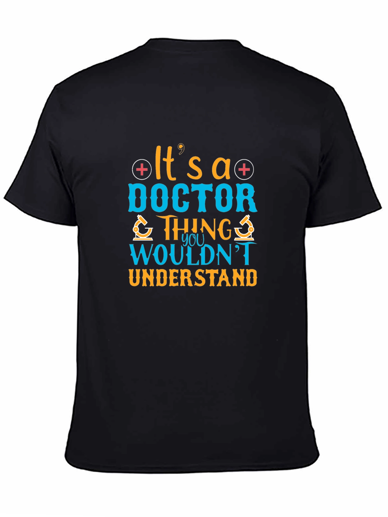 Showcase your medical profession pride with this eye-catching black t-shirt. The design features the phrase 'It's a Doctor Thing You Wouldn't Understand' in a mix of bold blue and vibrant gold lettering, adorned with symbolic medical plus signs and microscope graphics. Made from a comfortable, breathable fabric, this tee is perfect for casual wear, work events, or as a thoughtful gift for the dedicated doctor in your life. The shirt's classic fit makes it suitable for everyday style, providing both comfort and a statement of professional identity.