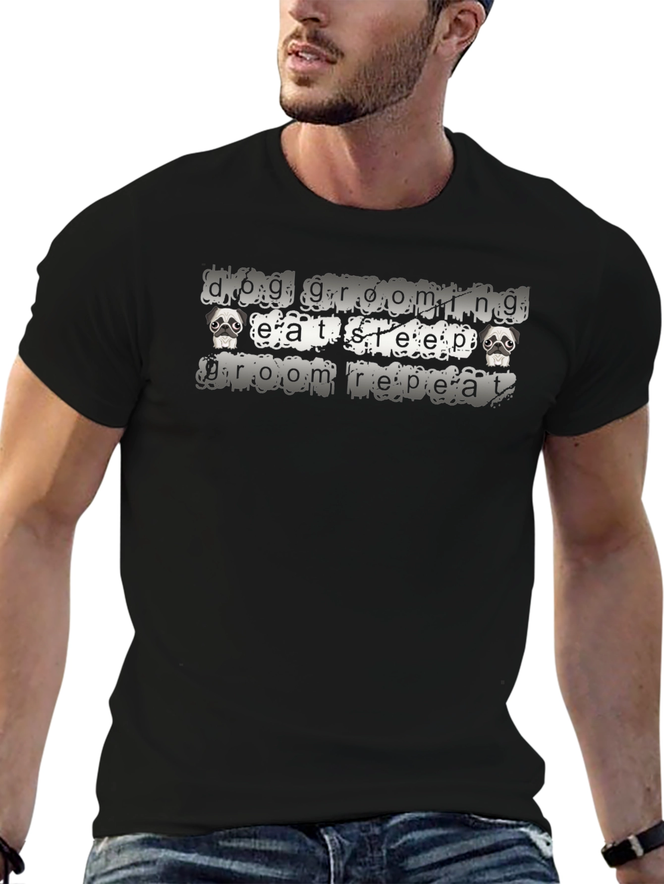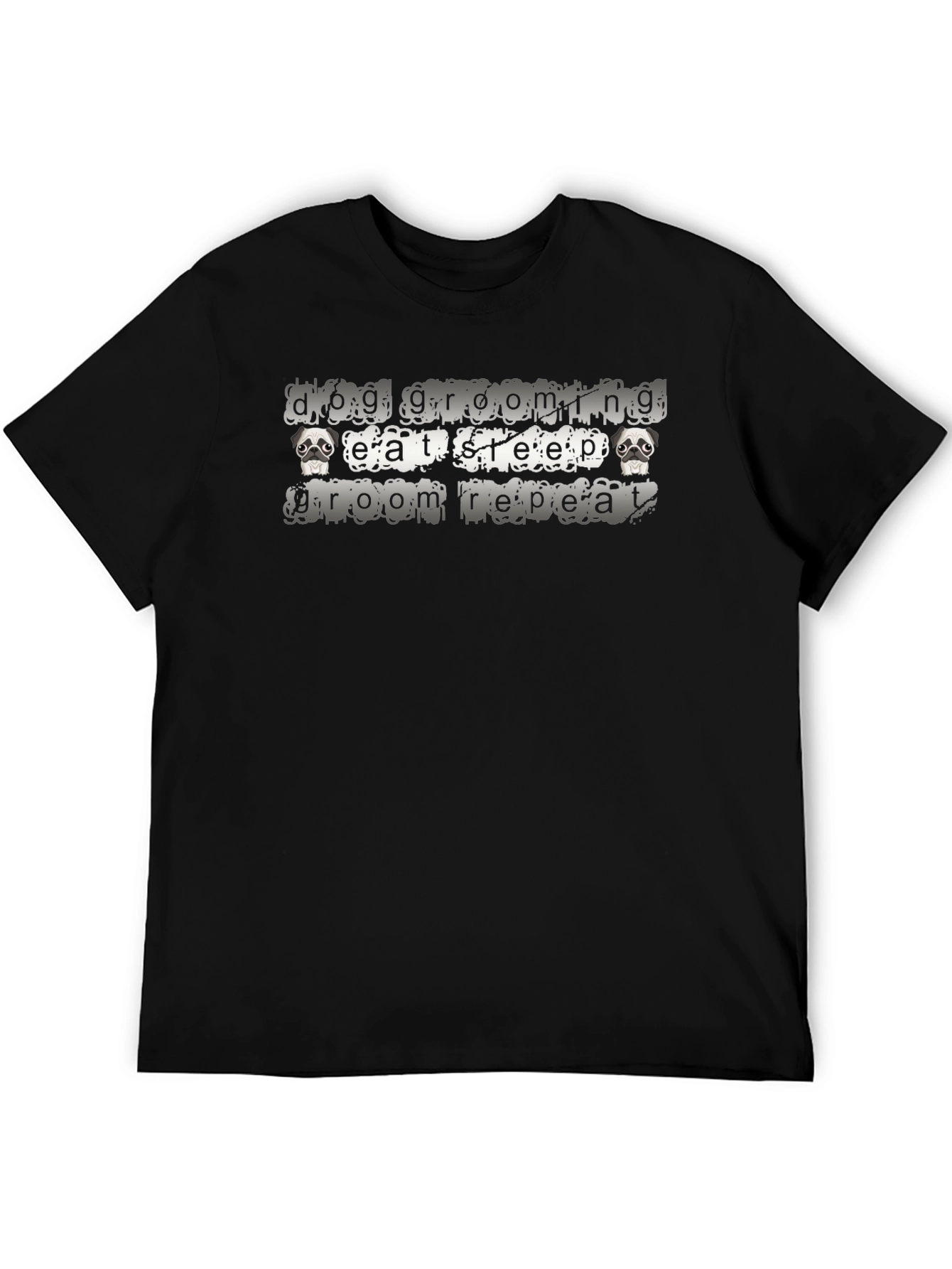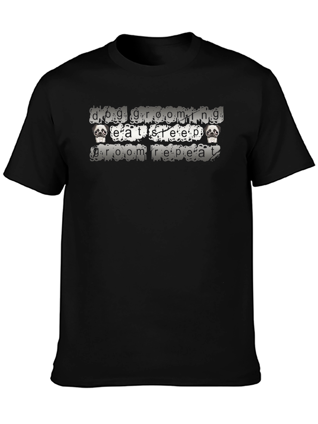 Show off your passion for dog grooming with this unique black t-shirt. Featuring a playful design that reads "Dog Grooming Eat Sleep Groom Repeat" in a stylish, slightly distressed font, it's perfect for groomers and dog lovers alike. The design incorporates cute dog illustrations, adding a touch of whimsy to the overall look. Made from what appears to be a soft and comfortable cotton blend, this tee is ideal for everyday wear, whether you're at work, relaxing at home, or out and about. A fun and expressive way to showcase your love for dogs and your profession. Get yours today!