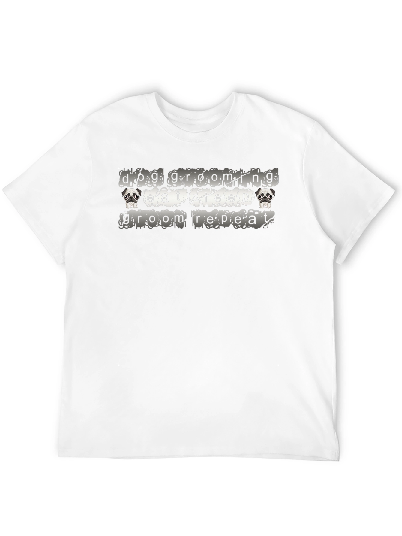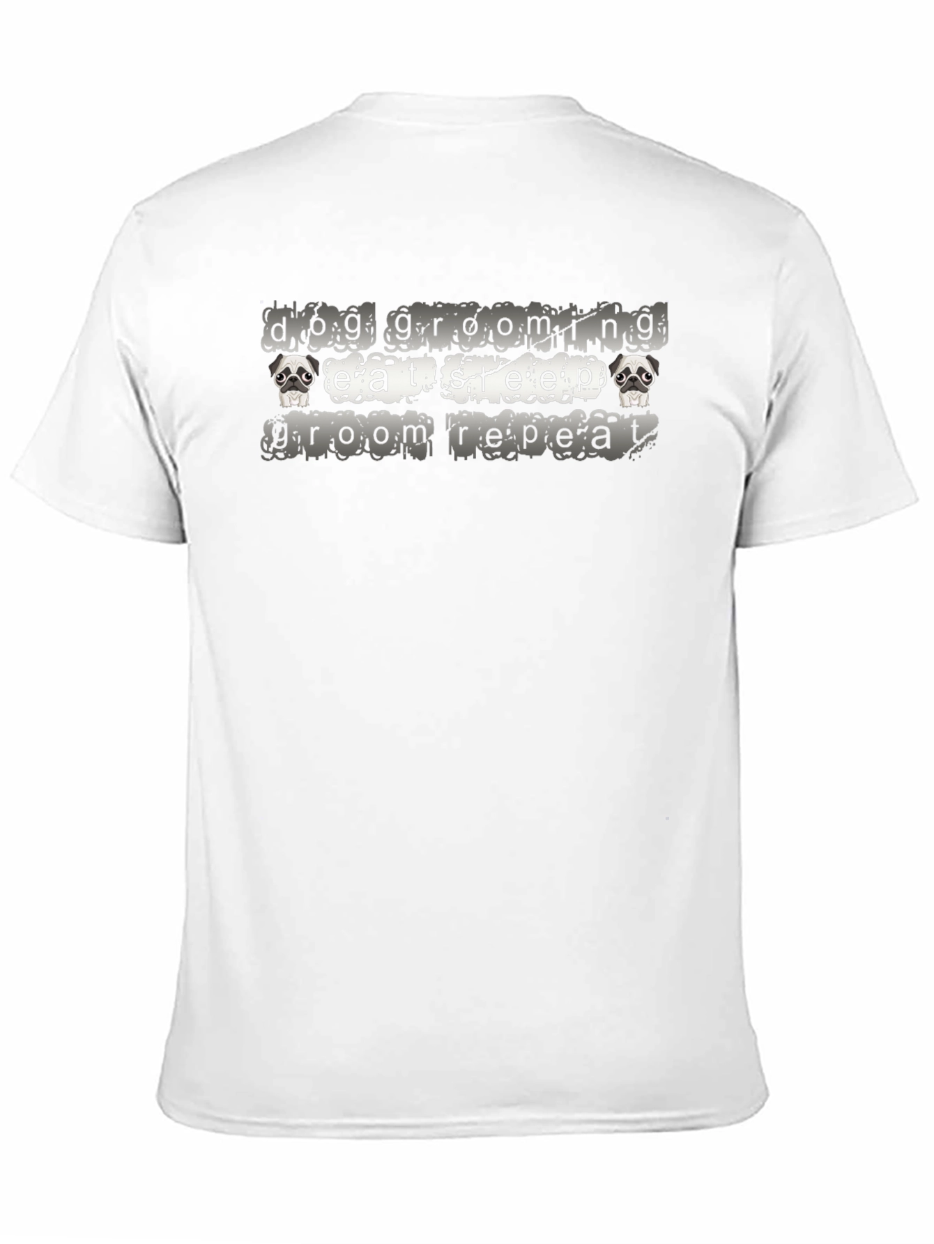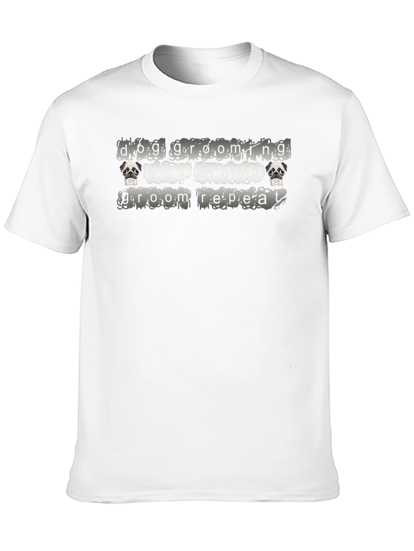 Show off your passion for dog grooming with this unique black t-shirt. Featuring a playful design that reads "Dog Grooming Eat Sleep Groom Repeat" in a stylish, slightly distressed font, it's perfect for groomers and dog lovers alike. The design incorporates cute dog illustrations, adding a touch of whimsy to the overall look. Made from what appears to be a soft and comfortable cotton blend, this tee is ideal for everyday wear, whether you're at work, relaxing at home, or out and about. A fun and expressive way to showcase your love for dogs and your profession. Get yours today!