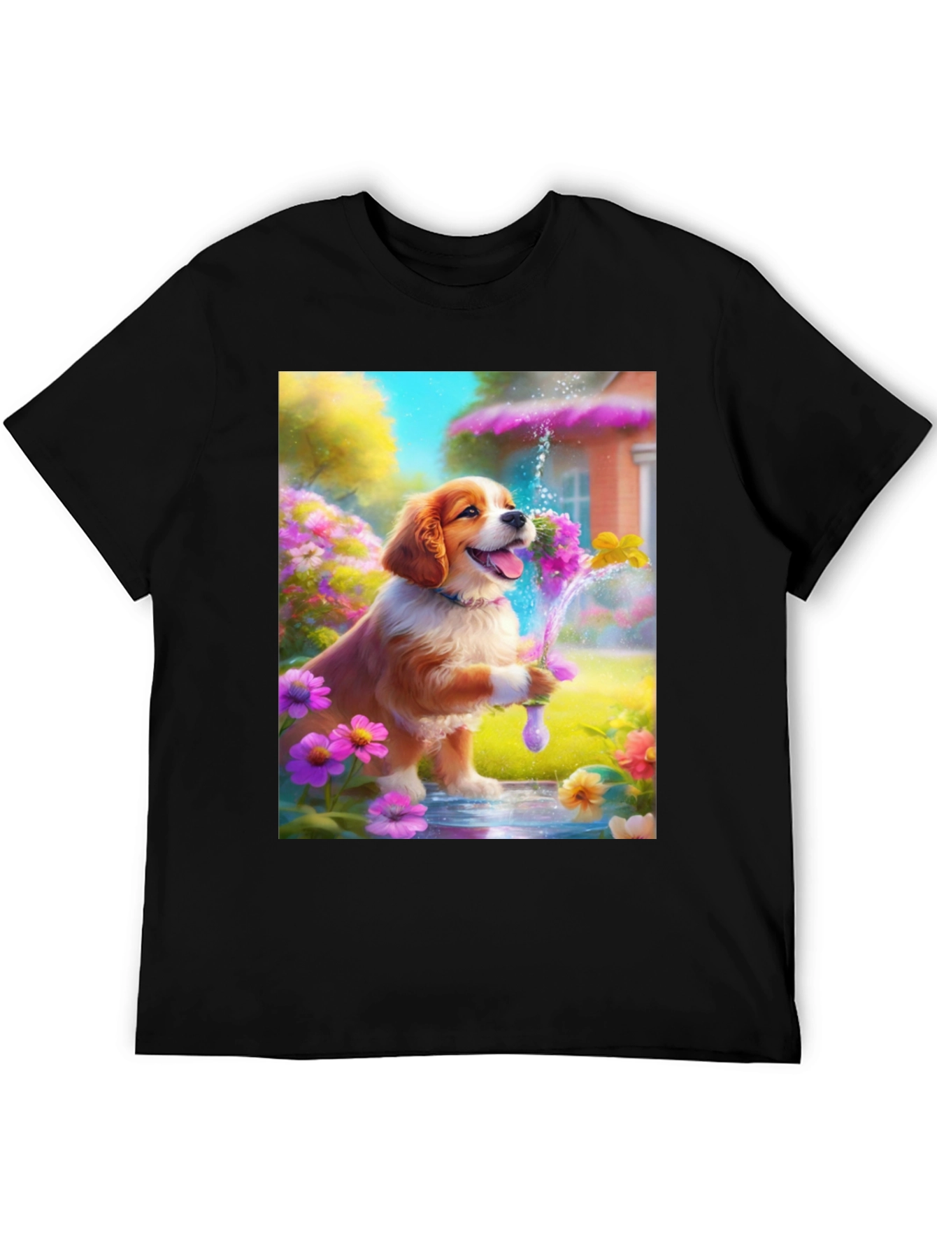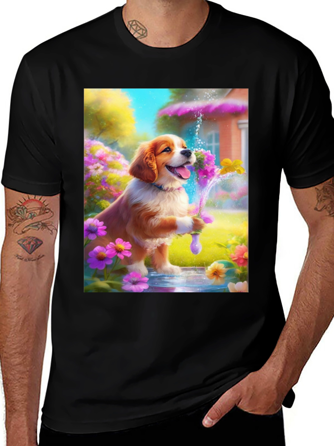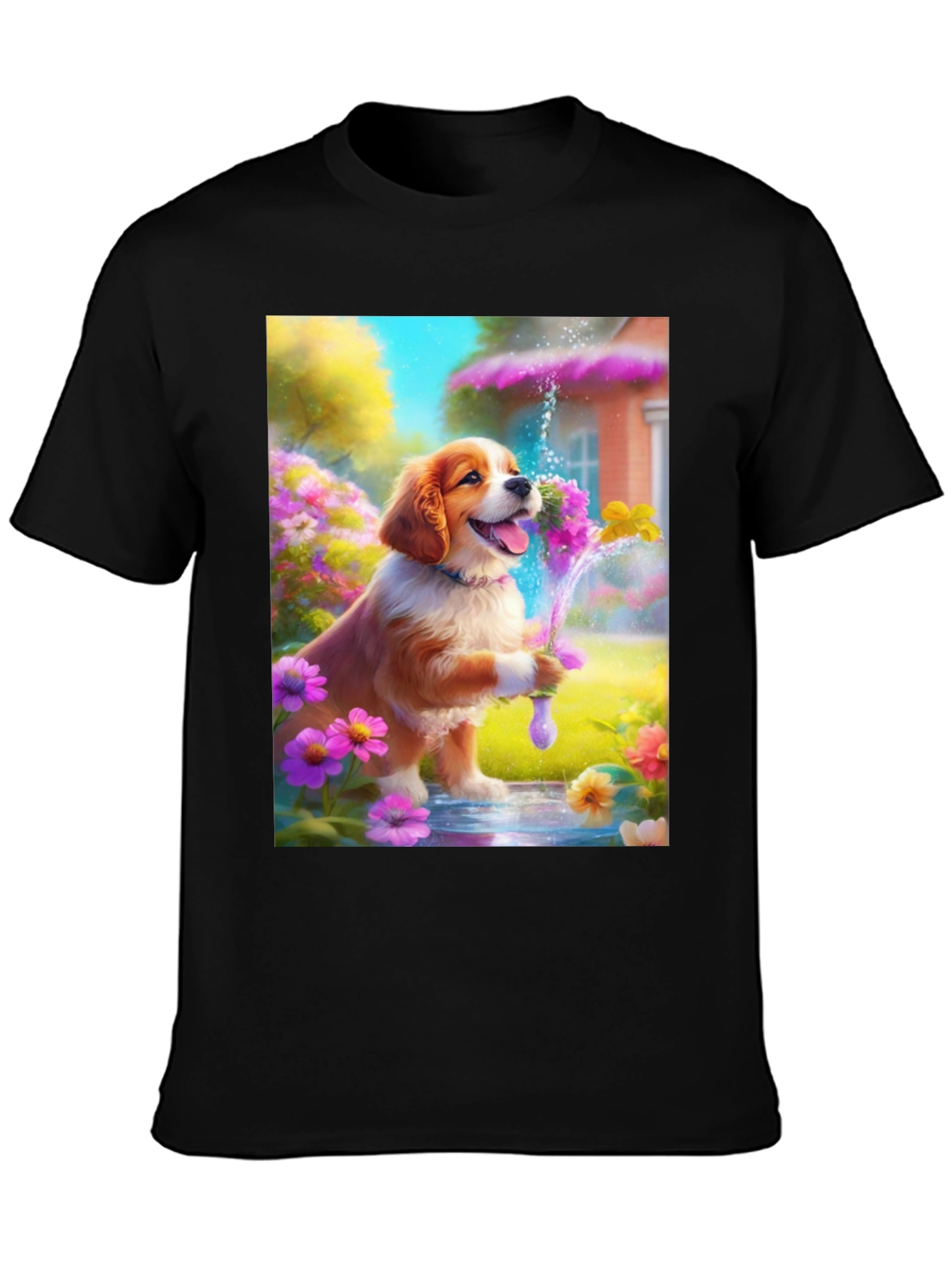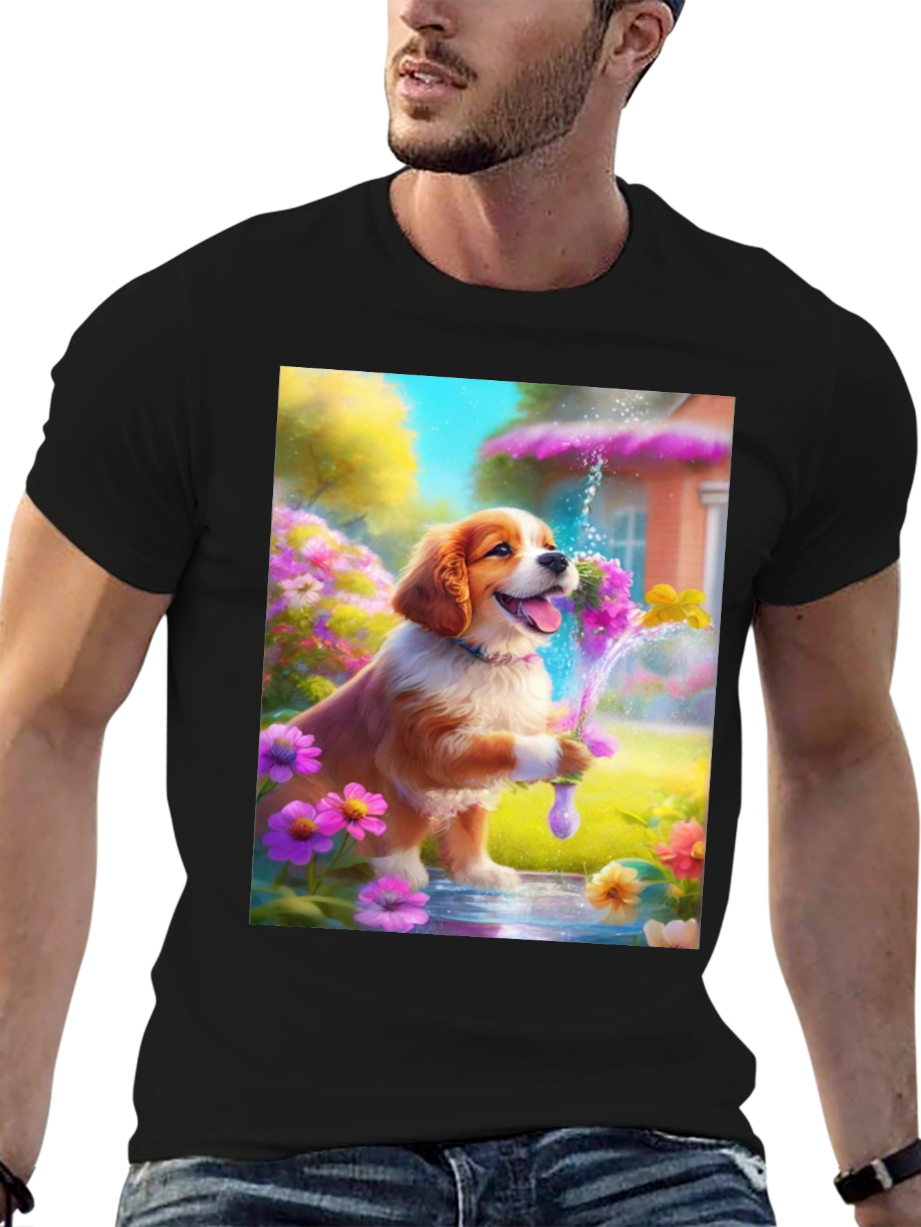 This black t-shirt features a vibrant and heartwarming graphic of a cute dog playing with colorful flowers in a whimsical garden. The design captures a joyful scene with the dog seemingly enjoying a splash of water amidst a backdrop of lush greenery and a charming house. Made from comfortable, breathable fabric, this tee is perfect for casual wear. The high-quality print ensures the colors remain vivid and the design stands out. Show off your love for dogs and vibrant art with this eye-catching tee, ideal for everyday outings or relaxed weekends. Get ready to turn heads and spread smiles!