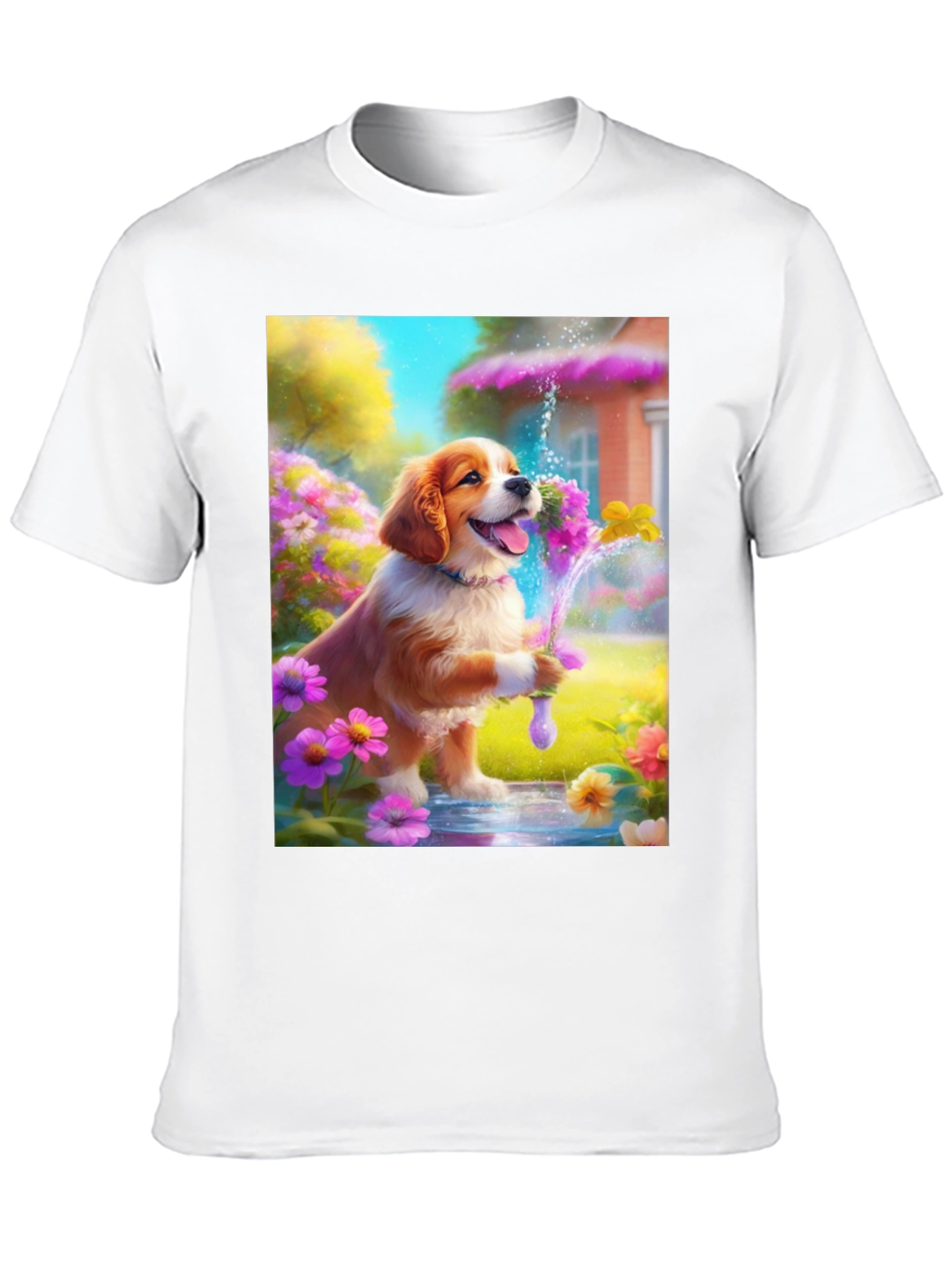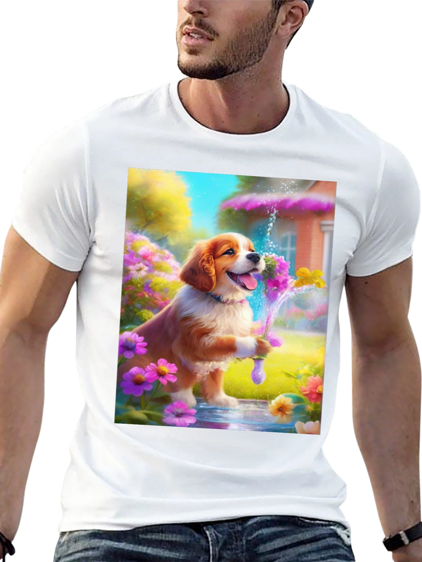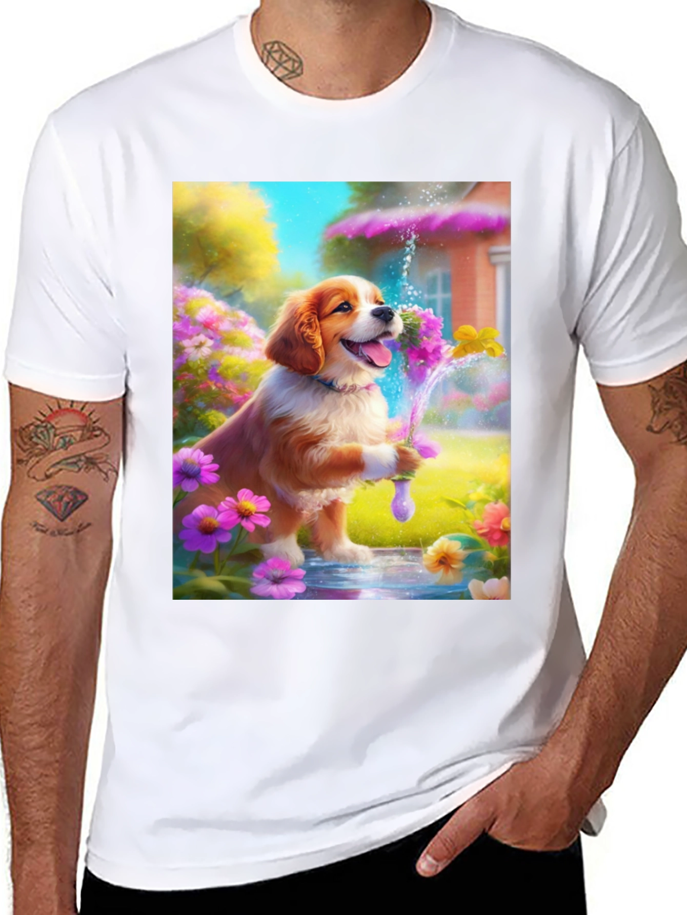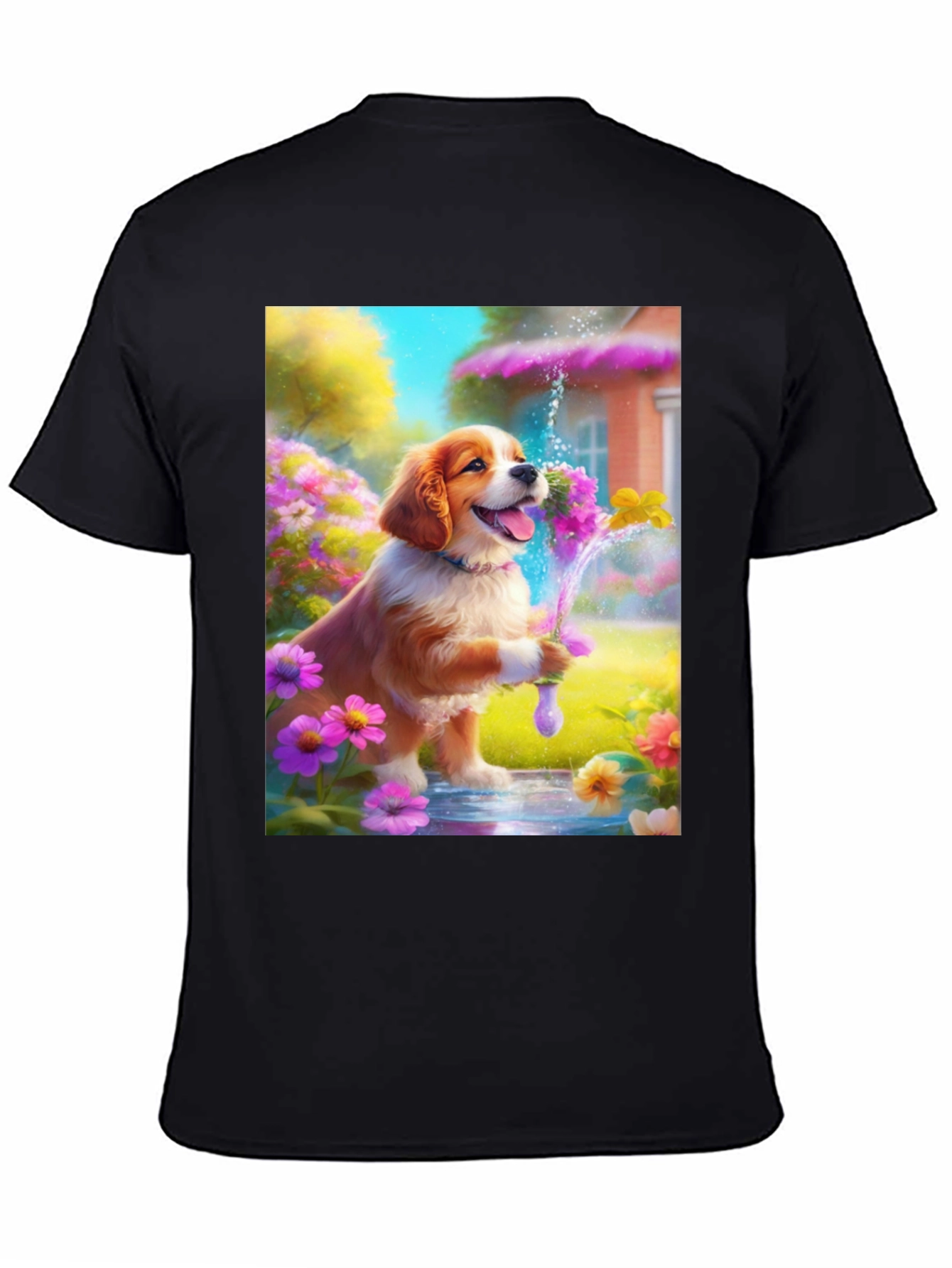 This black t-shirt features a vibrant and heartwarming graphic of a cute dog playing with colorful flowers in a whimsical garden. The design captures a joyful scene with the dog seemingly enjoying a splash of water amidst a backdrop of lush greenery and a charming house. Made from comfortable, breathable fabric, this tee is perfect for casual wear. The high-quality print ensures the colors remain vivid and the design stands out. Show off your love for dogs and vibrant art with this eye-catching tee, ideal for everyday outings or relaxed weekends. Get ready to turn heads and spread smiles!