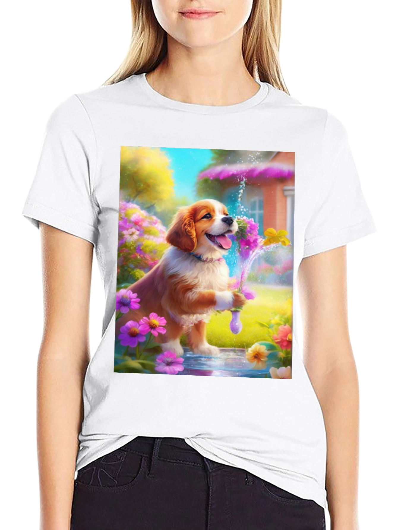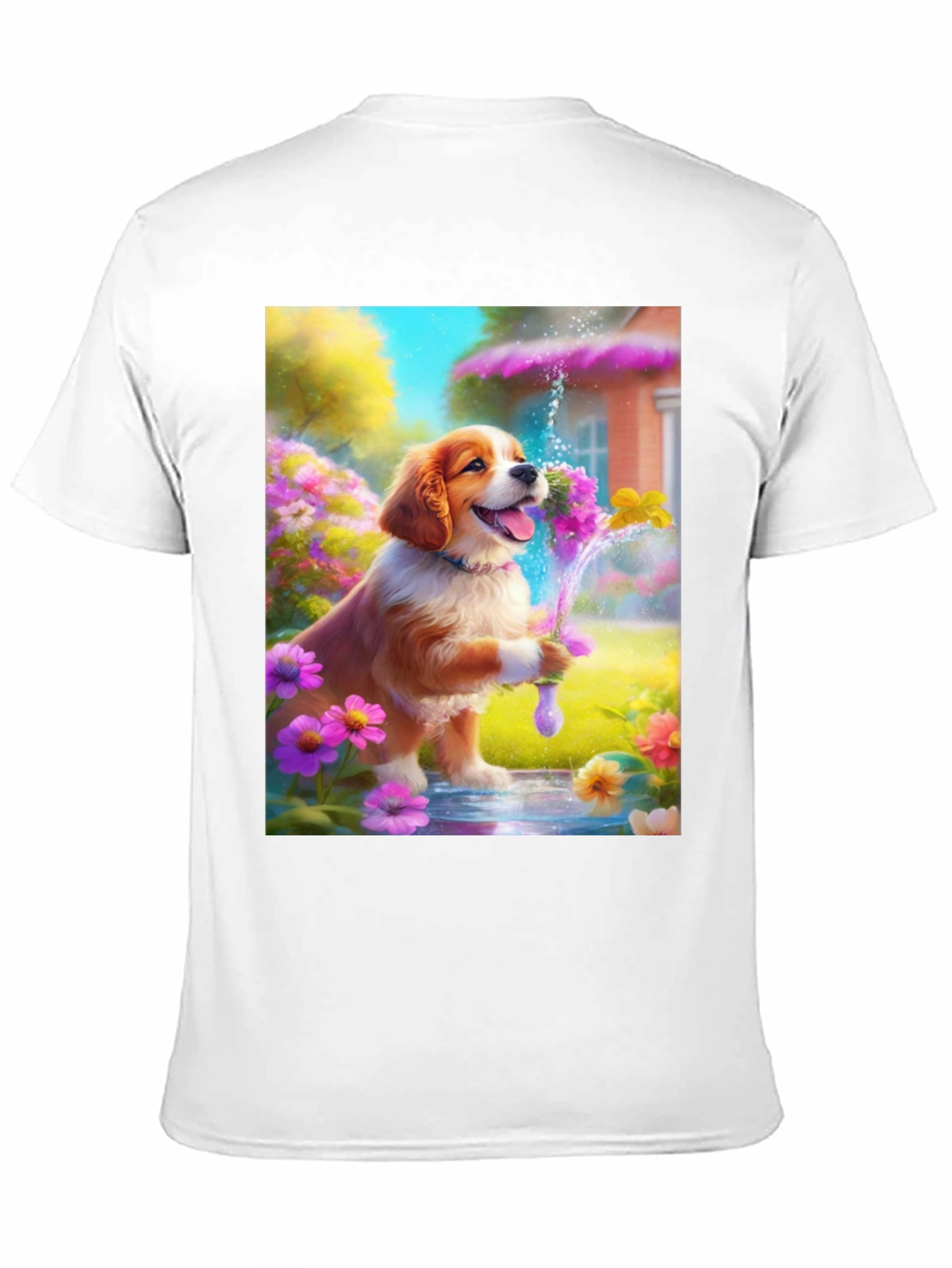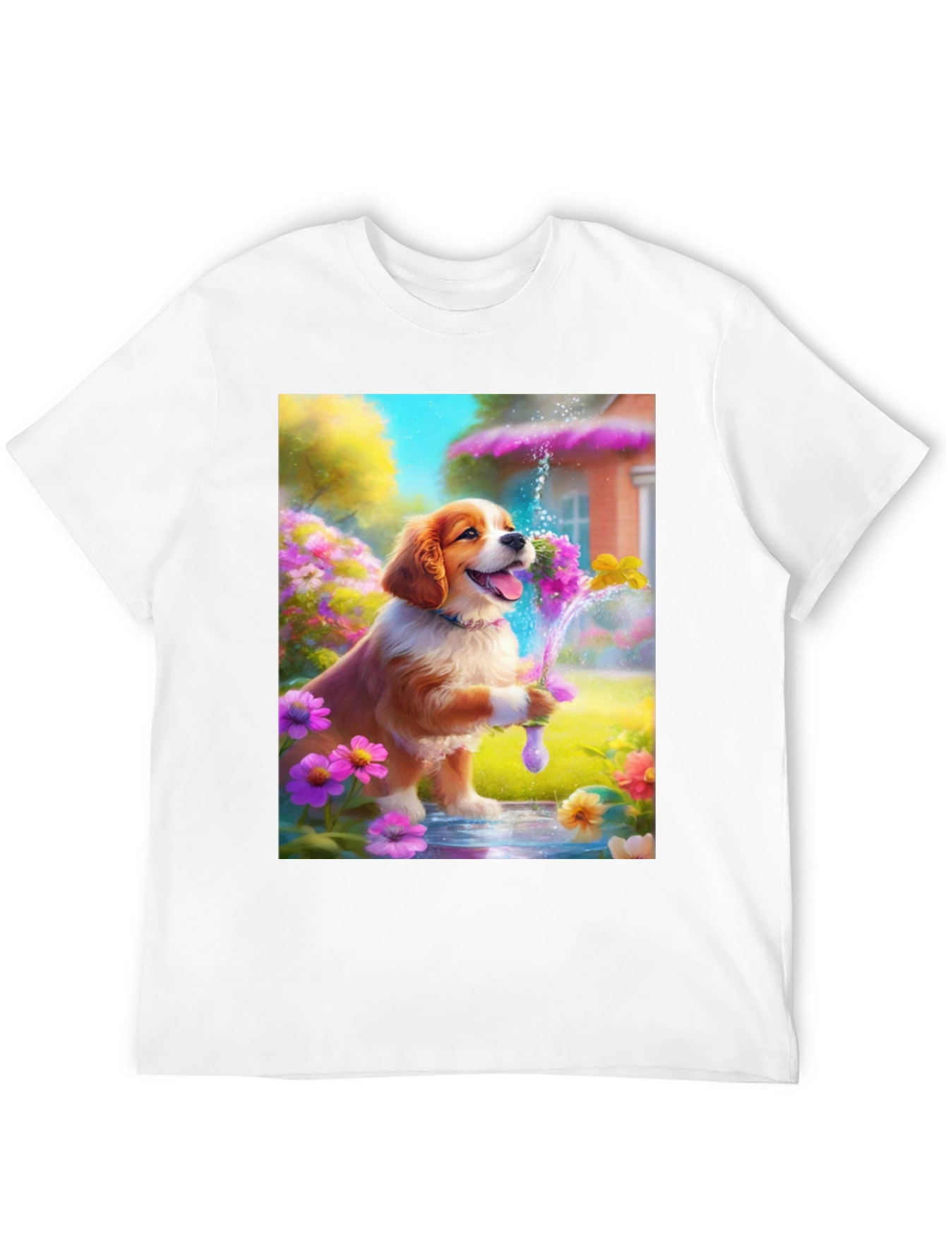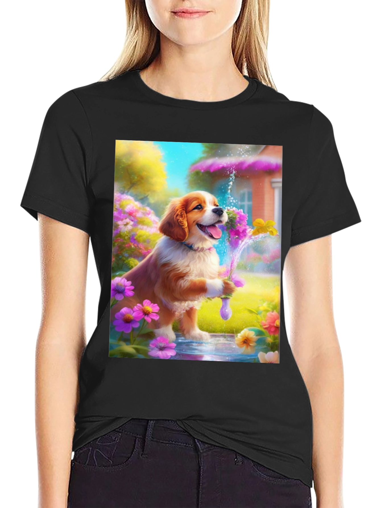 This black t-shirt features a vibrant and heartwarming graphic of a cute dog playing with colorful flowers in a whimsical garden. The design captures a joyful scene with the dog seemingly enjoying a splash of water amidst a backdrop of lush greenery and a charming house. Made from comfortable, breathable fabric, this tee is perfect for casual wear. The high-quality print ensures the colors remain vivid and the design stands out. Show off your love for dogs and vibrant art with this eye-catching tee, ideal for everyday outings or relaxed weekends. Get ready to turn heads and spread smiles!
