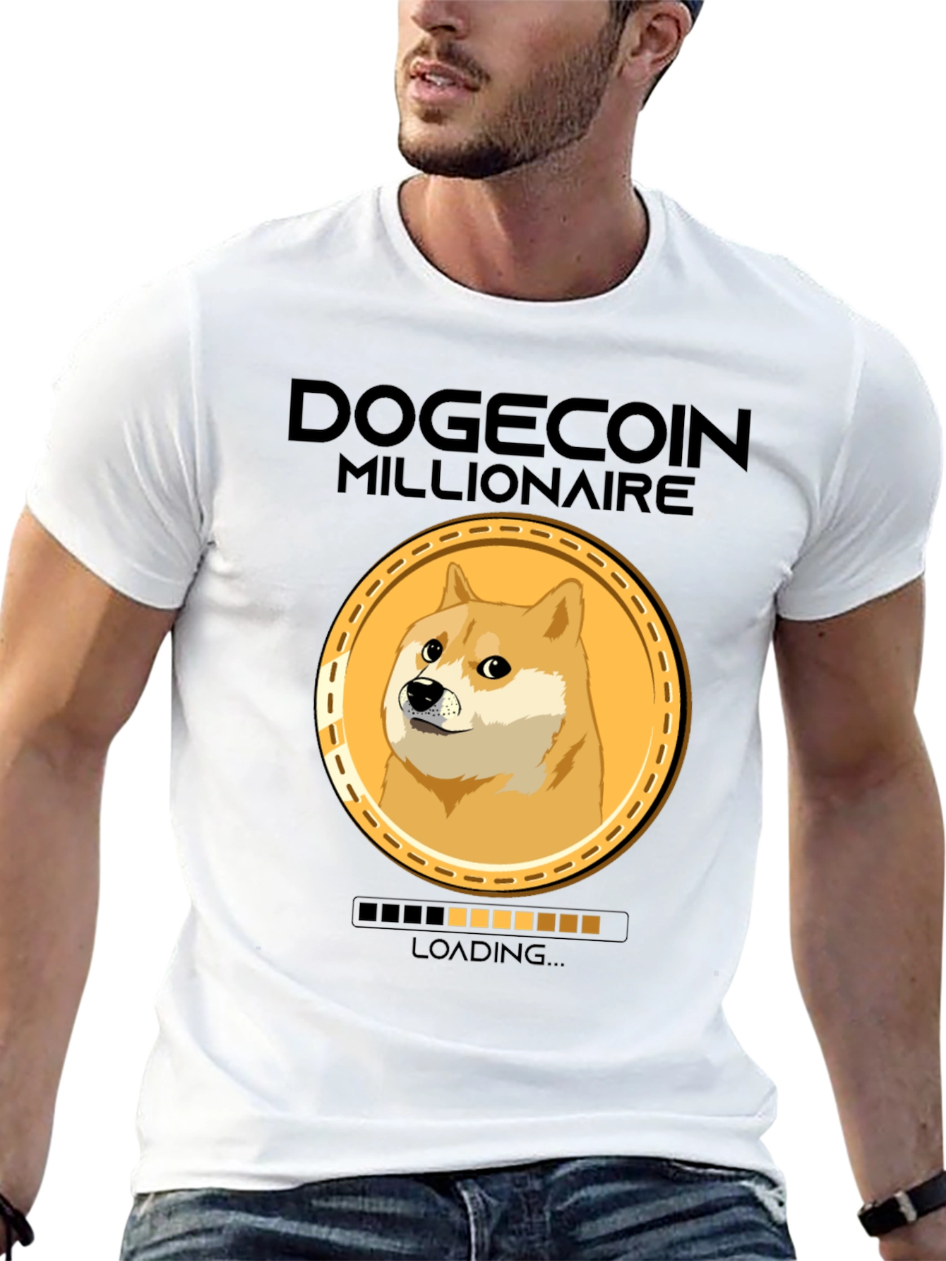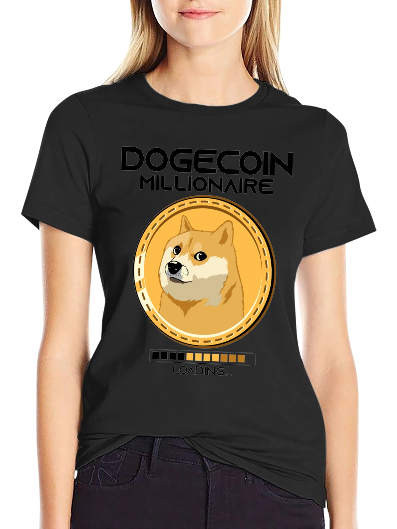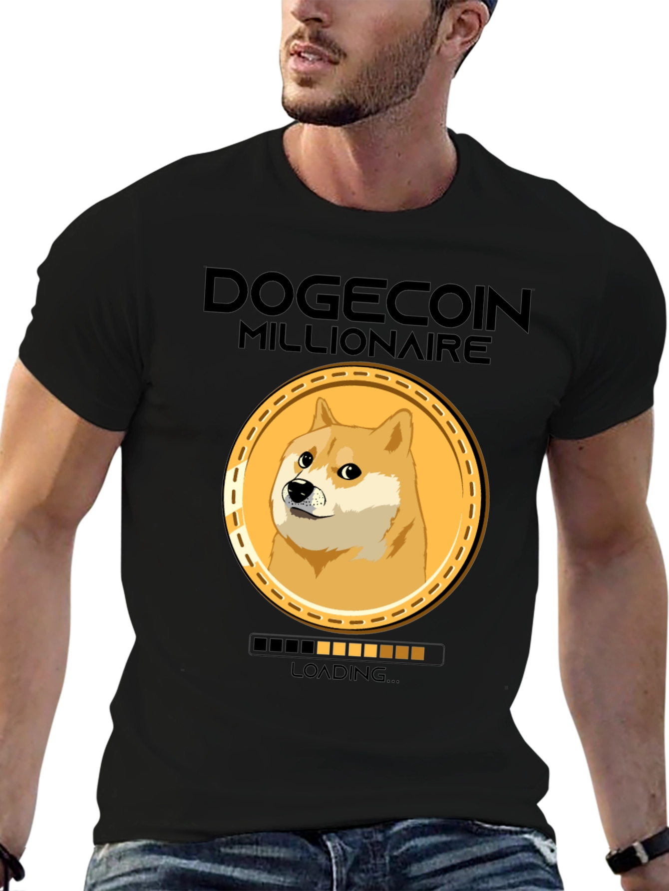 Show your love for crypto and Dogecoin with this funny and unique t-shirt! This black tee features a bold "DOGECOIN MILLIONAIRE" text graphic above a Doge coin design. Below the coin, a "LOADING..." bar adds a humorous touch. Made from a comfortable-looking fabric, this shirt is ideal for everyday wear, crypto meetups, or casual outings. It's a great conversation starter and a fun way to express your passion for Dogecoin. Get yours today and show the world you're on your way to becoming a Dogecoin Millionaire!