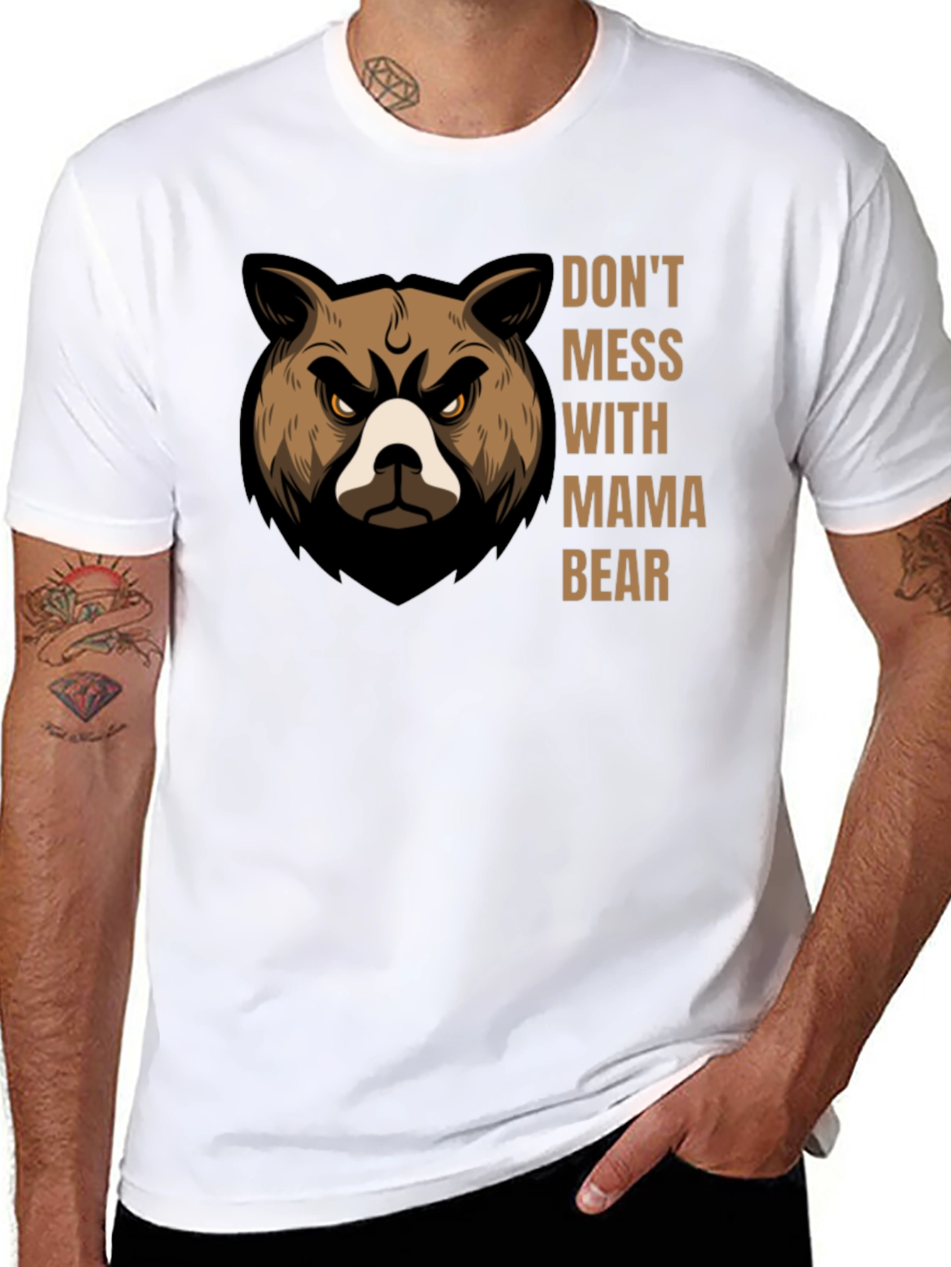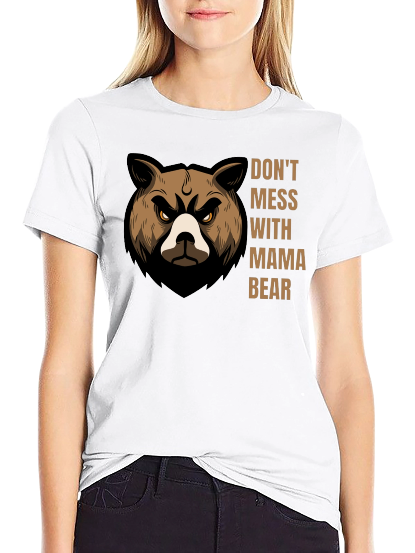 Show off your fierce side with this bold graphic t-shirt. Featuring a striking "Don't Mess With Mama Bear" design alongside an illustration of an angry-looking bear, this shirt makes a statement. The design is printed on a classic black tee, perfect for casual wear. Made from a comfortable fabric blend, it offers a great fit and feel. Ideal for moms who want to show their protective nature or anyone with a strong personality. Wear it out with jeans, to a casual gathering, or simply as a fun everyday piece.
