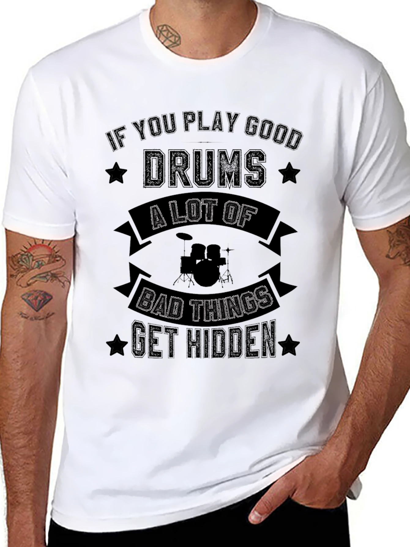 Rock out in style with this black graphic tee featuring a unique design for drummers. The shirt proclaims 'If You Play Good Drums A Lot of Bad Things Get Hidden', adorned with stars and an image of a drum kit. Made from a soft-looking fabric, this tee offers both comfort and style. Its classic fit and short sleeves make it perfect for casual wear, band practice, or showing off your passion for drumming. Whether you're a seasoned drummer or just a music enthusiast, this t-shirt is sure to make a statement. It's a great gift for the musician in your life!