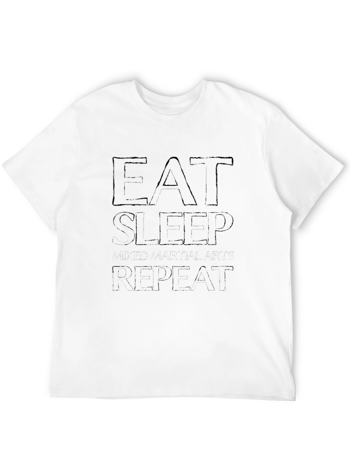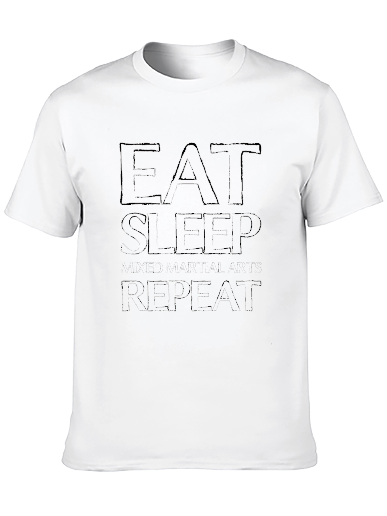 This black t-shirt features a bold and eye-catching "Eat Sleep Mixed Martial Arts Repeat" graphic design. Constructed from what appears to be soft and comfortable cotton or a cotton blend, this tee offers a relaxed fit suitable for everyday wear. The design is slightly distressed, giving it a vintage or worn-in aesthetic that adds to its appeal. Ideal for MMA enthusiasts or anyone with a passion for martial arts, this shirt is perfect for casual outings, gym sessions, or simply lounging at home. Show off your dedication to the sport with this stylish and comfortable graphic tee.