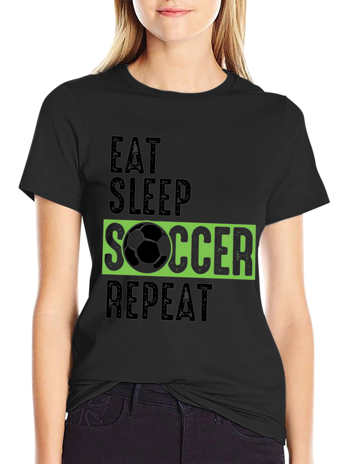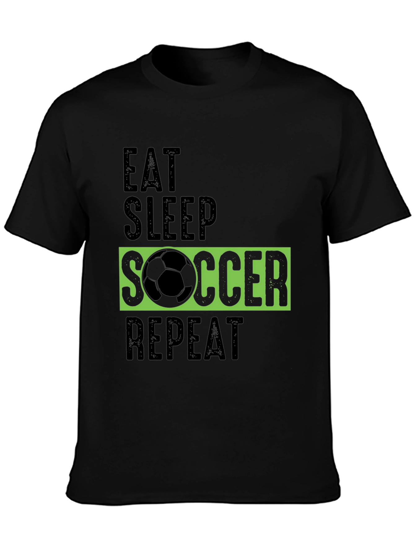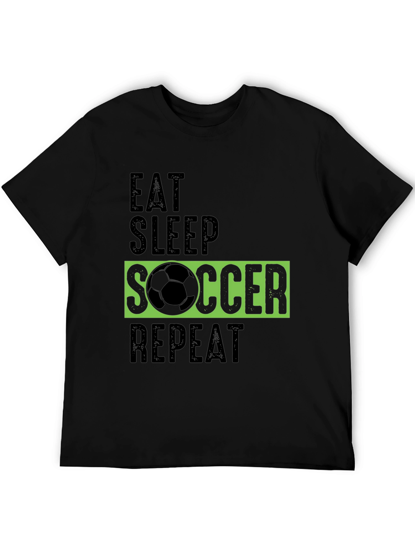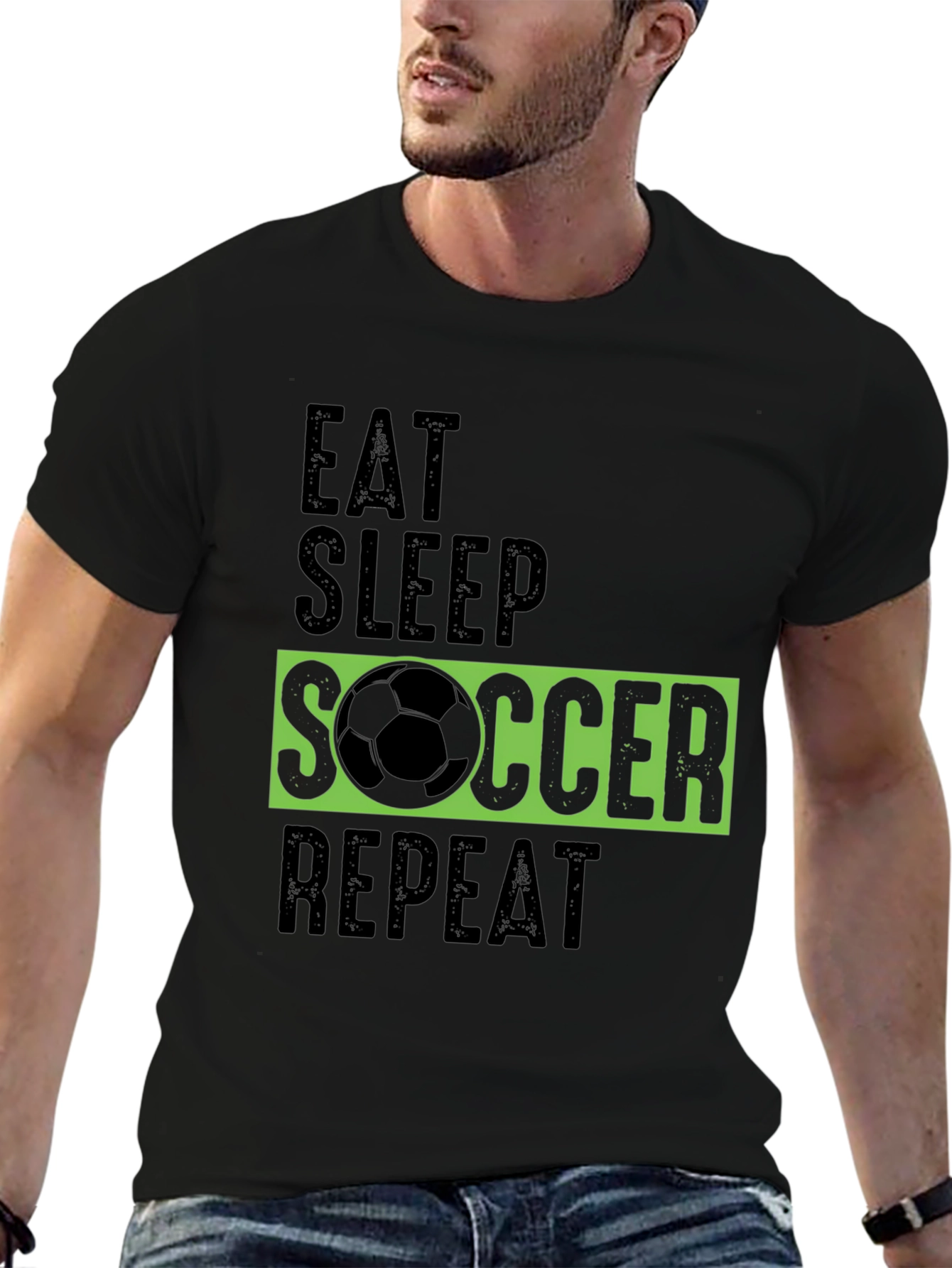 This stylish black t-shirt features a bold "Eat Sleep Soccer Repeat" graphic. The design incorporates a soccer ball within a vibrant green rectangular highlight, creating a visually appealing and sporty look. Made from what appears to be a soft, comfortable cotton blend, this tee is perfect for soccer players and fans alike. Its relaxed fit makes it ideal for casual wear, workouts, or showing your love for the game on and off the field. Grab this tee and let everyone know soccer is your life!