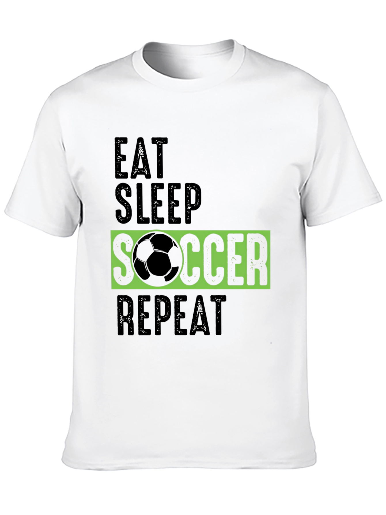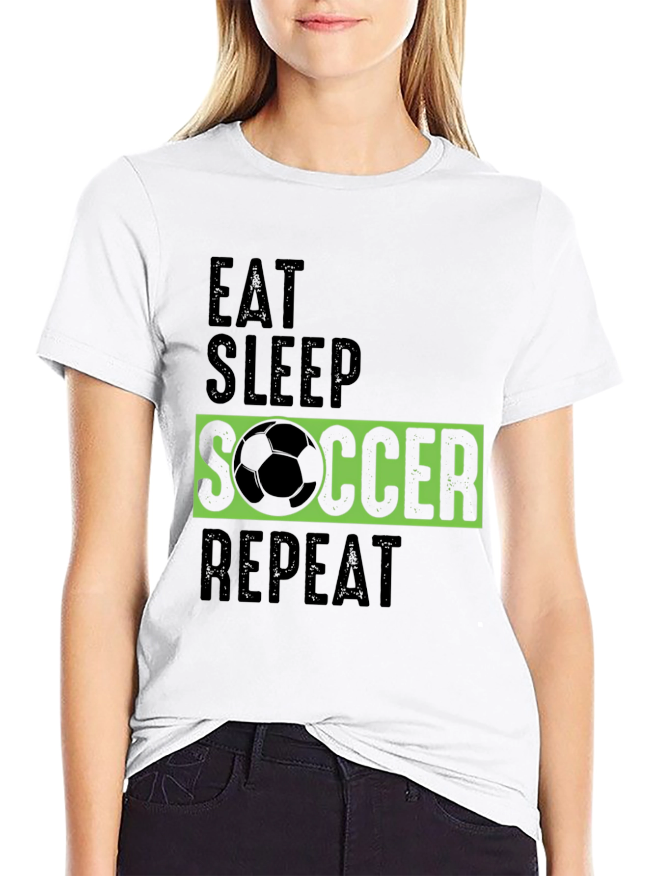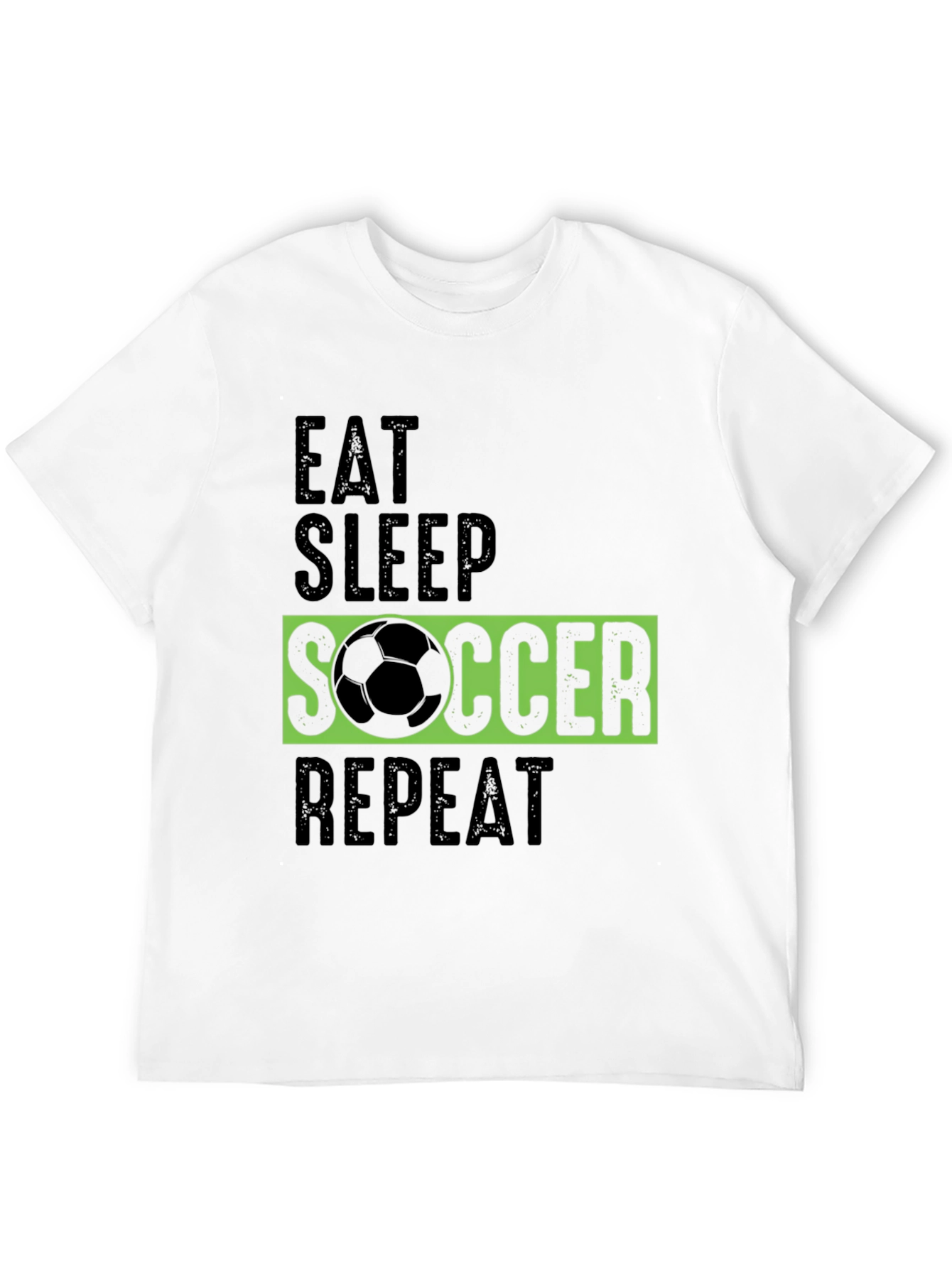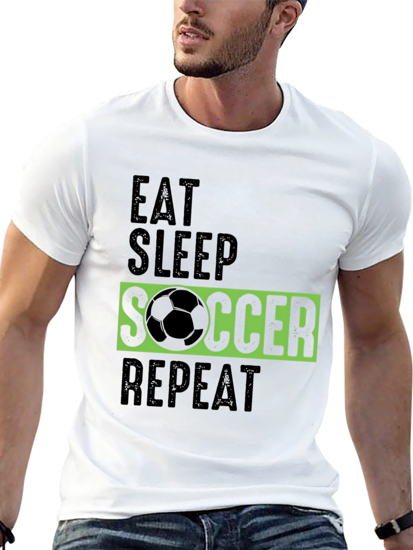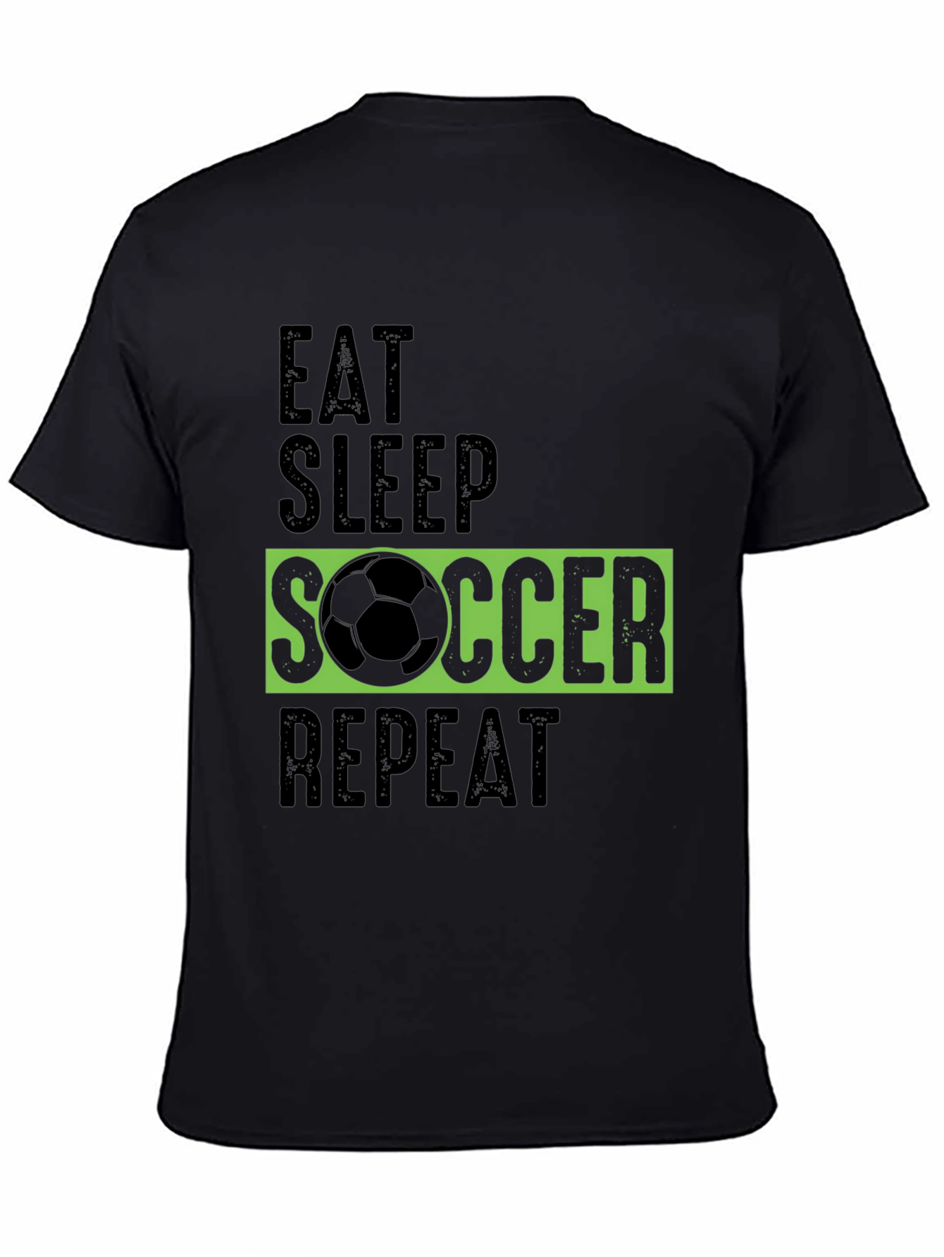 This stylish black t-shirt features a bold "Eat Sleep Soccer Repeat" graphic. The design incorporates a soccer ball within a vibrant green rectangular highlight, creating a visually appealing and sporty look. Made from what appears to be a soft, comfortable cotton blend, this tee is perfect for soccer players and fans alike. Its relaxed fit makes it ideal for casual wear, workouts, or showing your love for the game on and off the field. Grab this tee and let everyone know soccer is your life!