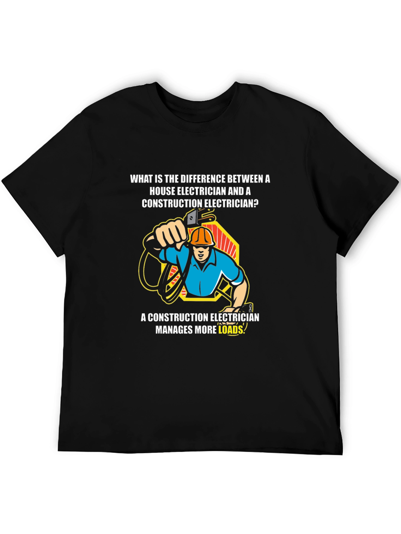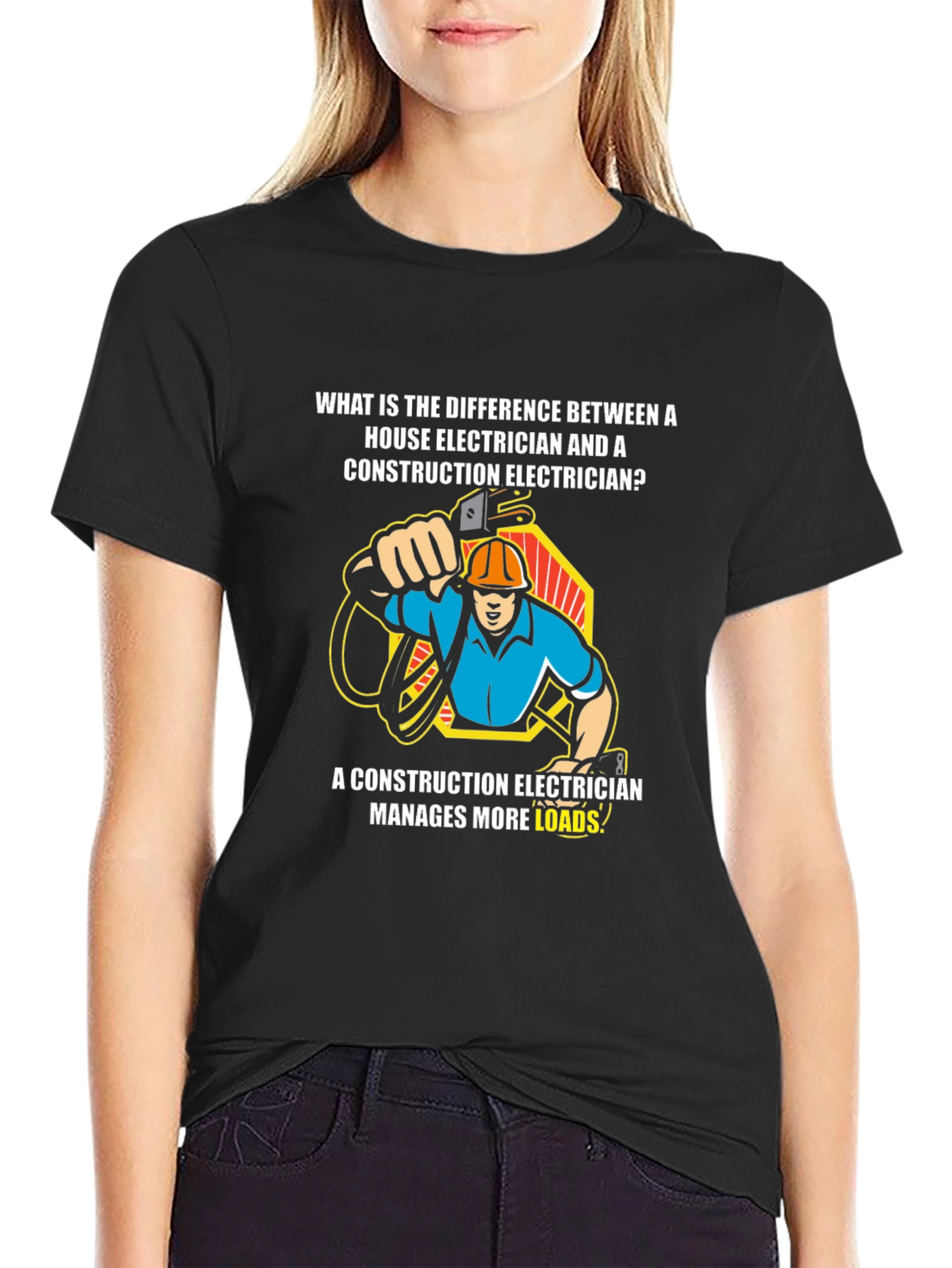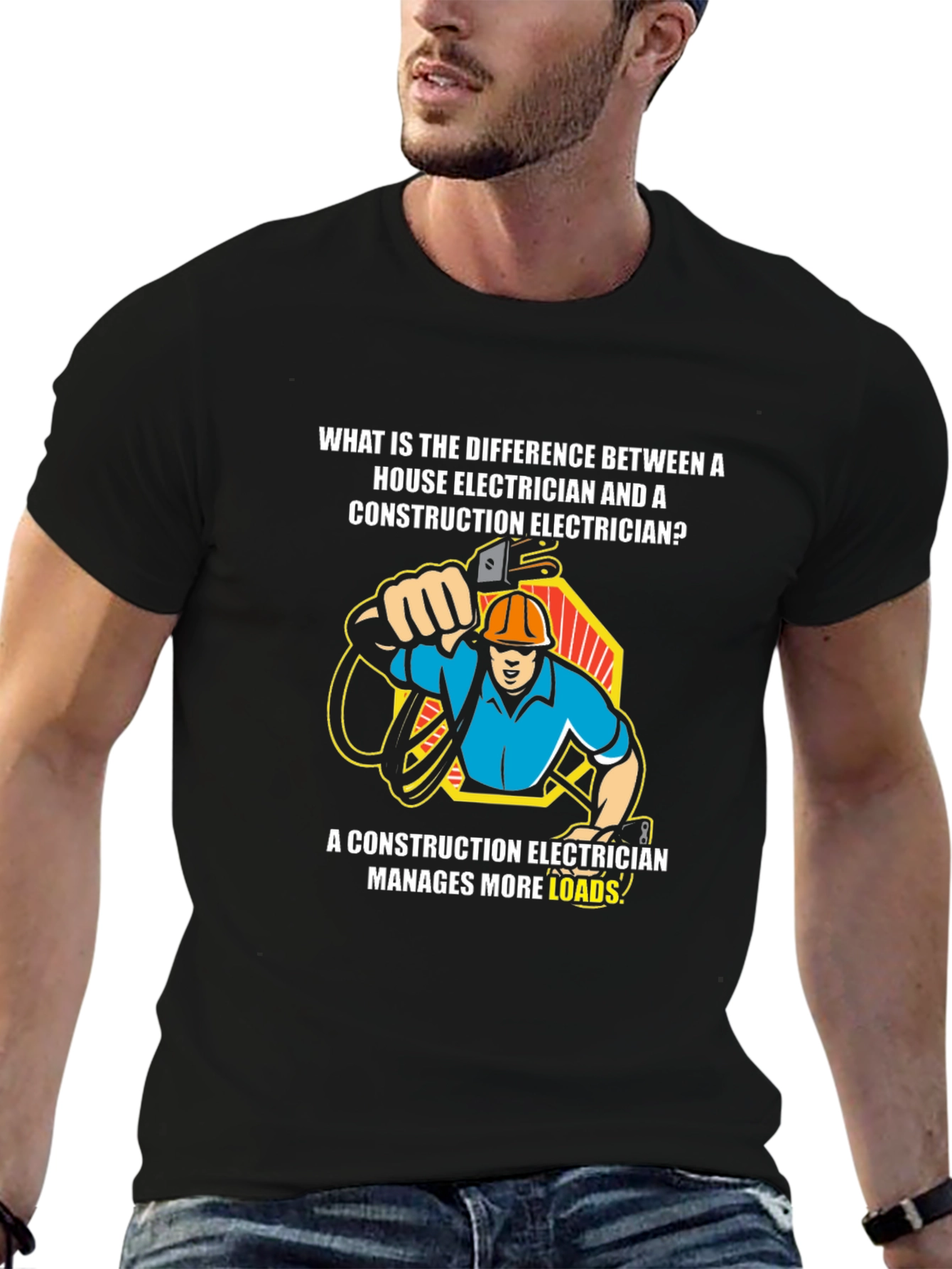 This black t-shirt features a humorous electrician joke, making it a fun and unique addition to any wardrobe. The shirt showcases a cartoon graphic of an electrician, complete with a hard hat and tools. The joke text adds a playful element, sparking conversation and laughter. Made from a comfortable-looking fabric, this shirt is suitable for everyday wear. Its casual style makes it perfect for relaxed outings, DIY projects, or as a lighthearted gift for the electricians in your life. Show off your personality and love for humor with this eye-catching tee.
