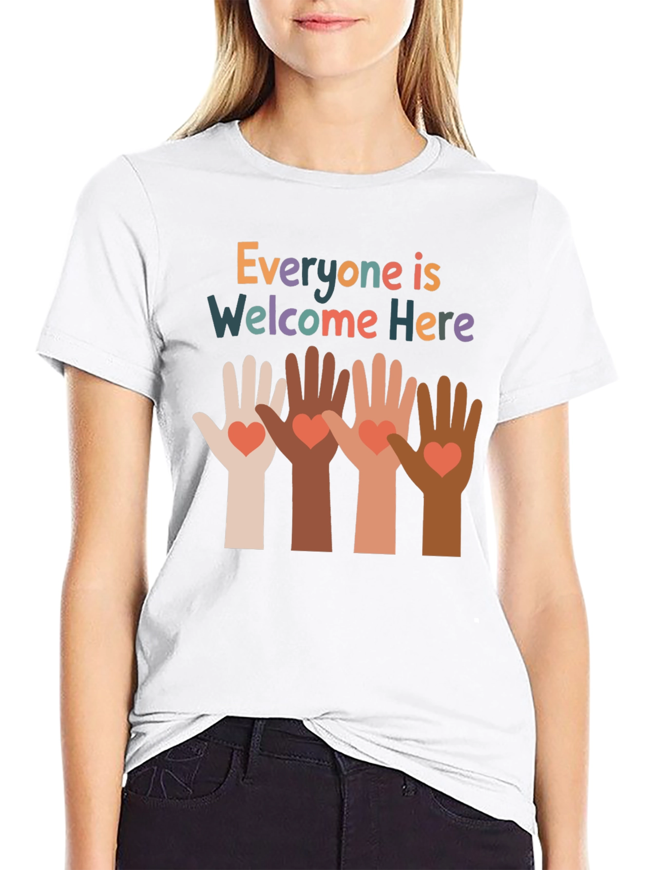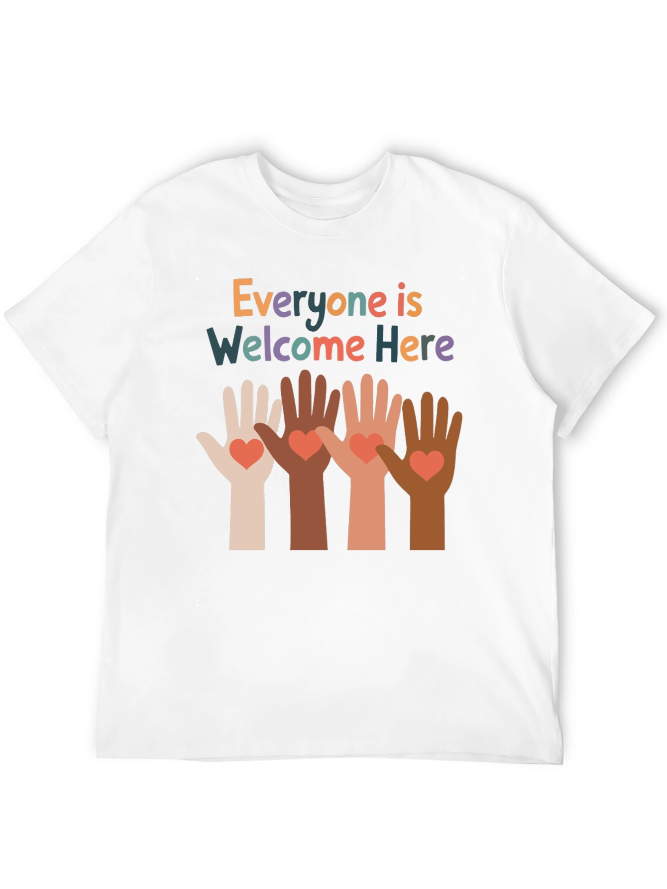 Show your support for inclusivity with this stylish black t-shirt. The tee features a vibrant graphic with the words 'Everyone is Welcome Here' in cheerful, multicolored lettering. Below, four diverse hands are raised, each displaying a heart, symbolizing love and acceptance. Made from a comfortable-looking fabric, this t-shirt is perfect for casual wear, events, or making a statement wherever you go. This tee is not only a fashion choice but also a powerful message of unity and belonging. Great for everyday wear, social gatherings, or as a thoughtful gift.