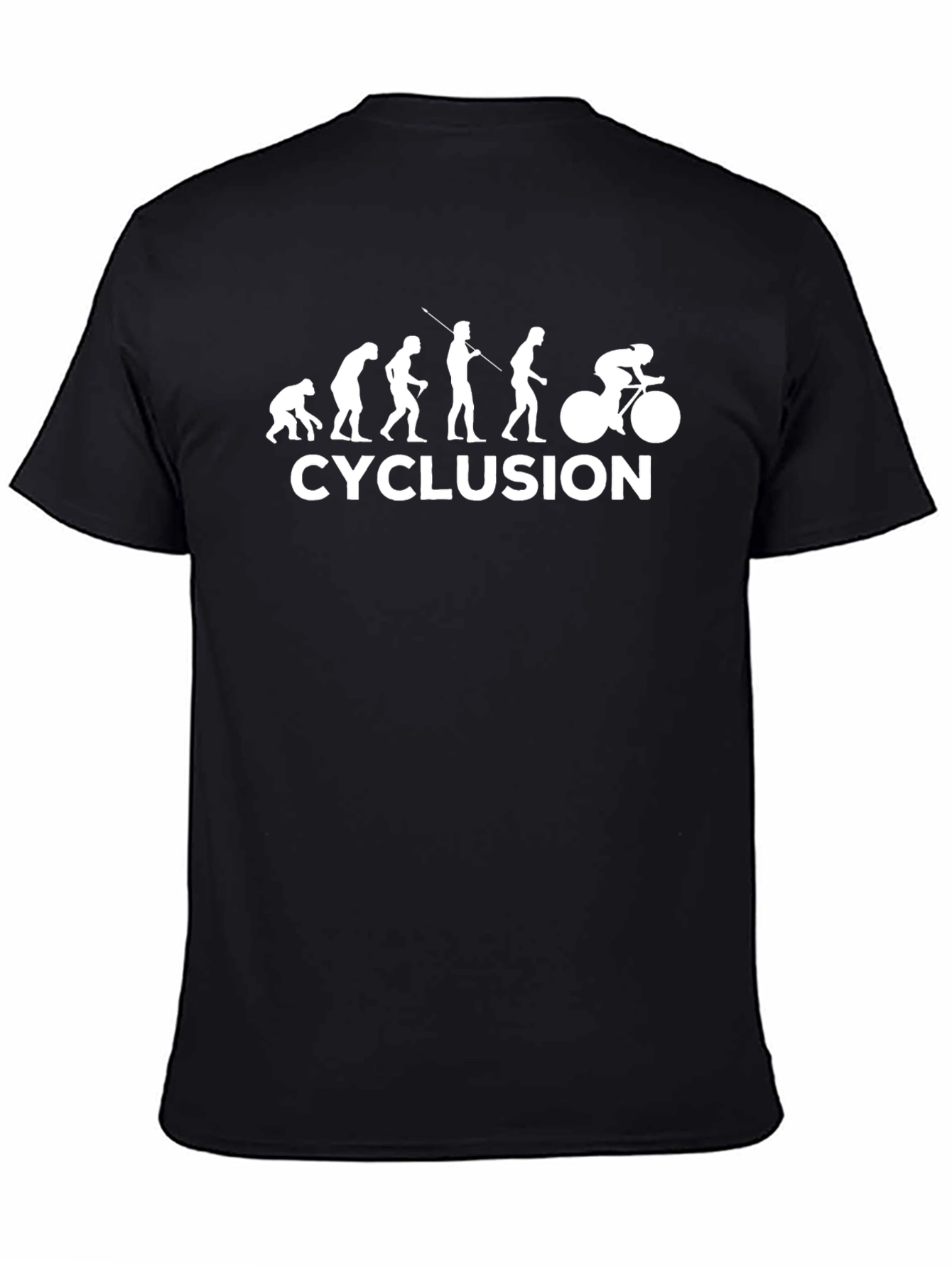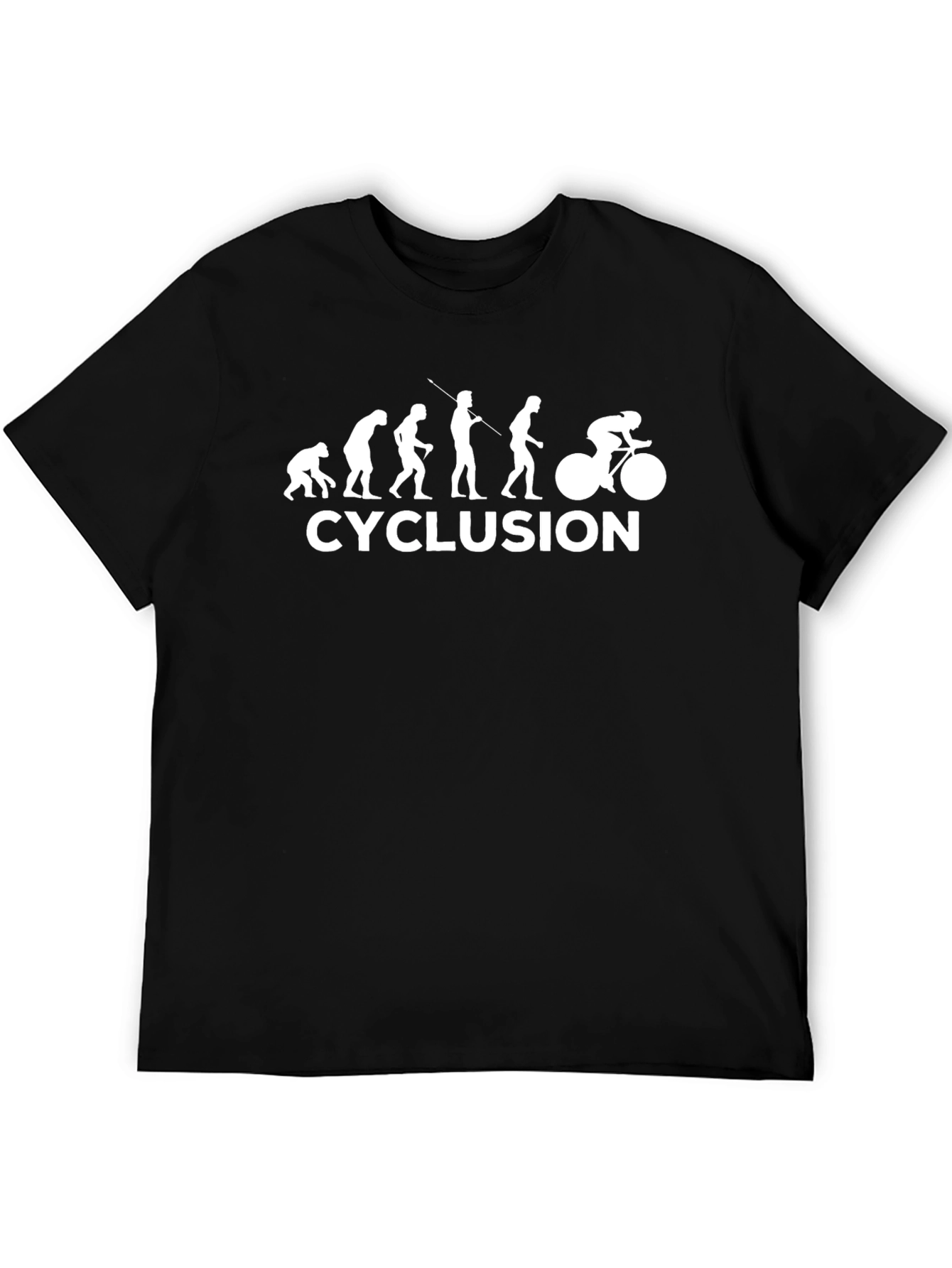 Show off your love for cycling with this unique black t-shirt. The shirt features a creative white graphic depicting the evolution of humans into a cyclist. This eye-catching design is sure to spark conversation and showcase your passion for the sport. Made from comfortable, breathable fabric, this t-shirt is perfect for everyday wear, workouts, or casual outings. Its classic fit and durable construction ensure long-lasting comfort and style. Whether you're hitting the trails or simply relaxing, this cycling evolution tee is a must-have addition to any cyclist's wardrobe.