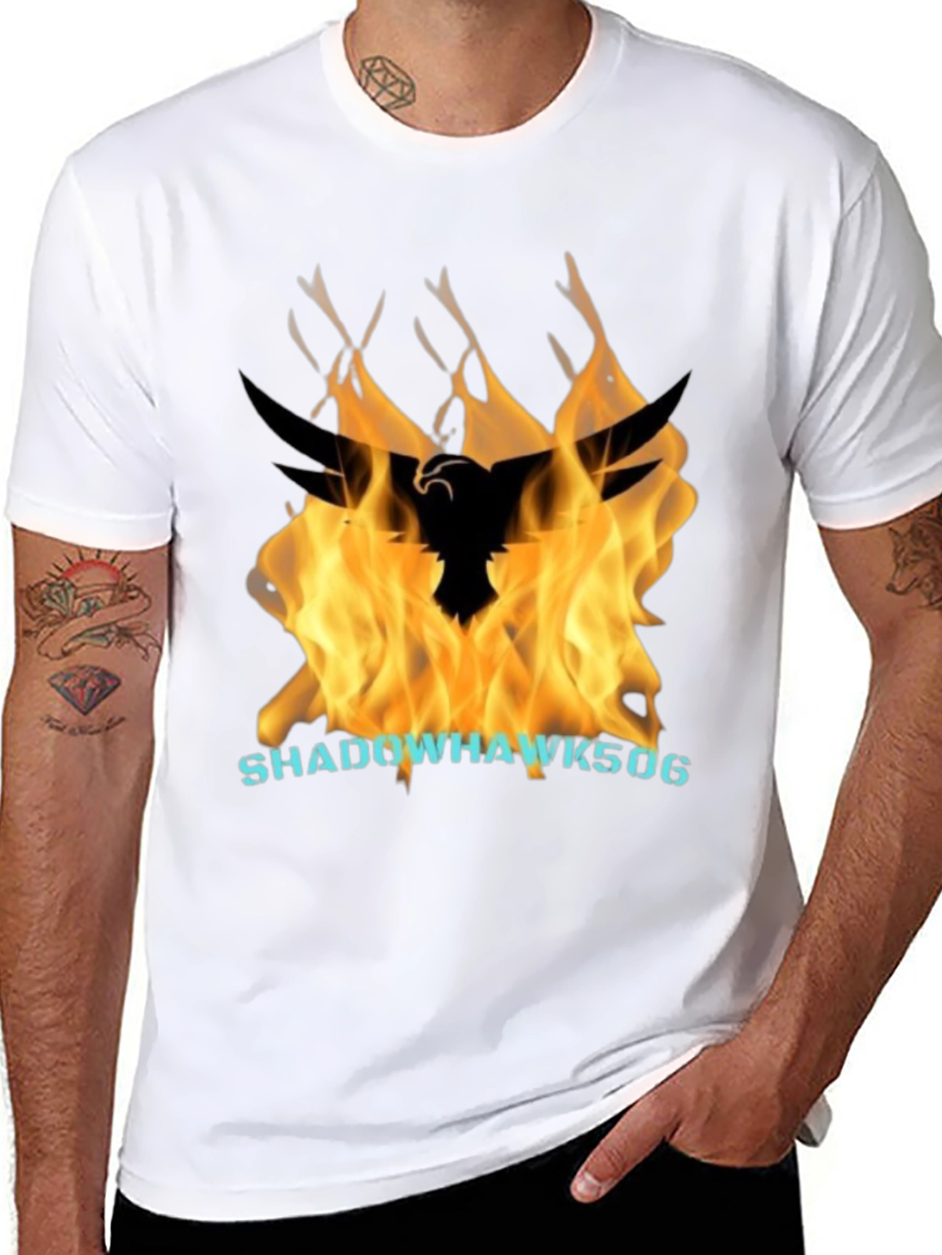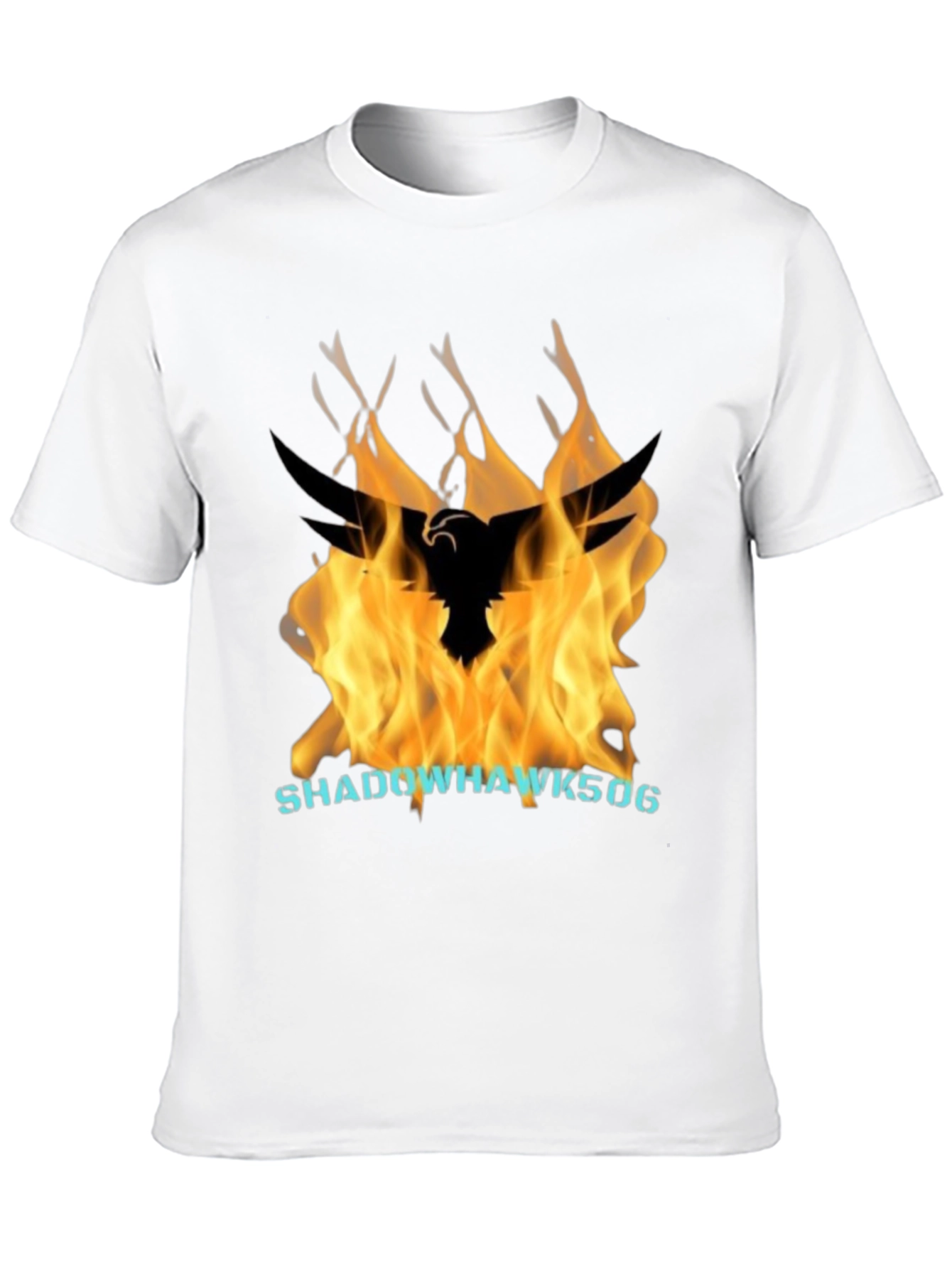 Elevate your style with this striking black t-shirt featuring a bold graphic print. A shadowhawk design leaps from a vibrant flame background, making a powerful statement. The design is complemented by a bright name graphic. Crafted from a comfortable, breathable fabric, this tee is perfect for casual wear or making a bold impression. The classic crew neck and short sleeves offer a relaxed fit suitable for everyday activities. Wear your passions proudly with this eye-catching Shadowhawk tee.