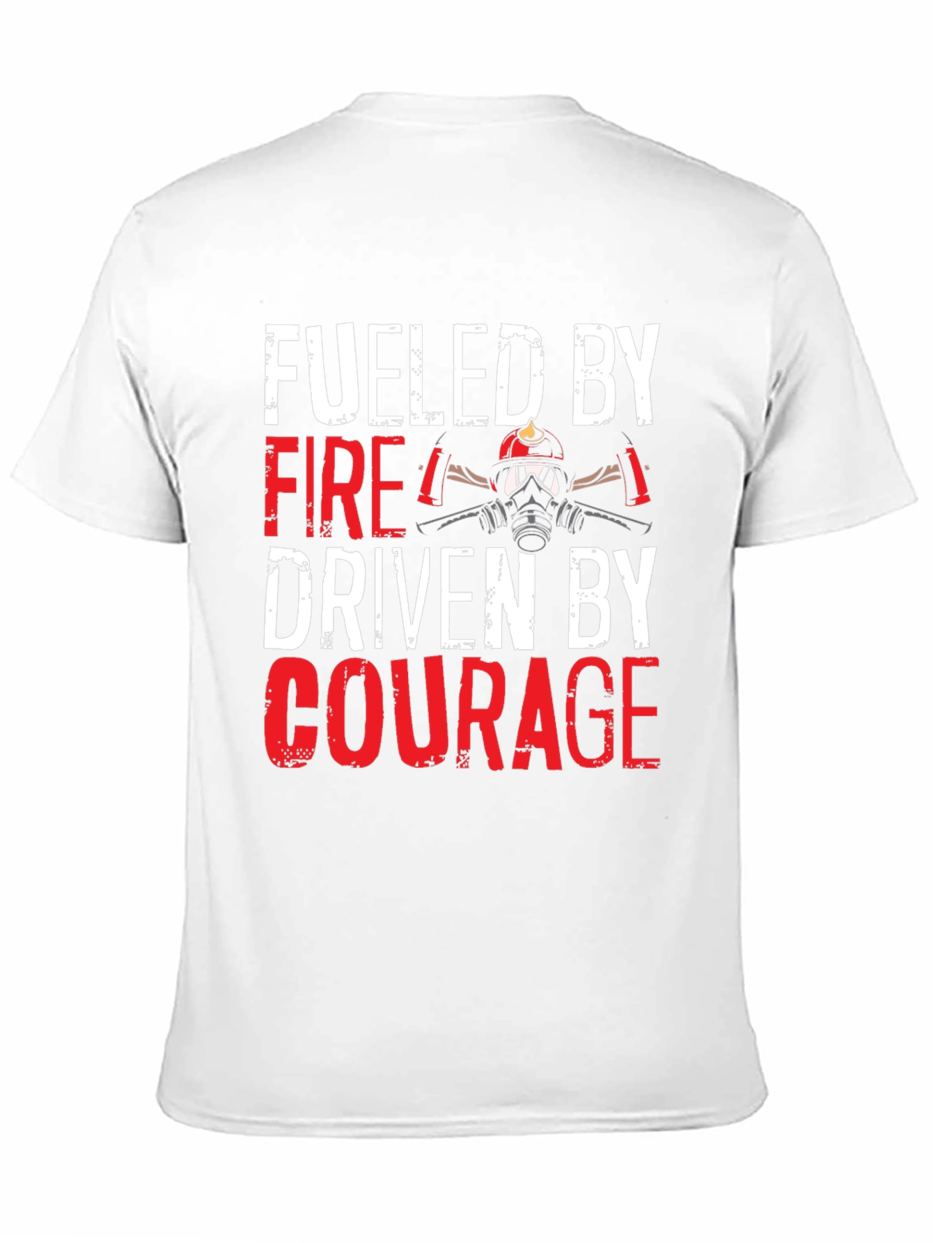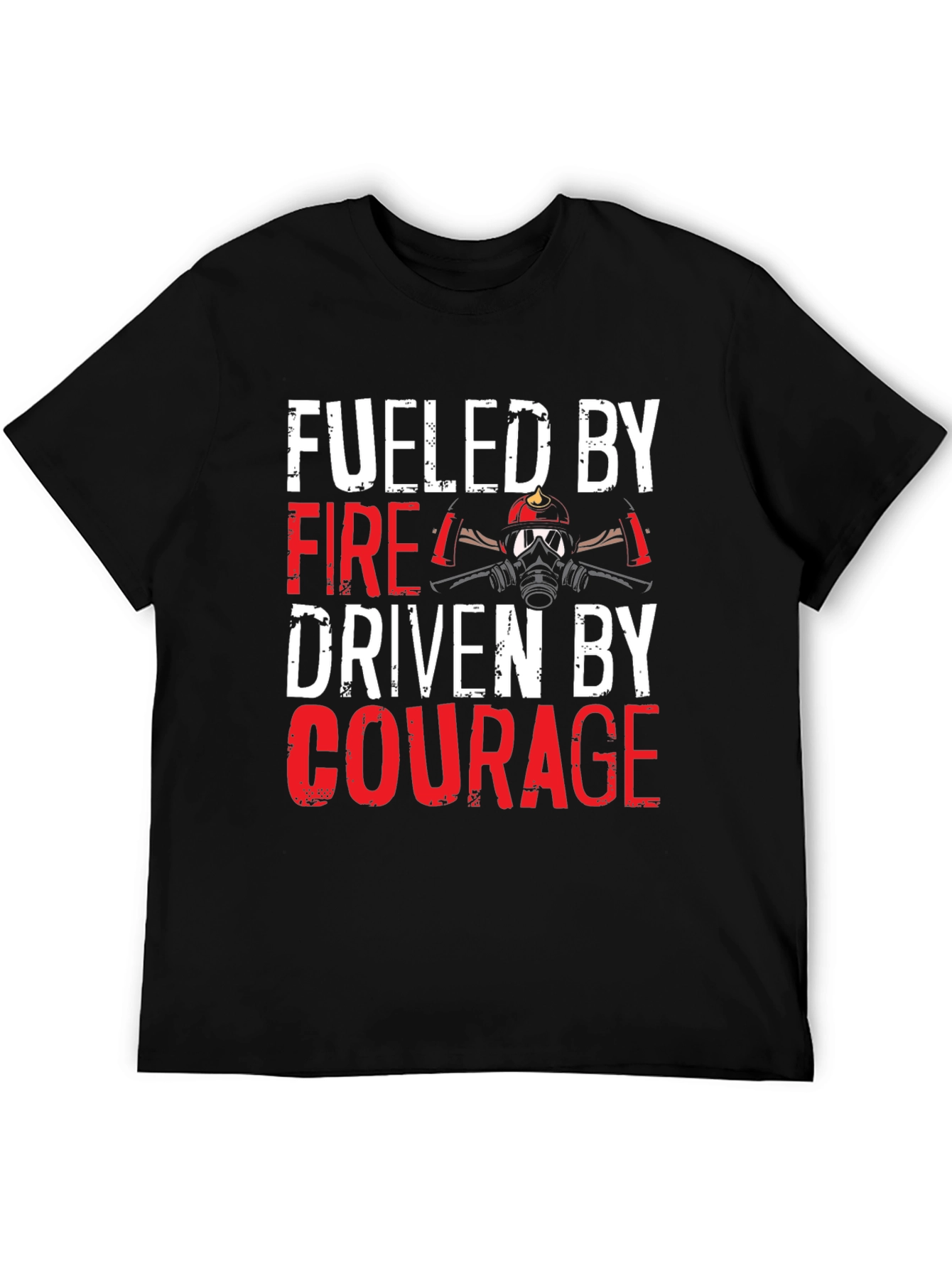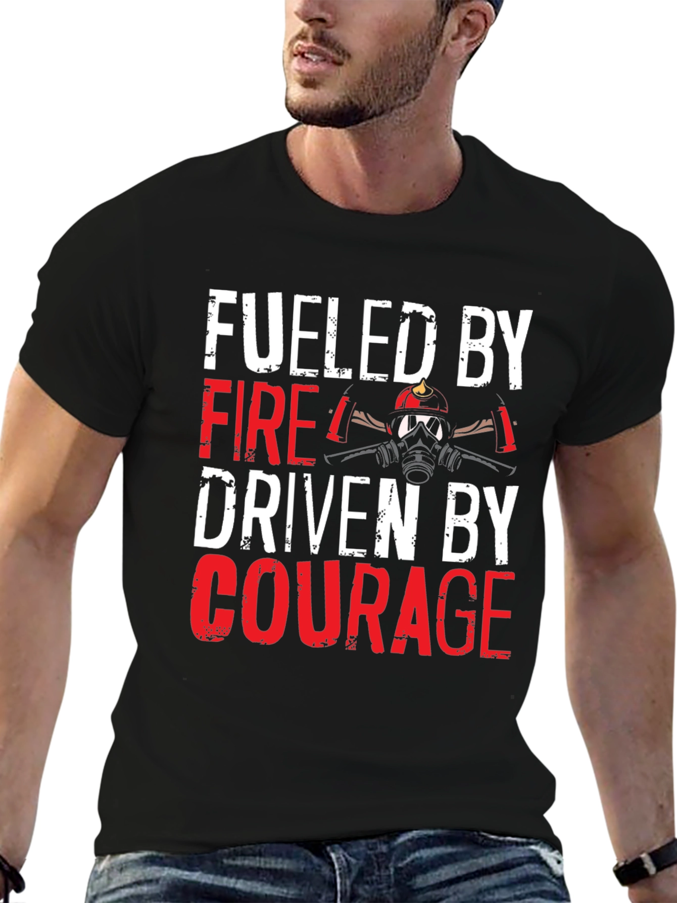 Show your support for firefighters with this bold black t-shirt! The graphic features the words "Fueled by Fire, Driven by Courage" in a striking red and white font, with a firefighter helmet and mask illustration. Made from comfortable fabric, this tee is perfect for everyday wear or showing your appreciation for the brave men and women who protect our communities. Ideal for firefighters, their families, or anyone who admires their dedication. A great way to display pride and honor those who risk their lives for others.