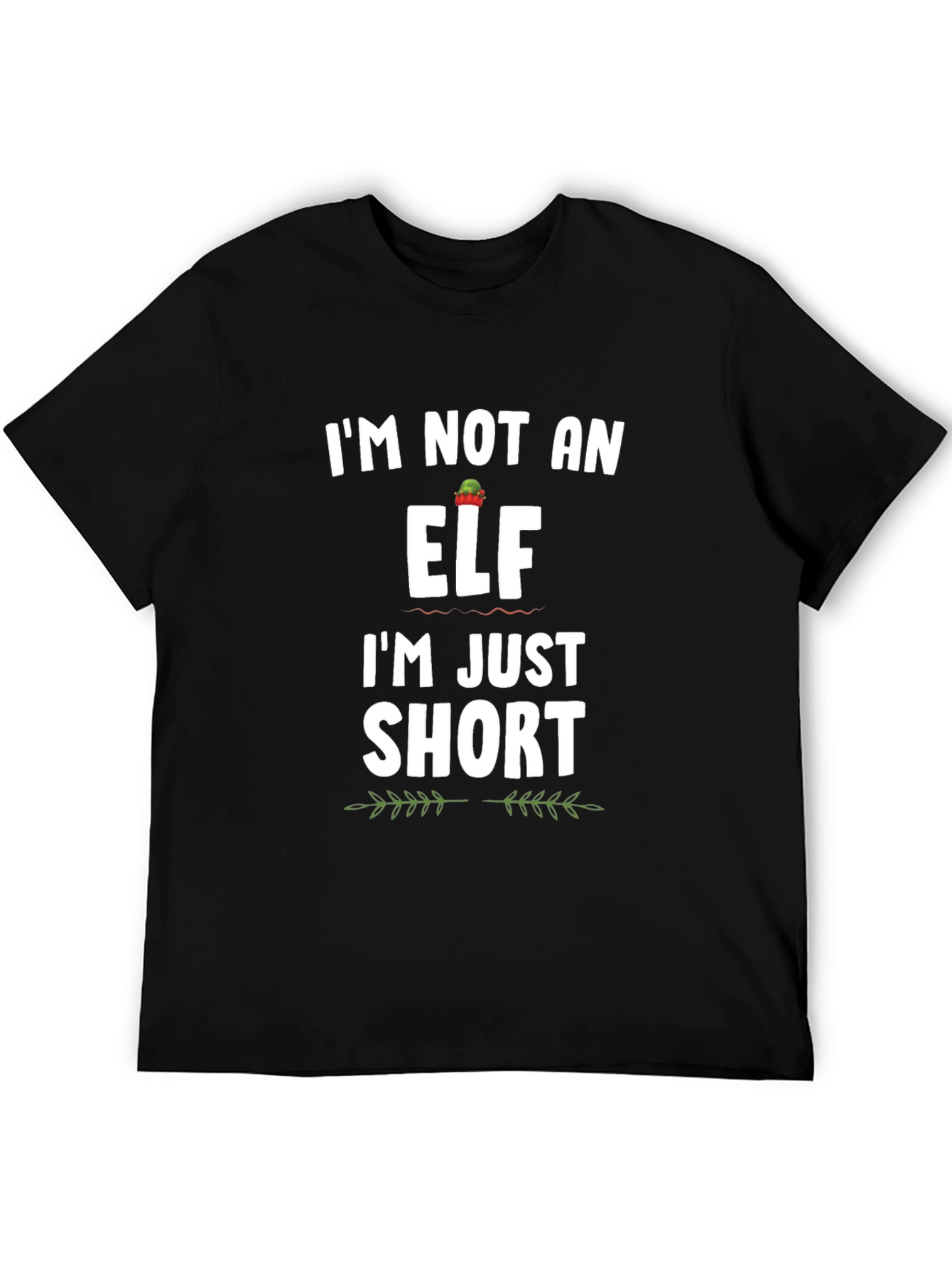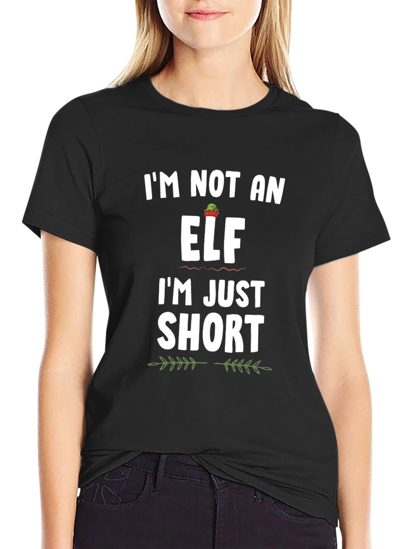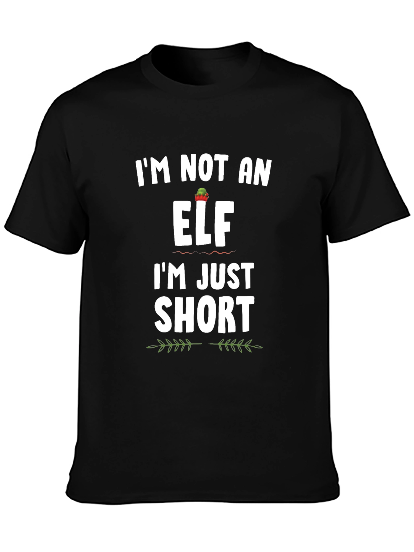 This playful black t-shirt features the phrase "I'M NOT AN ELF I'M JUST SHORT" in bold, white lettering. A cute green elf hat accents the word "ELF", adding a touch of holiday spirit. The graphic is finished with decorative sprigs underlining the text. Made from a comfortable fabric, this tee is perfect for casual wear during the festive season. Show off your humor and embrace your height with this fun and witty shirt. It's ideal for Christmas parties, family gatherings, or simply spreading holiday cheer wherever you go. Makes a great gift for anyone with a good sense of humor and a petite stature.