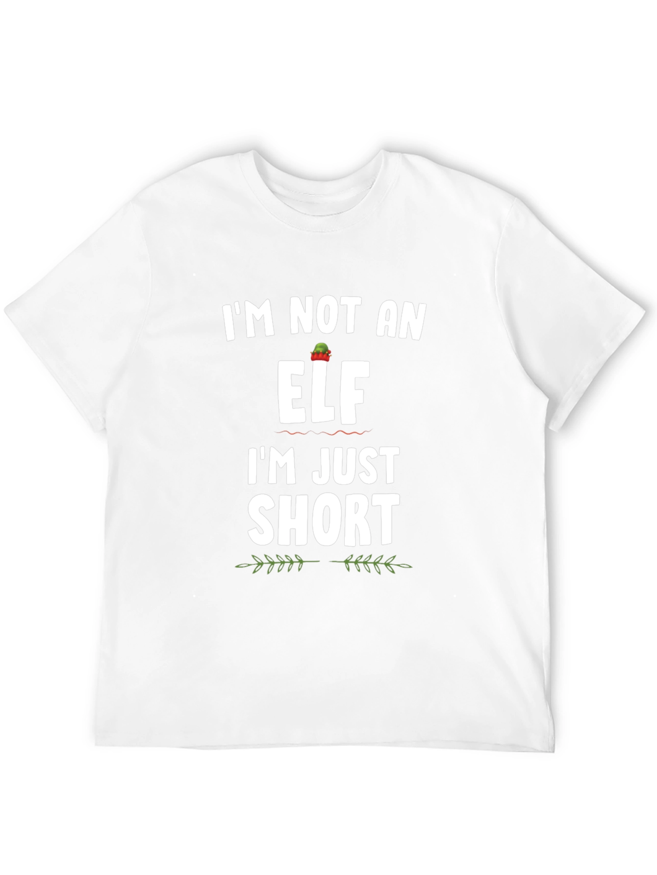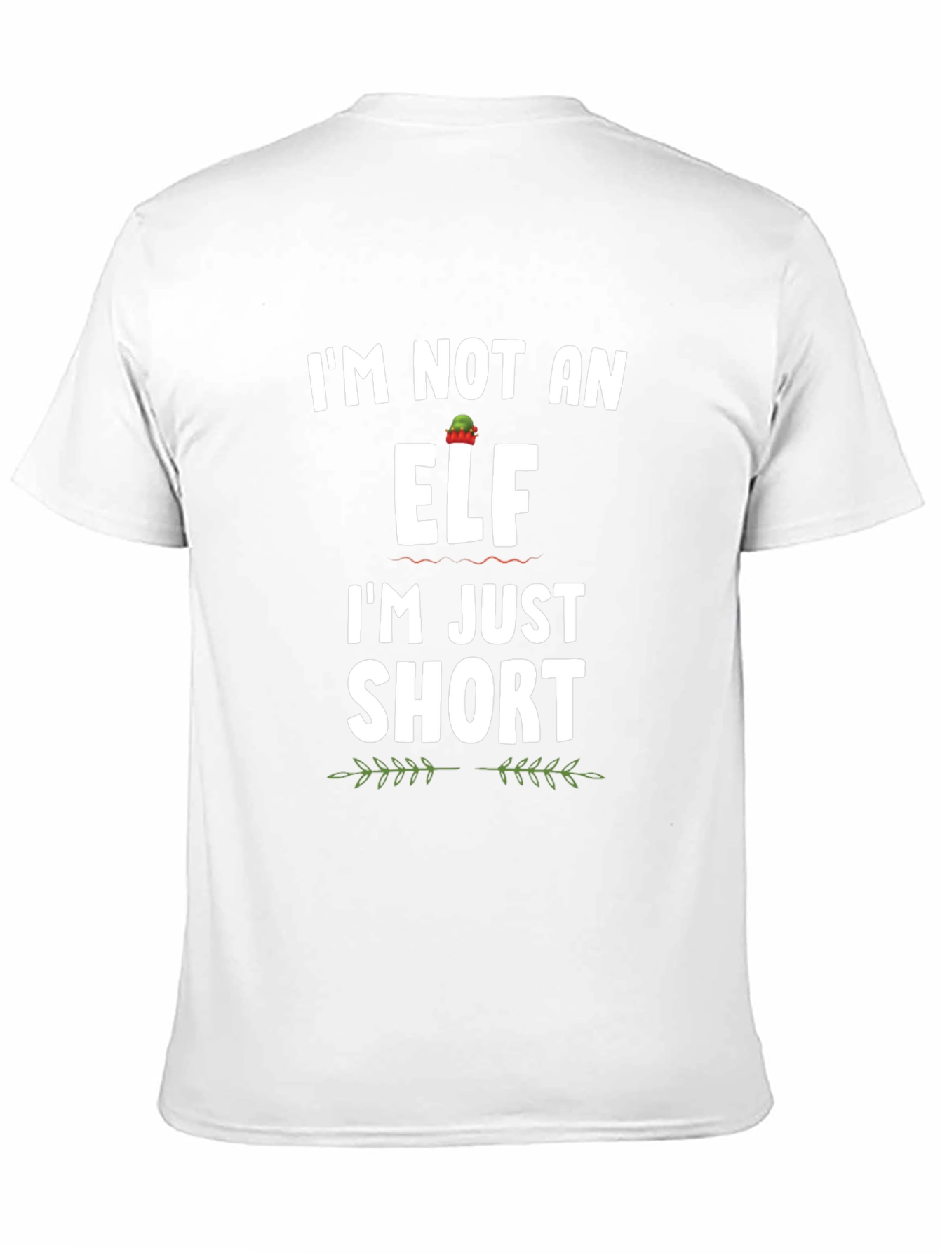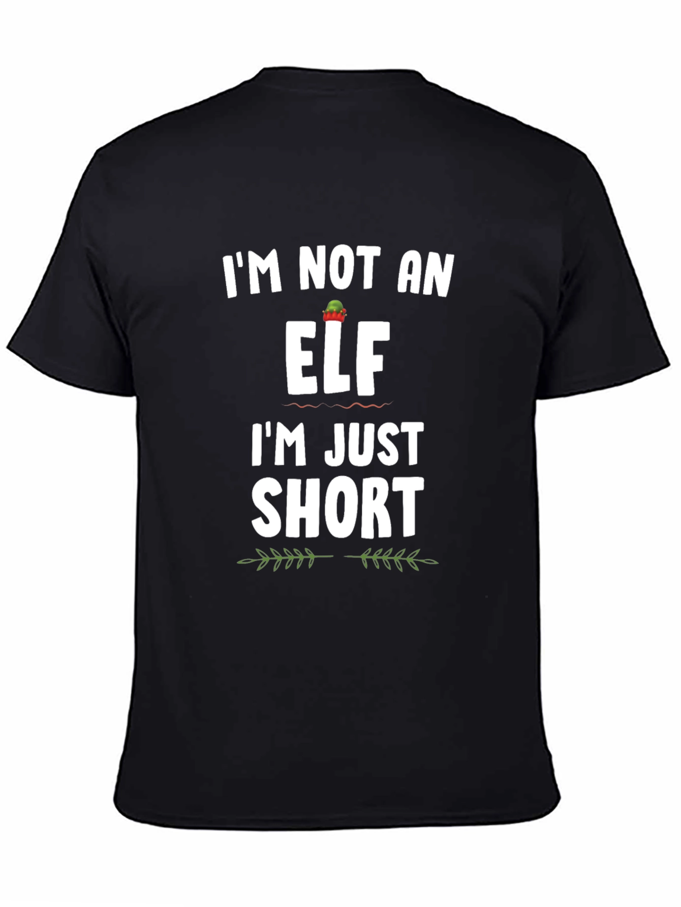 This playful black t-shirt features the phrase "I'M NOT AN ELF I'M JUST SHORT" in bold, white lettering. A cute green elf hat accents the word "ELF", adding a touch of holiday spirit. The graphic is finished with decorative sprigs underlining the text. Made from a comfortable fabric, this tee is perfect for casual wear during the festive season. Show off your humor and embrace your height with this fun and witty shirt. It's ideal for Christmas parties, family gatherings, or simply spreading holiday cheer wherever you go. Makes a great gift for anyone with a good sense of humor and a petite stature.