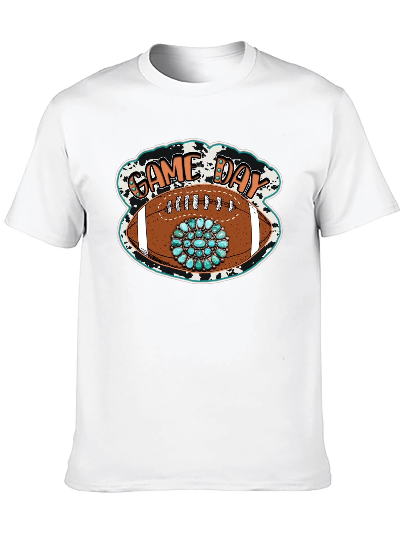 Show your love for football with this eye-catching graphic tee! This black T-shirt features a unique design of a football adorned with turquoise accents, adding a touch of rustic charm. The words "Game Day" are creatively integrated into the design, making it perfect for game days, tailgates, or casual wear. Made from comfortable, breathable fabric, this T-shirt offers a relaxed fit for all-day comfort. Whether you're cheering from the stands or watching the game at home, this T-shirt is a stylish way to support your favorite team. Stand out and make a statement with this one-of-a-kind football-themed tee.