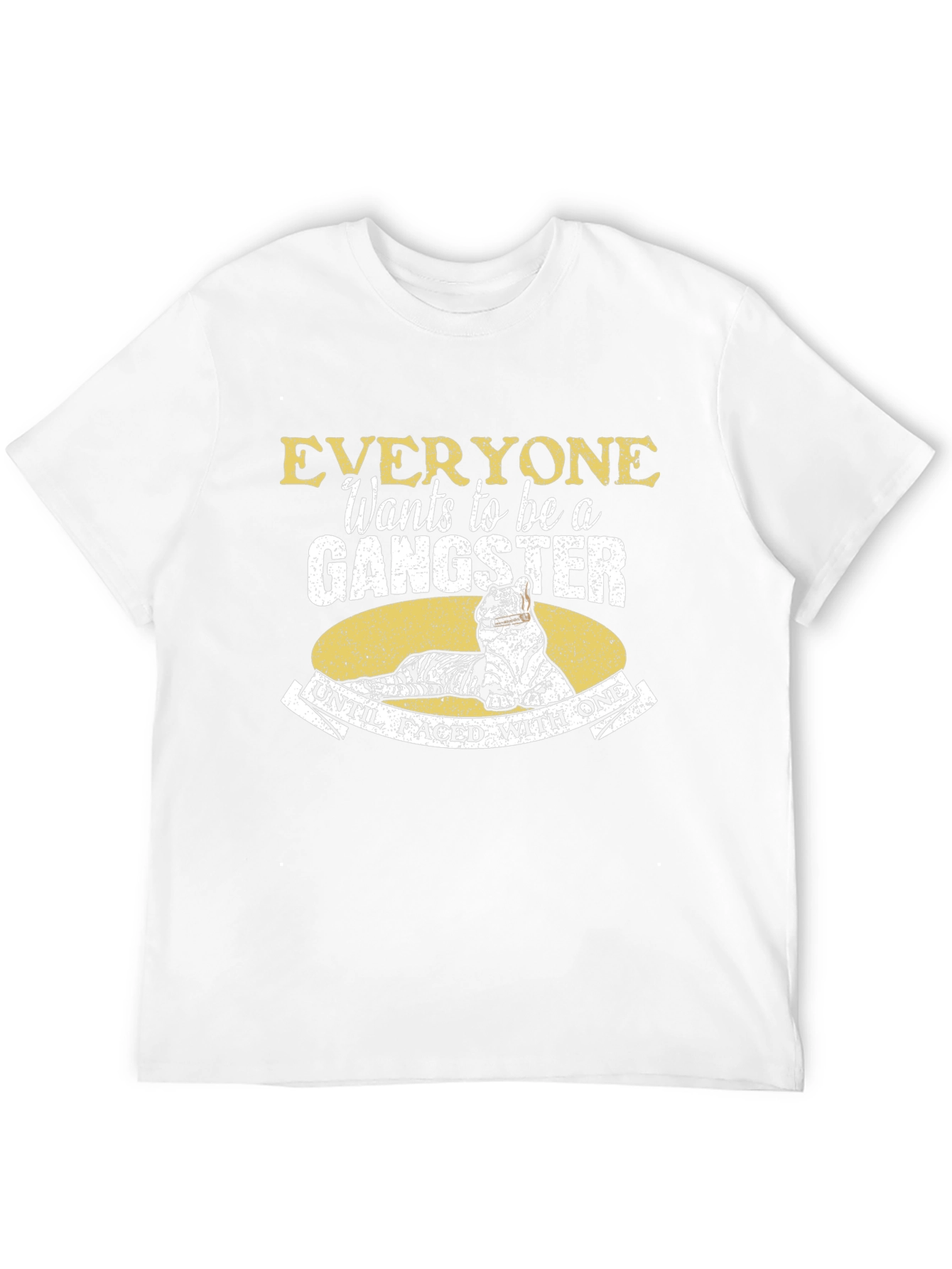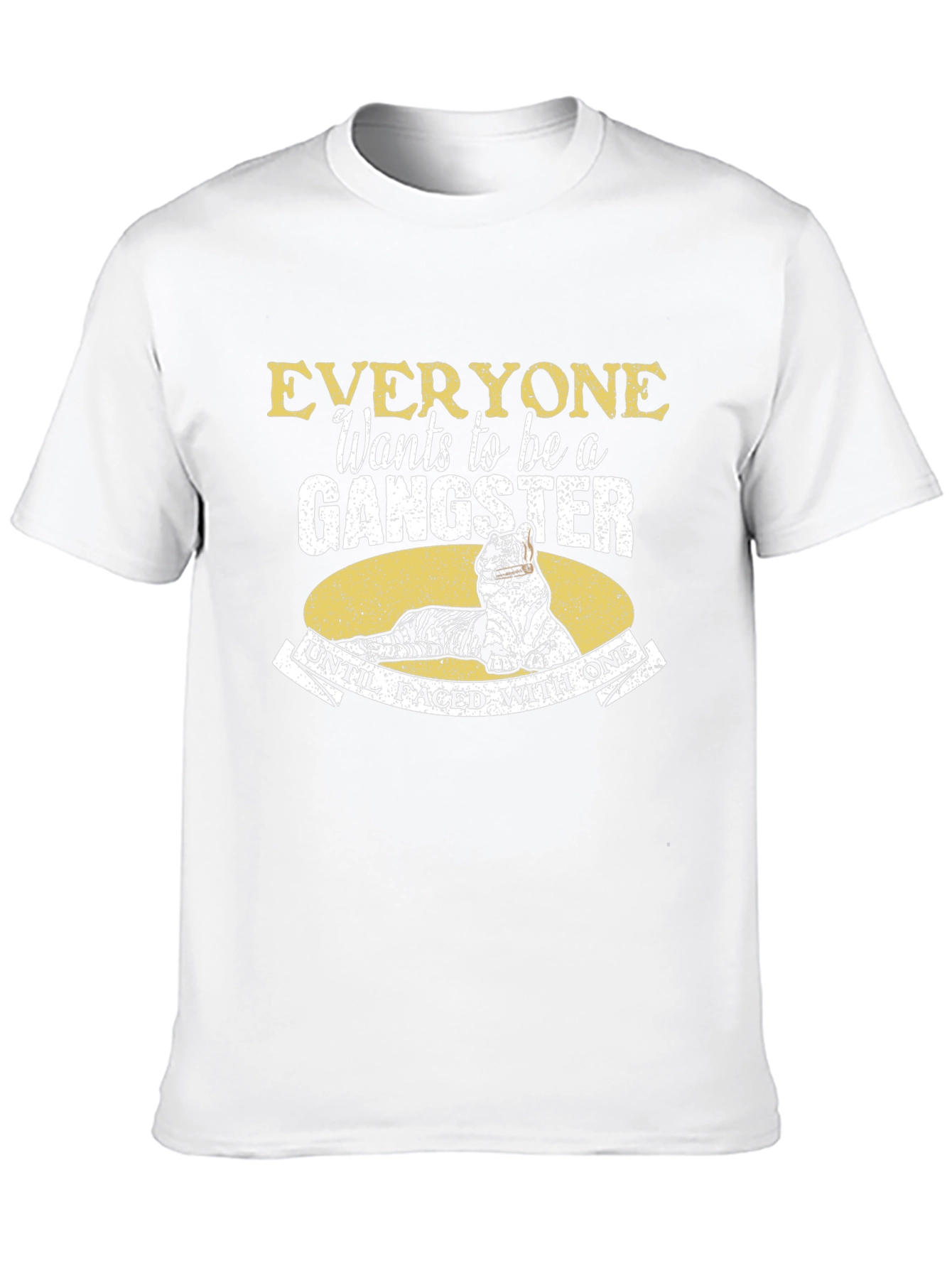 Show off your edgy side with this eye-catching black graphic tee. This shirt features a unique design with the phrase "Everyone wants to be a gangster until faced with one" surrounding a striking image of a tiger. The design has an aged vintage look, featuring off-white, gold, and black hues on the text and image. The high-quality print ensures durability and long-lasting wear. Made from a soft, breathable fabric, this tee offers both comfort and style. Ideal for casual outings, social gatherings, or making a statement, this gangster tiger tee is a must-have addition to any wardrobe. Perfect for those who love unique apparel.