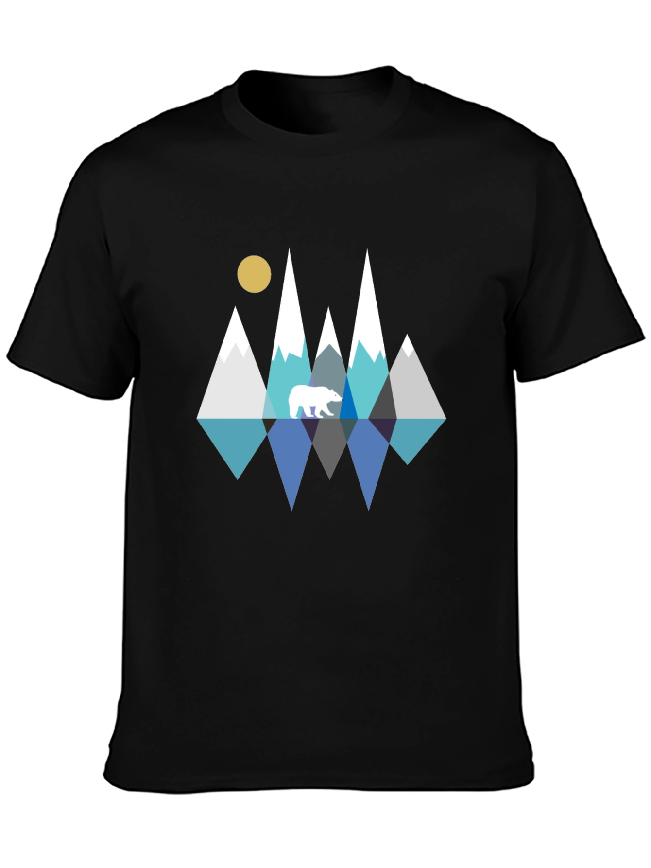 Show off your love for the great outdoors with this stylish black T-shirt. Featuring a unique geometric design of snow-capped mountains, a golden sun, and a silhouetted bear, this tee is a standout piece. The cool blue and gray tones of the mountain reflection create a serene, eye-catching visual. Made from a soft and comfortable material, this tee is perfect for casual wear or outdoor adventures. Pair it with jeans or shorts for a relaxed yet trendy look. A must-have for nature lovers and graphic tee enthusiasts!