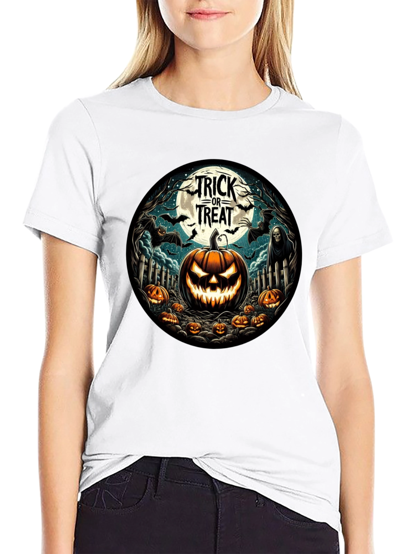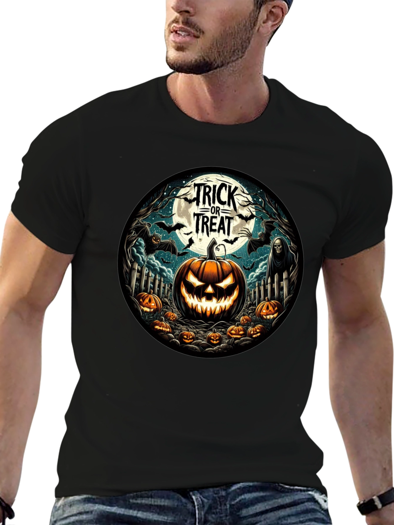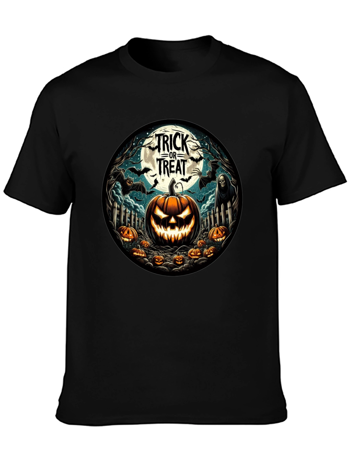 Get ready for spooky season with this eye-catching black T-shirt! Featuring a vivid graphic design, this tee showcases a Halloween-themed scene with a grinning jack-o'-lantern as the centerpiece. 'Trick or Treat' is emblazoned above the pumpkin. Bats are flying around a full moon. Other pumpkins and a graveyard complete the scene. Made from comfortable materials, this tee is perfect for Halloween parties, casual outings, or just showing off your love for the holiday. Make a statement and celebrate in style!