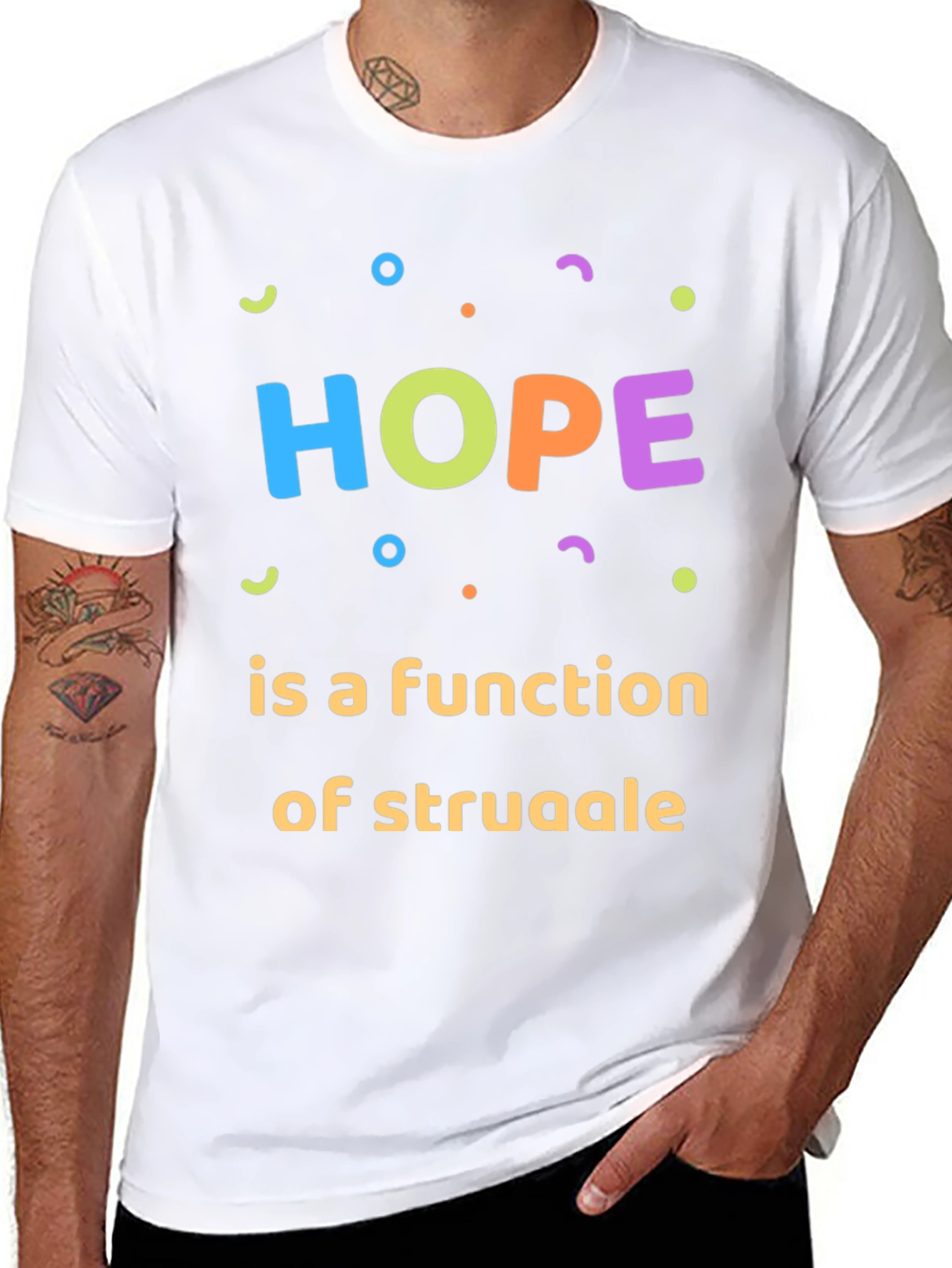 Embrace positivity with this stylish black graphic tee. The shirt features the word "HOPE" in a vibrant, multicolored design, surrounded by whimsical shapes. Below, the empowering phrase "is a function of struggle" is printed in a complementary font. This comfortable and eye-catching t-shirt is perfect for casual wear, making a statement about resilience and optimism. Made from soft, breathable fabric, it's ideal for everyday use. Whether you're running errands or meeting friends, this tee will keep you feeling inspired. The design's simple yet meaningful message makes it a great conversation starter and a reminder to stay hopeful.