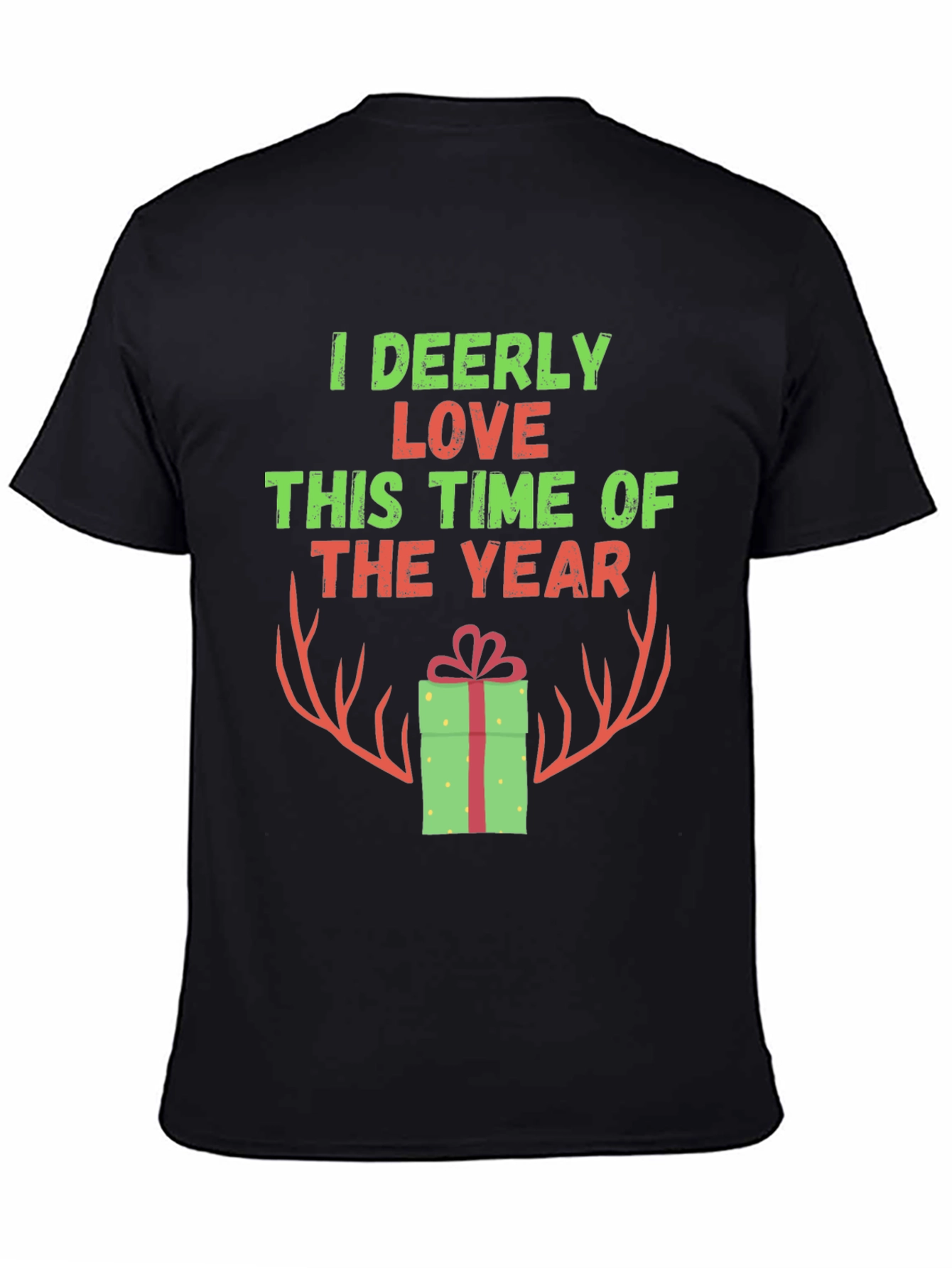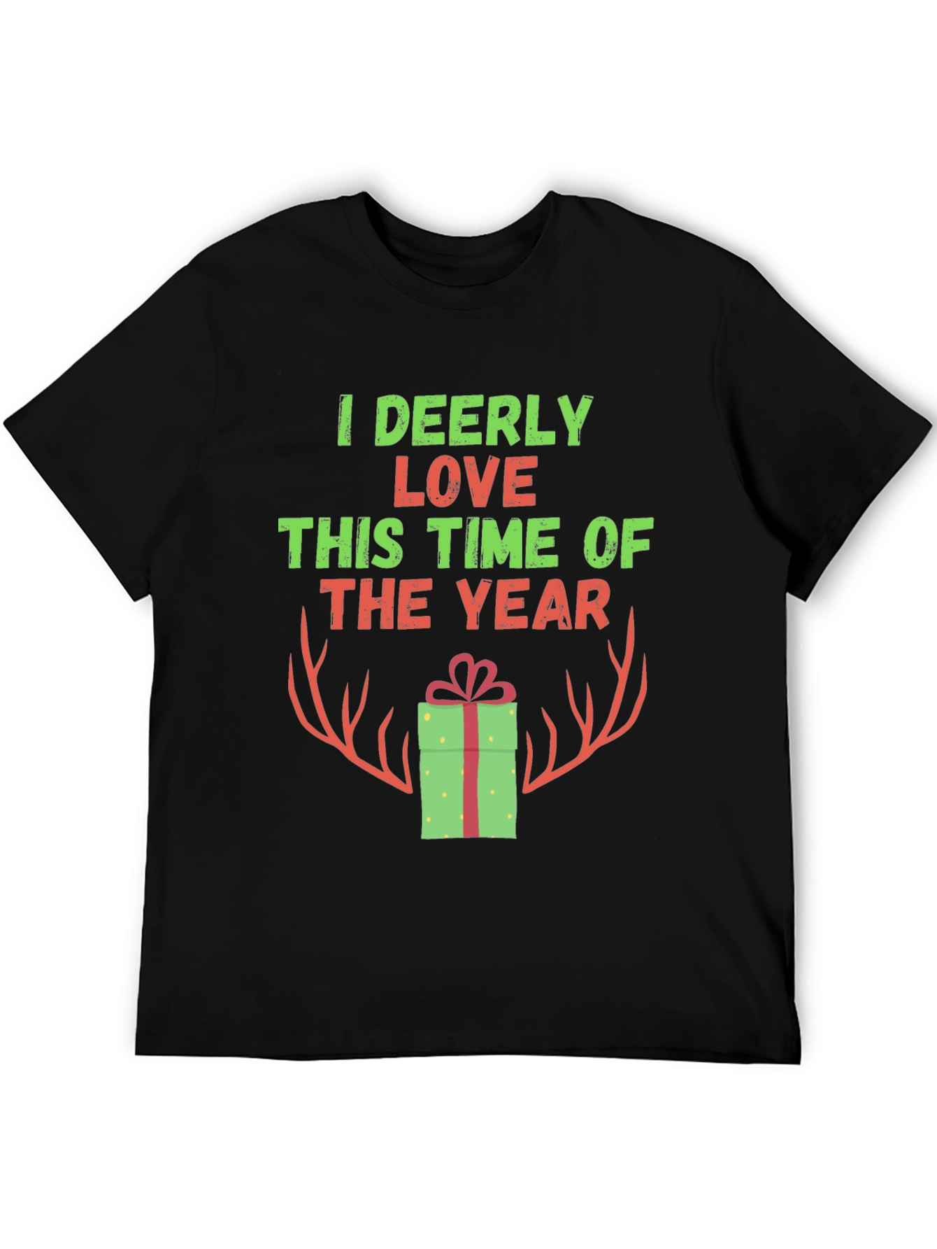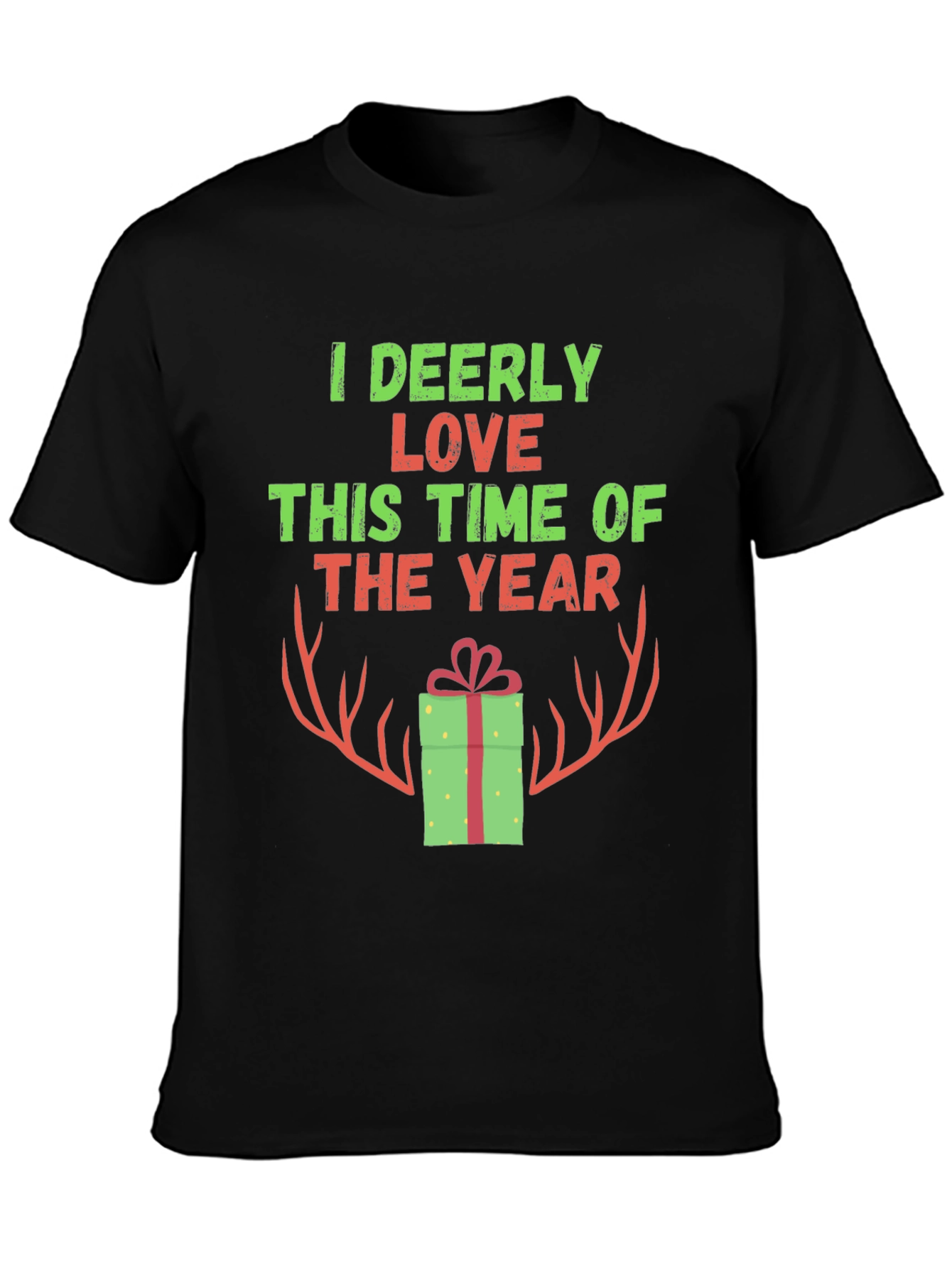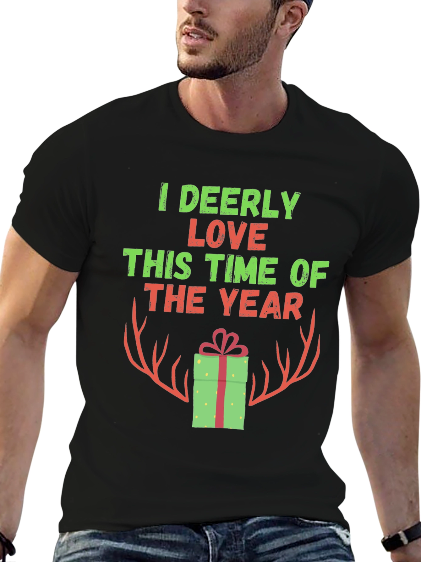 Get ready for the holiday season with this festive black t-shirt! The shirt features a playful "I Deerly Love This Time of Year" slogan in green and red. Below the text is an adorable graphic of a wrapped gift with antlers, making it a perfect shirt for Christmas lovers. This tee appears to be made of a soft, breathable material, ensuring comfort and style all day long. It's ideal for casual outings, holiday gatherings, or as a fun gift for friends and family. Spread holiday cheer with this unique and eye-catching t-shirt!