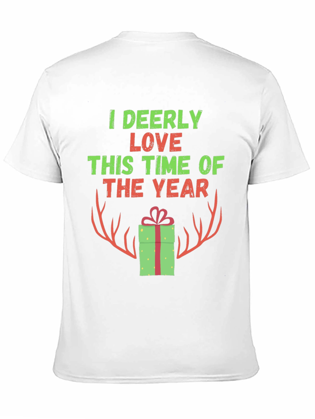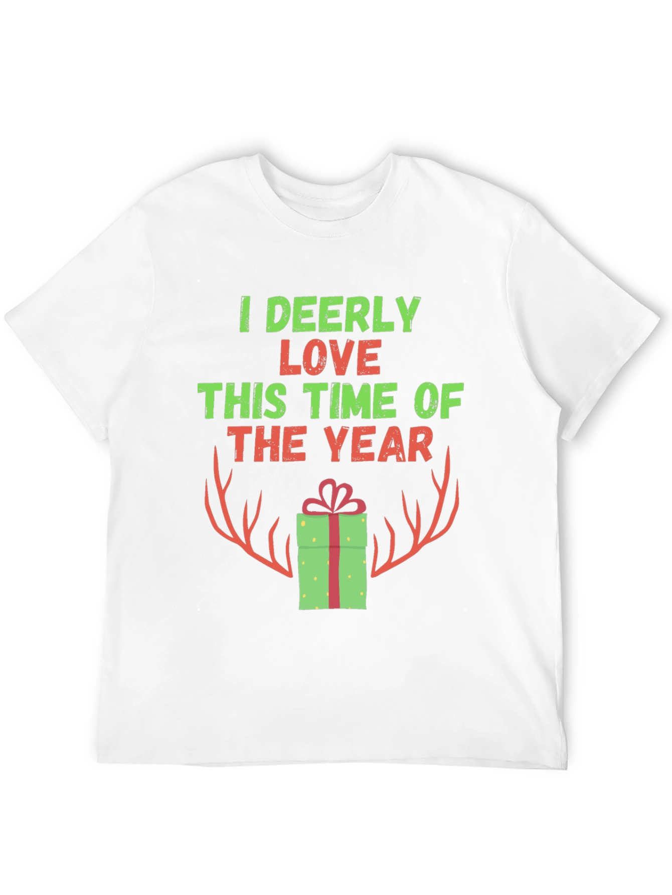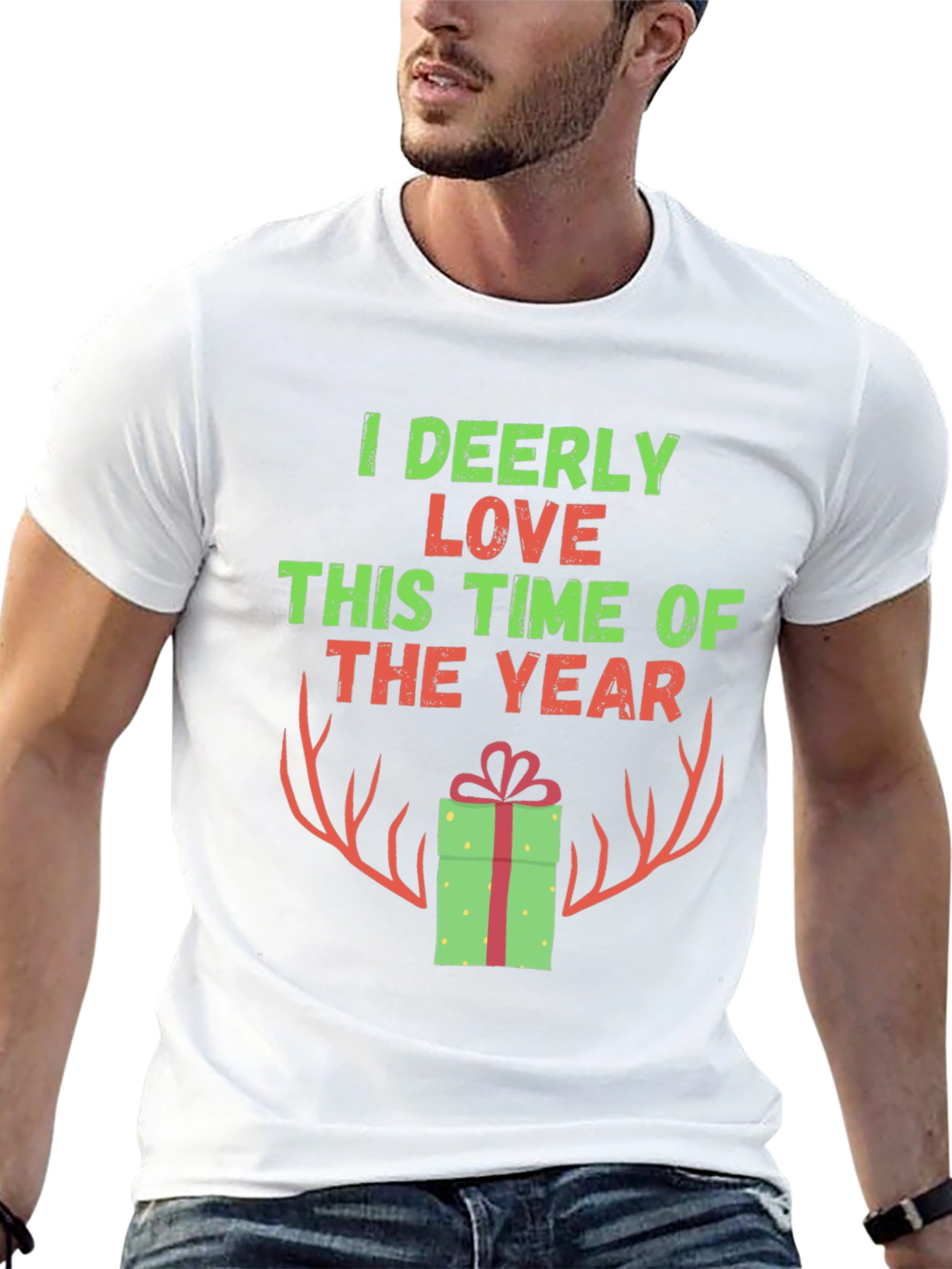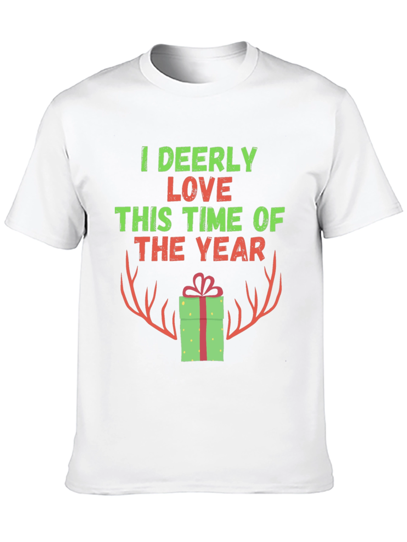 Get ready for the holiday season with this festive black t-shirt! The shirt features a playful "I Deerly Love This Time of Year" slogan in green and red. Below the text is an adorable graphic of a wrapped gift with antlers, making it a perfect shirt for Christmas lovers. This tee appears to be made of a soft, breathable material, ensuring comfort and style all day long. It's ideal for casual outings, holiday gatherings, or as a fun gift for friends and family. Spread holiday cheer with this unique and eye-catching t-shirt!