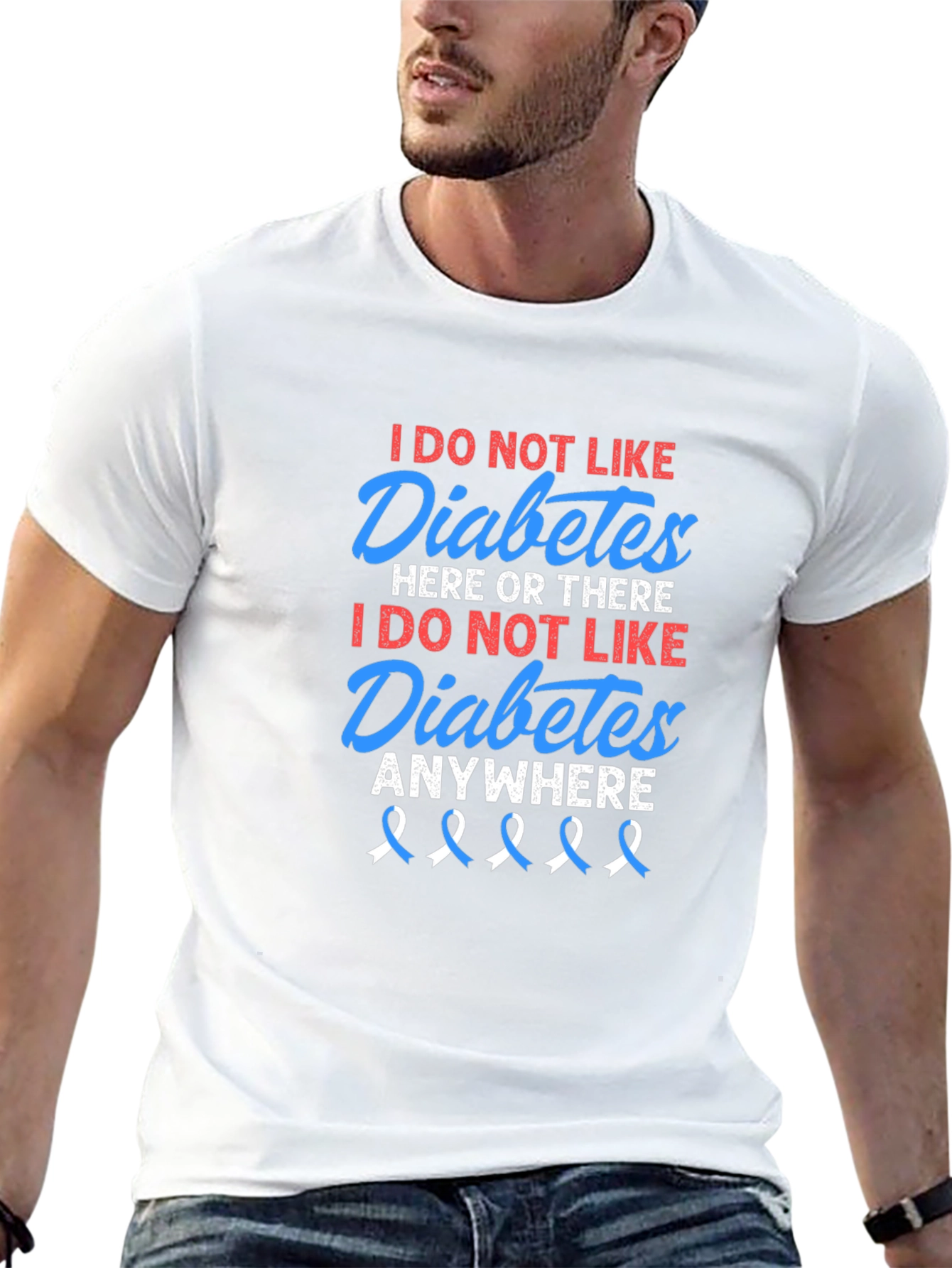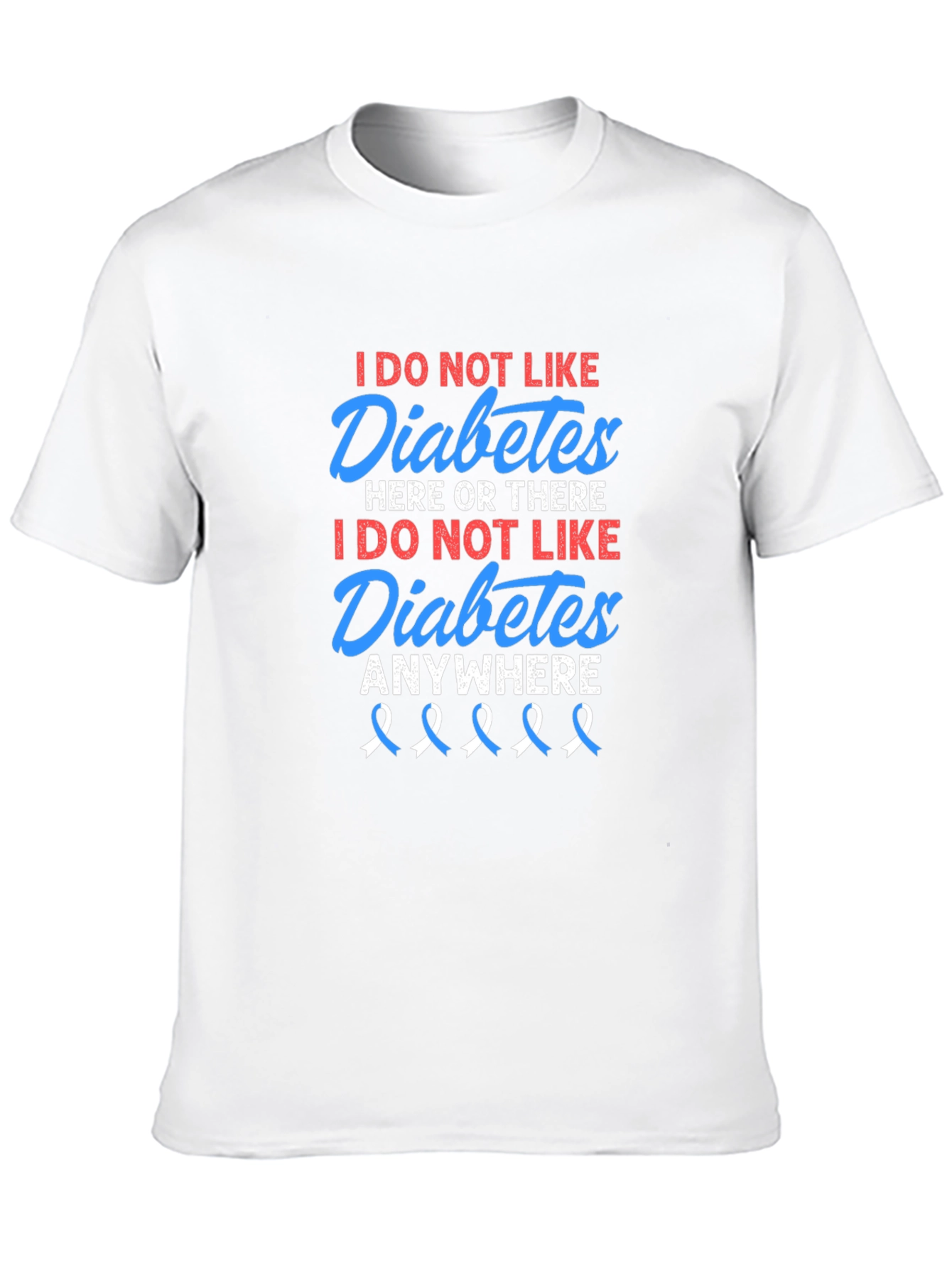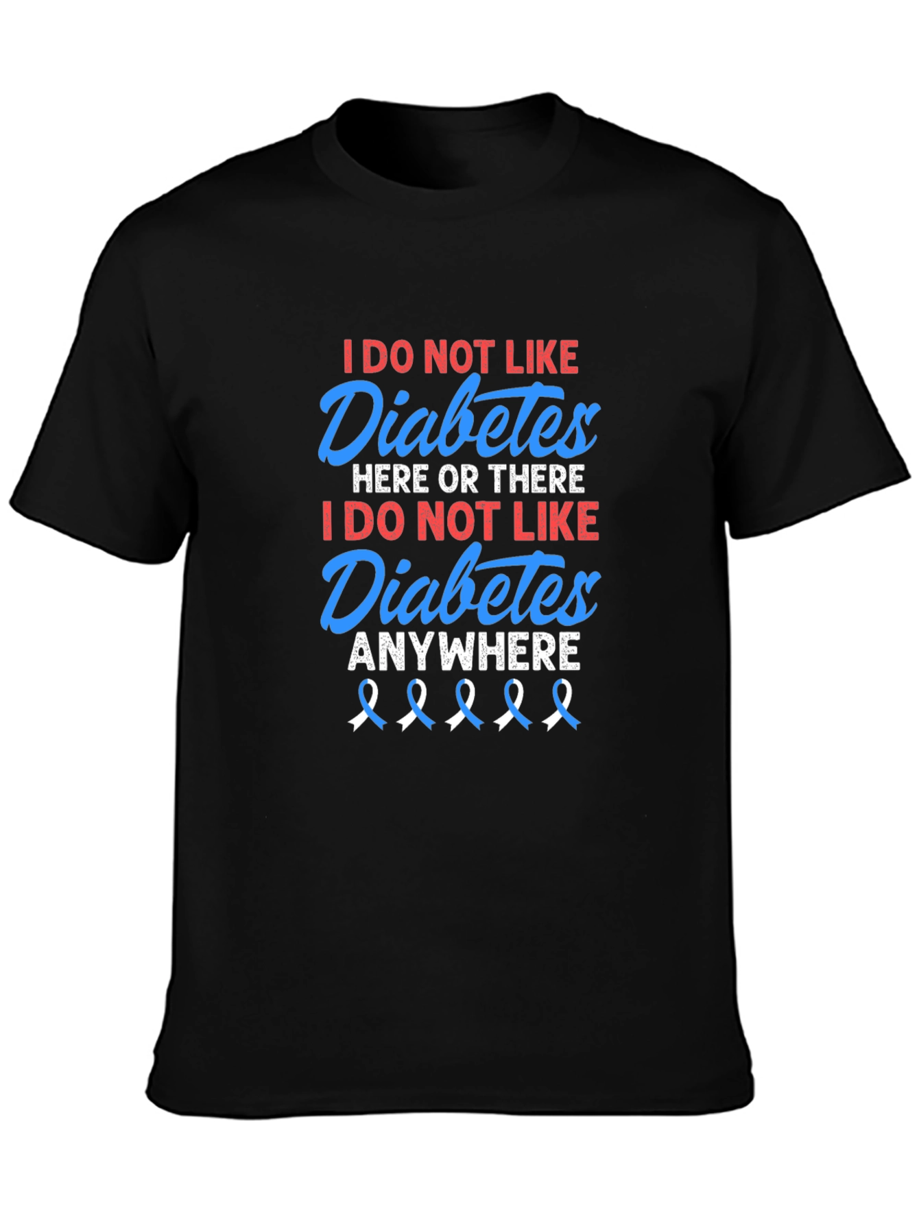 Show your support with this striking black T-shirt. The design features the witty phrase "I DO NOT LIKE Diabetes HERE OR THERE I DO NOT LIKE Diabetes ANYWHERE", making a statement of solidarity. Below the message are five awareness ribbons in blue and white, symbolizing diabetes awareness. This T-shirt is perfect for raising awareness, supporting a cause, or simply expressing your feelings in a lighthearted way. Made from comfortable fabric, it's suitable for everyday wear and various occasions. A meaningful and stylish addition to your wardrobe!