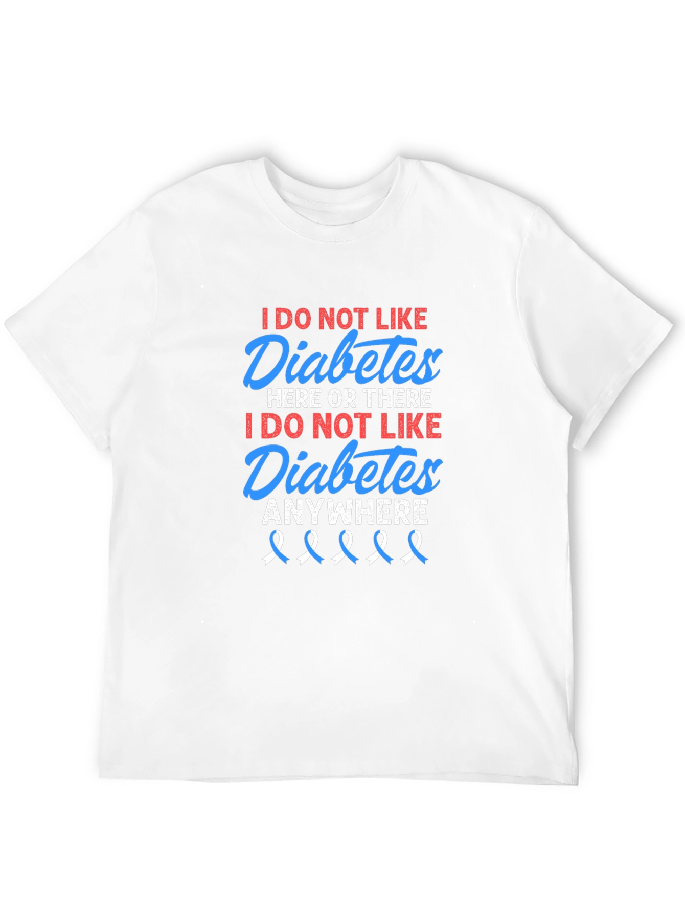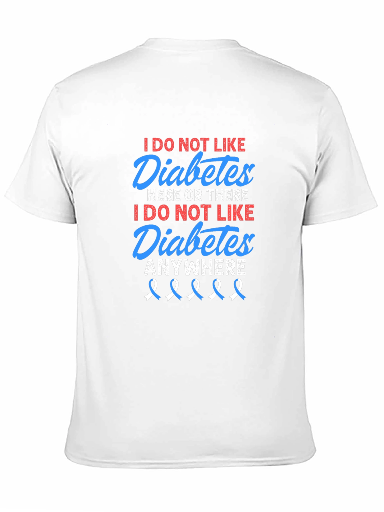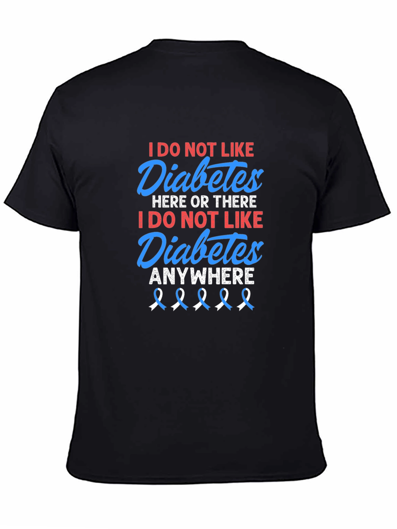Show your support with this striking black T-shirt. The design features the witty phrase "I DO NOT LIKE Diabetes HERE OR THERE I DO NOT LIKE Diabetes ANYWHERE", making a statement of solidarity. Below the message are five awareness ribbons in blue and white, symbolizing diabetes awareness. This T-shirt is perfect for raising awareness, supporting a cause, or simply expressing your feelings in a lighthearted way. Made from comfortable fabric, it's suitable for everyday wear and various occasions. A meaningful and stylish addition to your wardrobe!