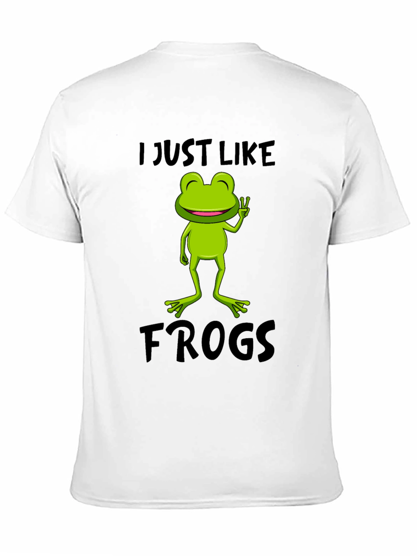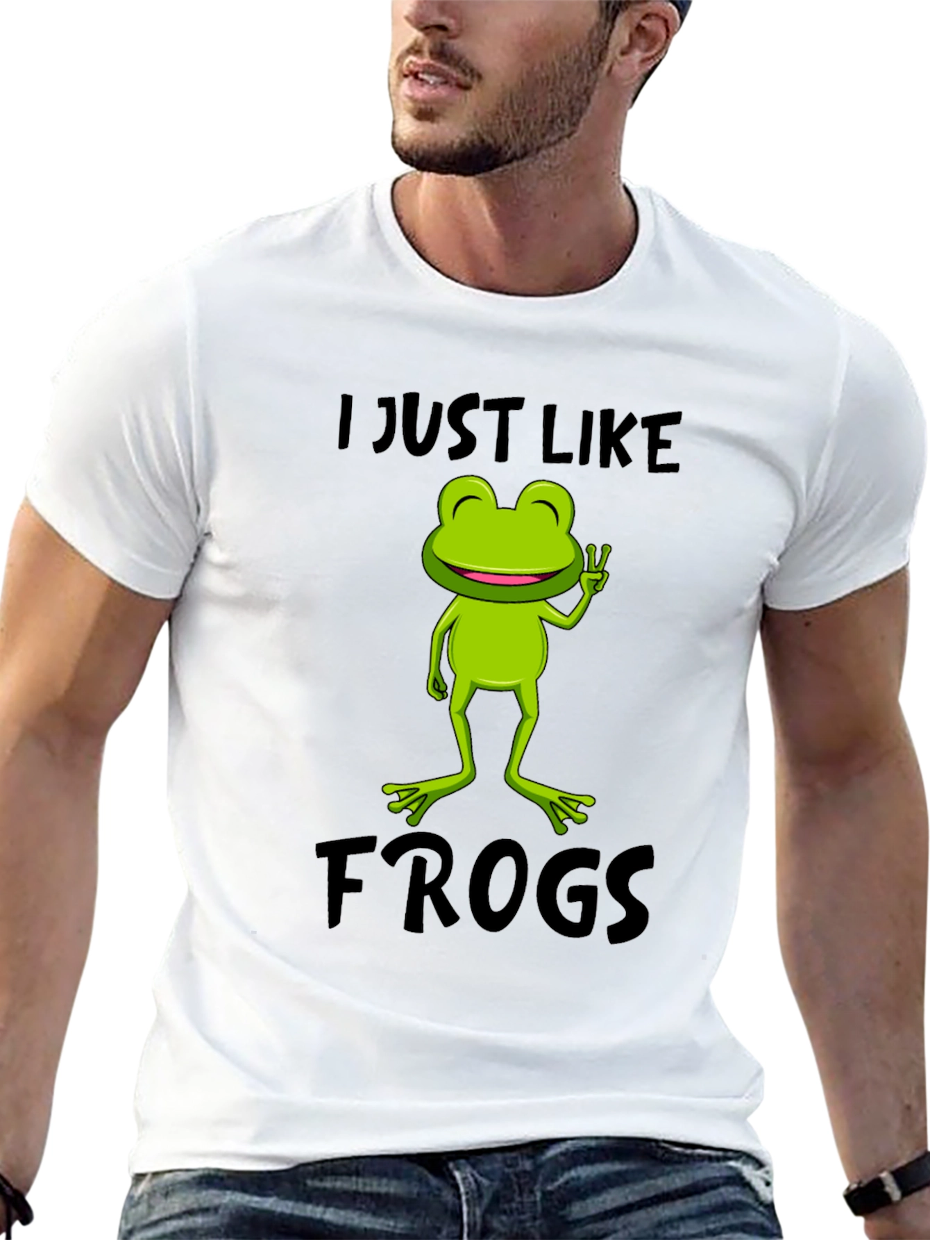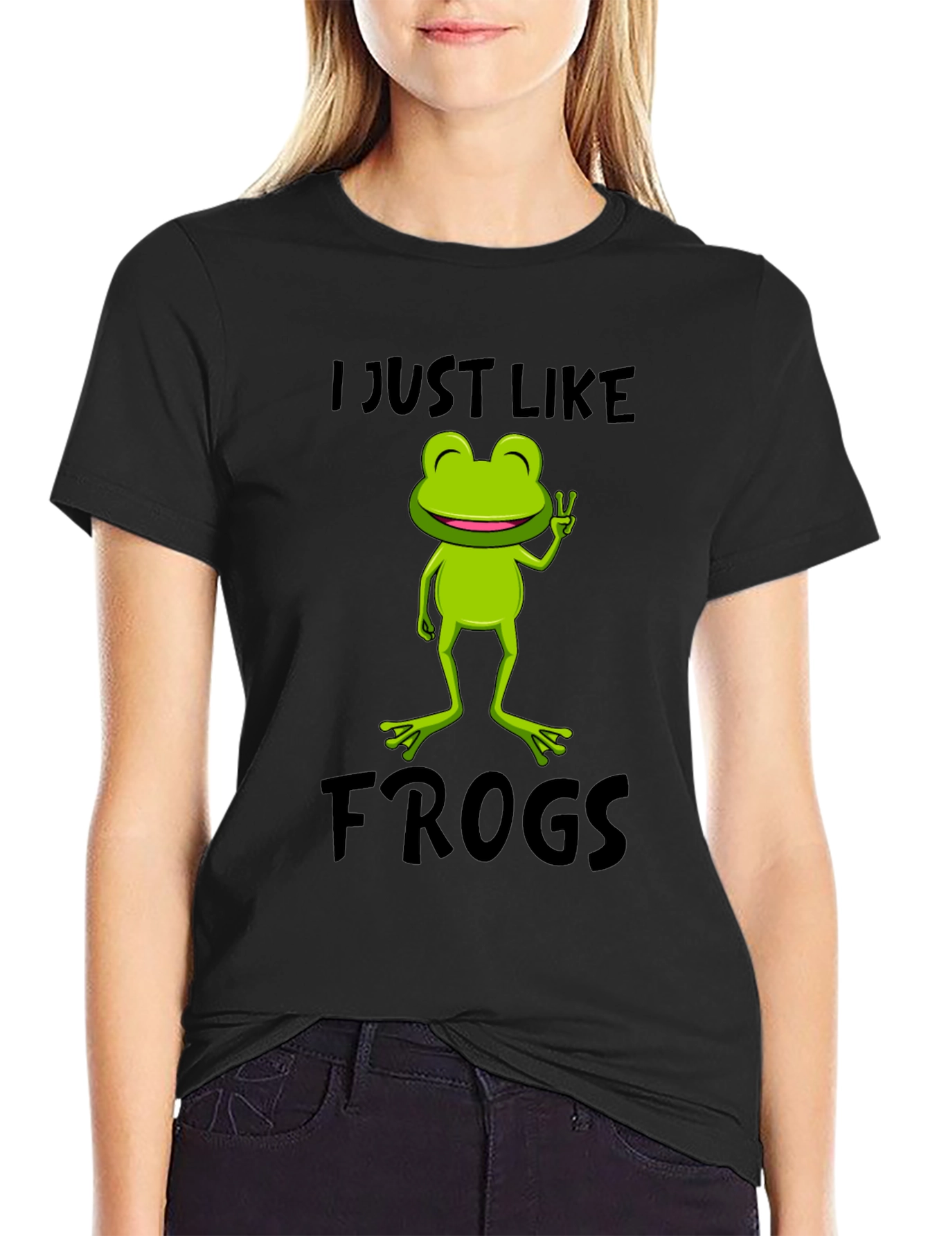 This classic black t-shirt features a playful "I JUST LIKE FROGS" graphic. The design showcases a cheerful cartoon frog giving a peace sign. Made from what appears to be a soft and comfortable cotton blend, this tee is perfect for everyday wear. Its casual style makes it ideal for pairing with jeans, shorts, or even layering under a jacket. Show off your love for amphibians with this fun and quirky shirt. A great conversation starter, it's sure to bring a smile to anyone's face. Express your unique personality and passion for frogs with this must-have addition to your wardrobe!