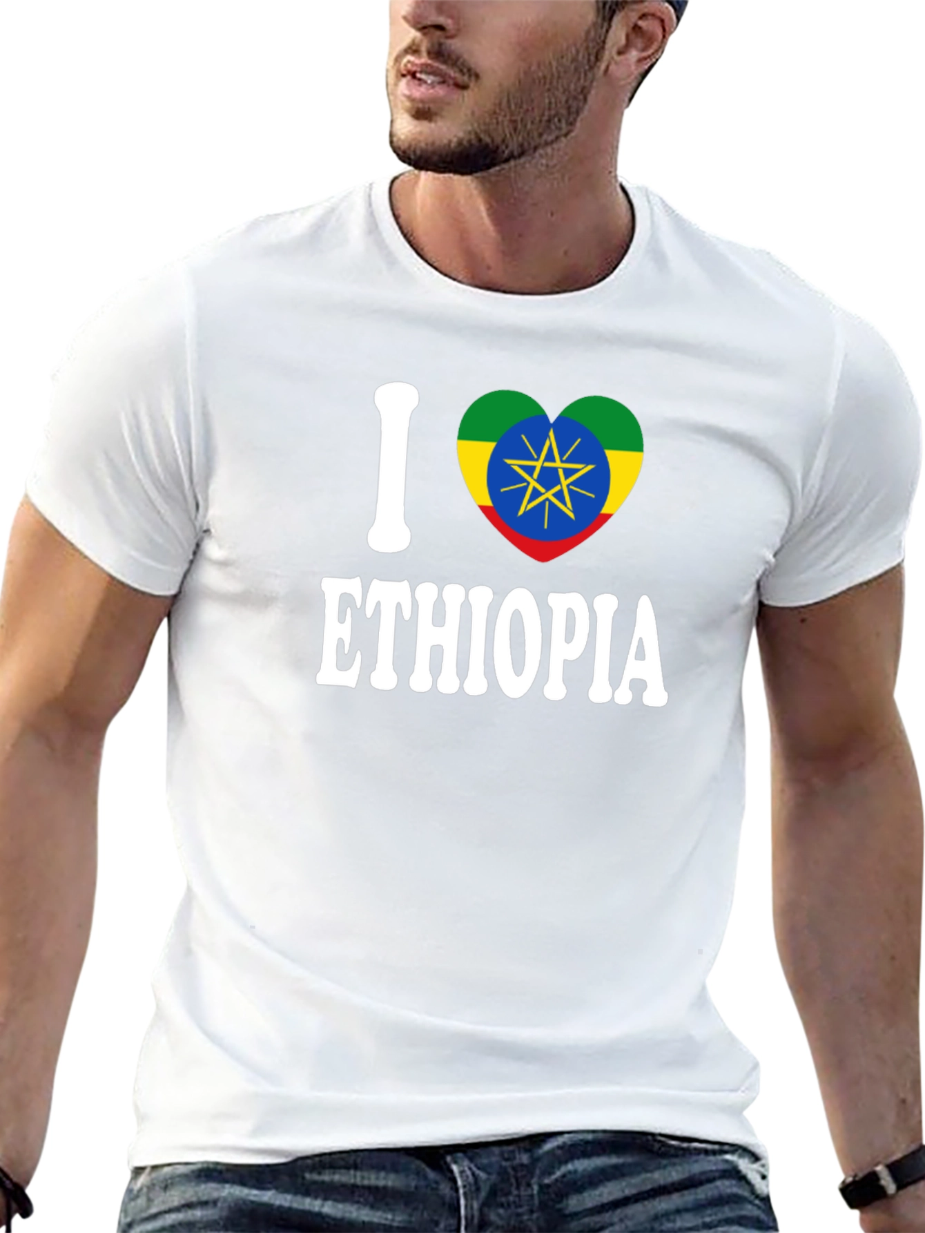 Show your love for Ethiopia with this eye-catching black t-shirt! Featuring a vibrant "I" graphic paired with a heart showcasing the Ethiopian flag, this shirt is a stylish way to display your pride. The bold white "ETHIOPIA" text ensures the message is clear. Made from a comfortable-looking material, it's perfect for everyday wear, cultural events, or as a unique gift. Stand out and celebrate your heritage with this striking and expressive tee. A must-have for anyone connected to Ethiopia!