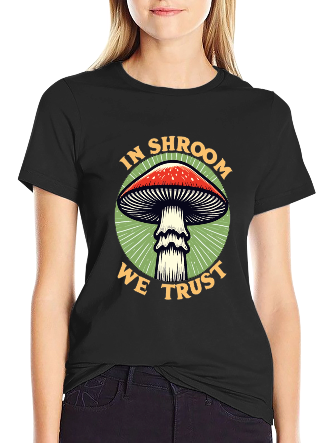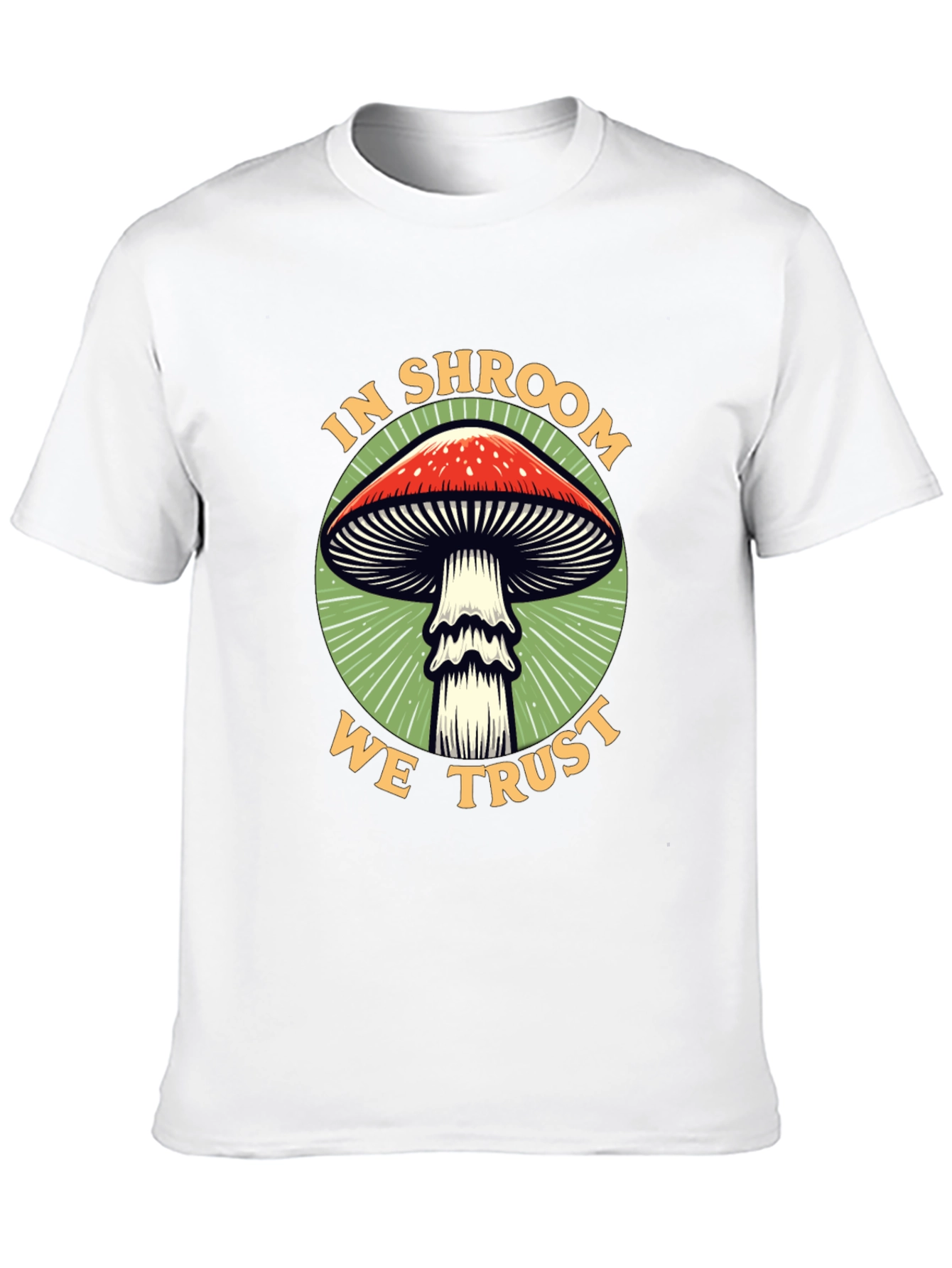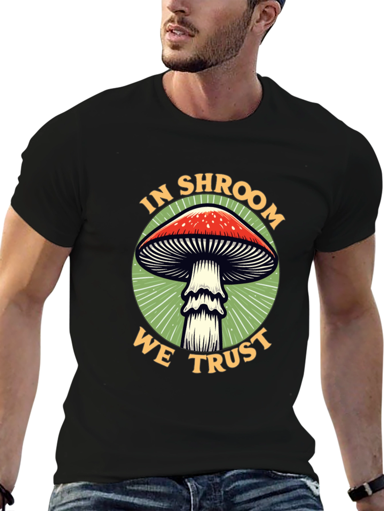 Embrace your love for all things fungi with this eye-catching graphic tee. The black t-shirt features a bold design of a classic red-capped mushroom encircled by the phrase "In Shroom We Trust." The design is set against a vibrant green backdrop, making the colors pop. Crafted from a comfortable, breathable fabric, this tee is perfect for everyday wear. Whether you're a mycologist at heart or simply appreciate unique graphic designs, this t-shirt is sure to turn heads. Dress it up or down – it's versatile enough for any casual occasion.