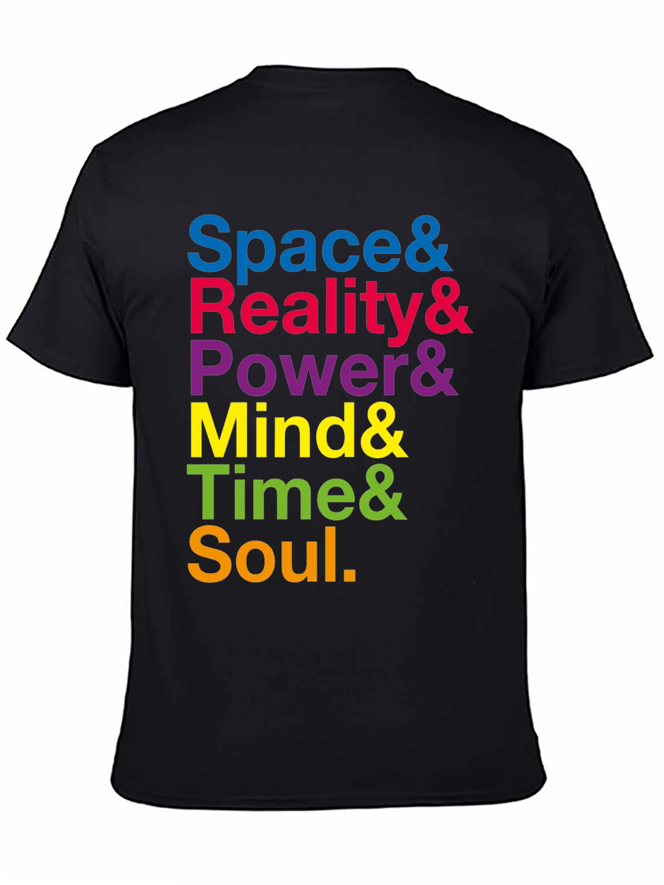 Show off your love for the cosmos with this eye-catching black t-shirt. Featuring a vibrant, colorful design listing the Infinity Stones: Space, Reality, Power, Mind, Time, and Soul. The bright colors make the design pop, while the black backdrop makes it versatile enough to wear with anything. This unique tee is perfect for fans of the Marvel universe. Wear it to conventions, casual outings, or while relaxing at home. Durable, soft, and ready for any adventure, this shirt is a must-have for anyone looking to express their passion in style.